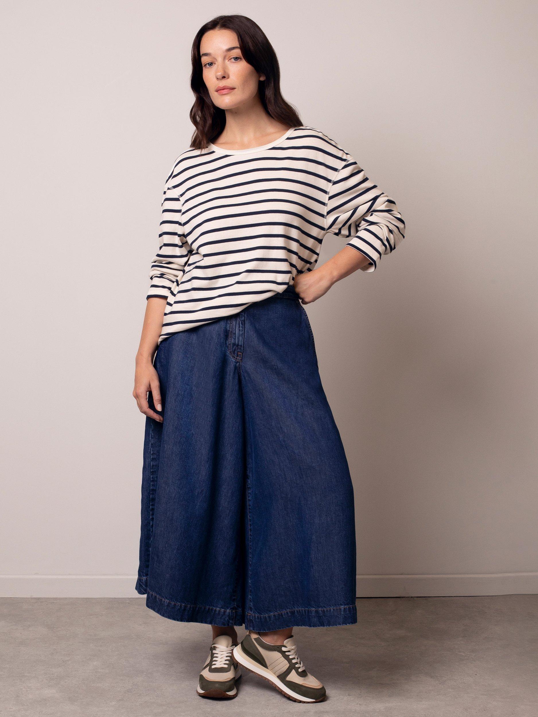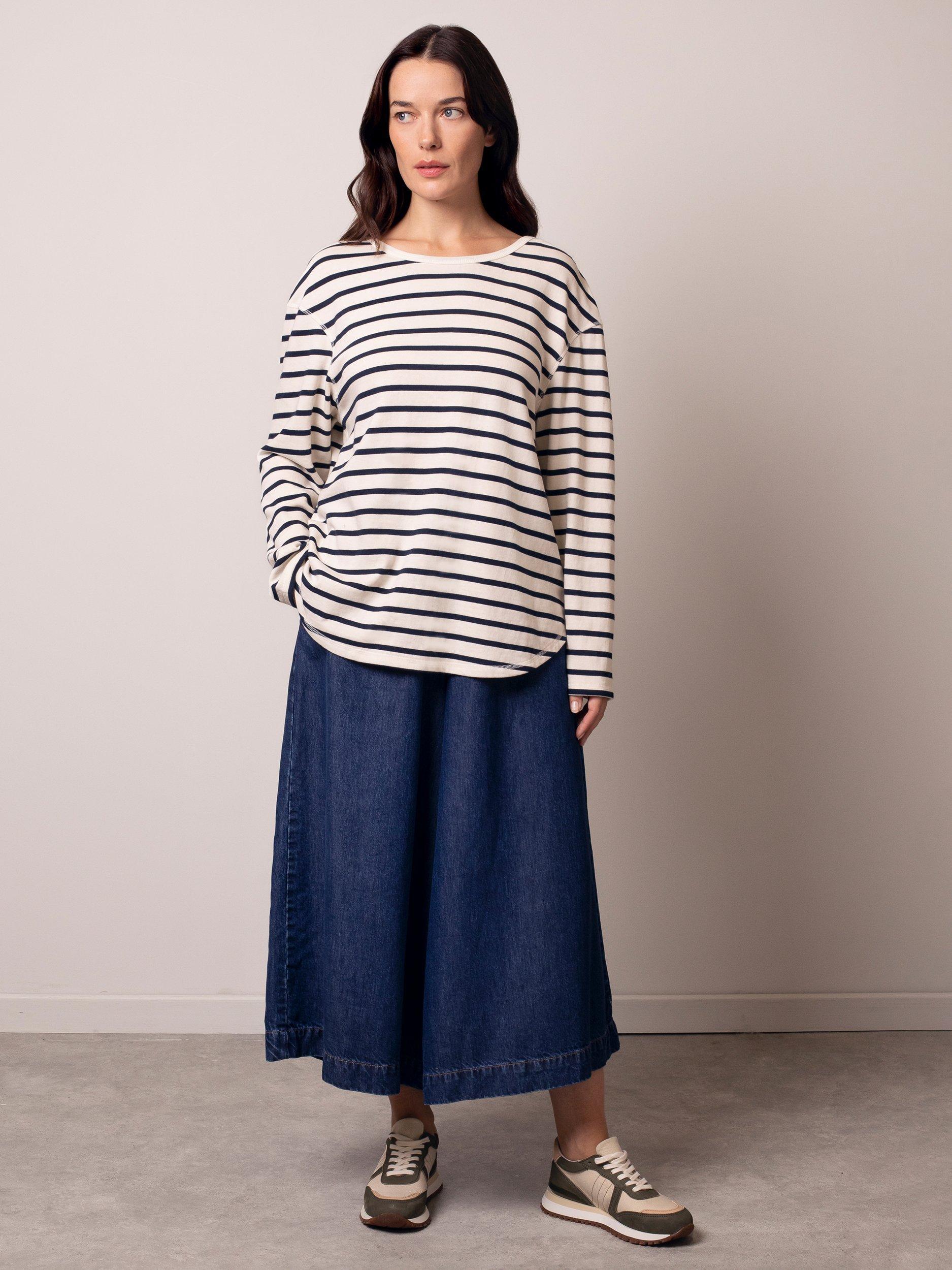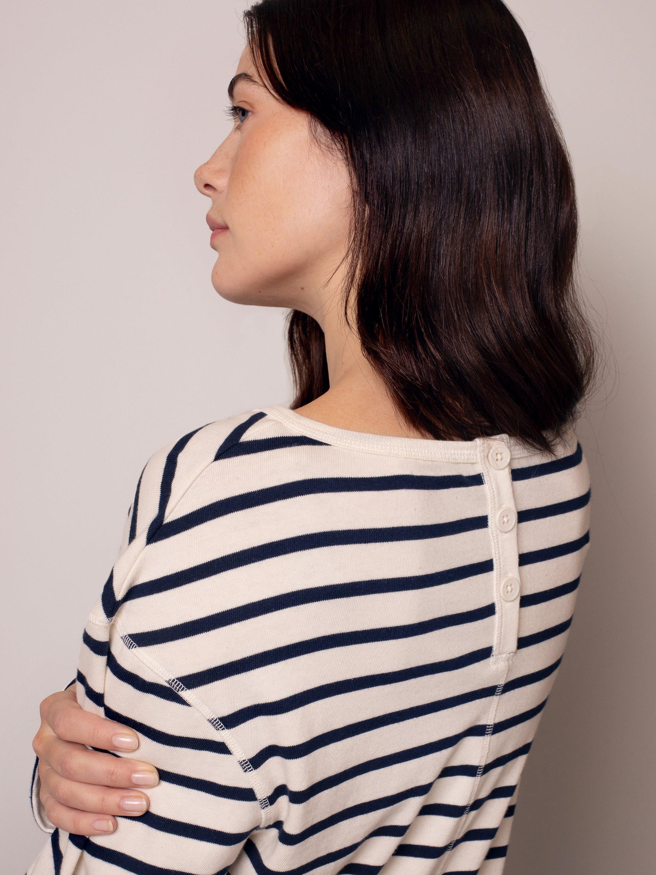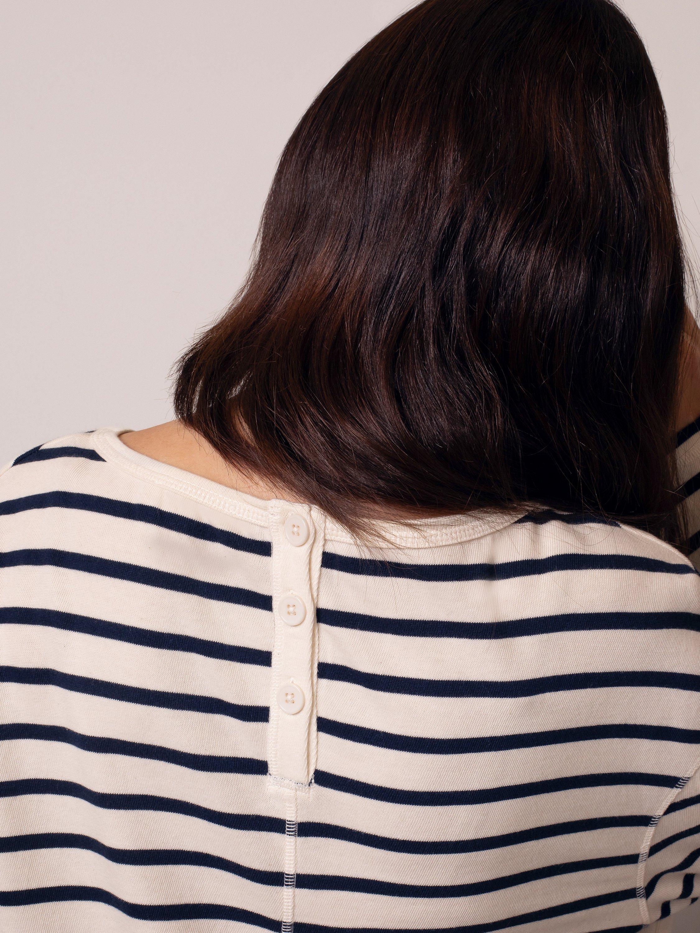 This heavyweight jersey top features a classic Breton stripe design in yarn-dyed fabric, ensuring lasting colour and texture. With long sleeves and a relaxed fit, it offers comfortable wear, while the button back fastening adds a subtle detail to this timeless piece.