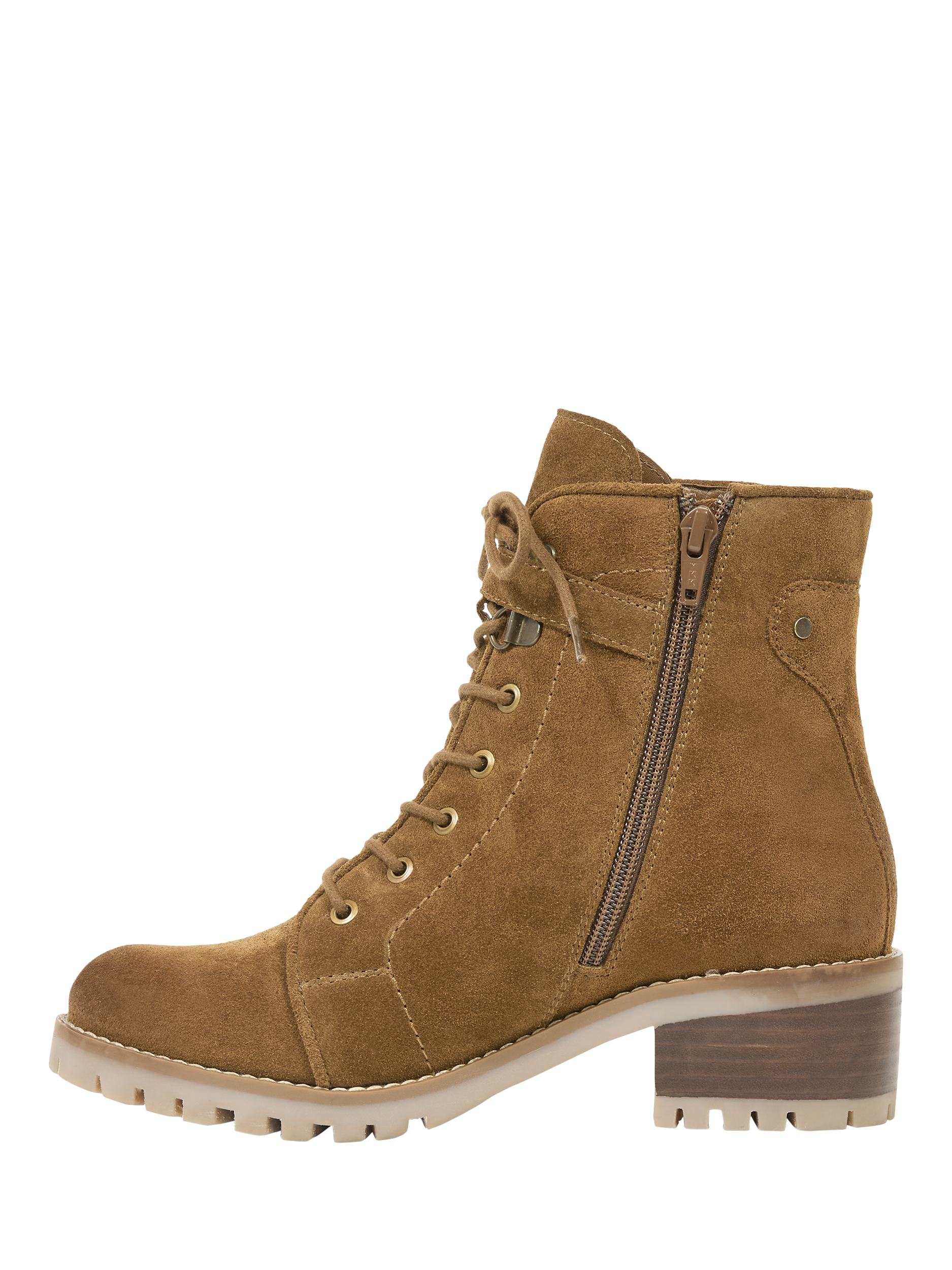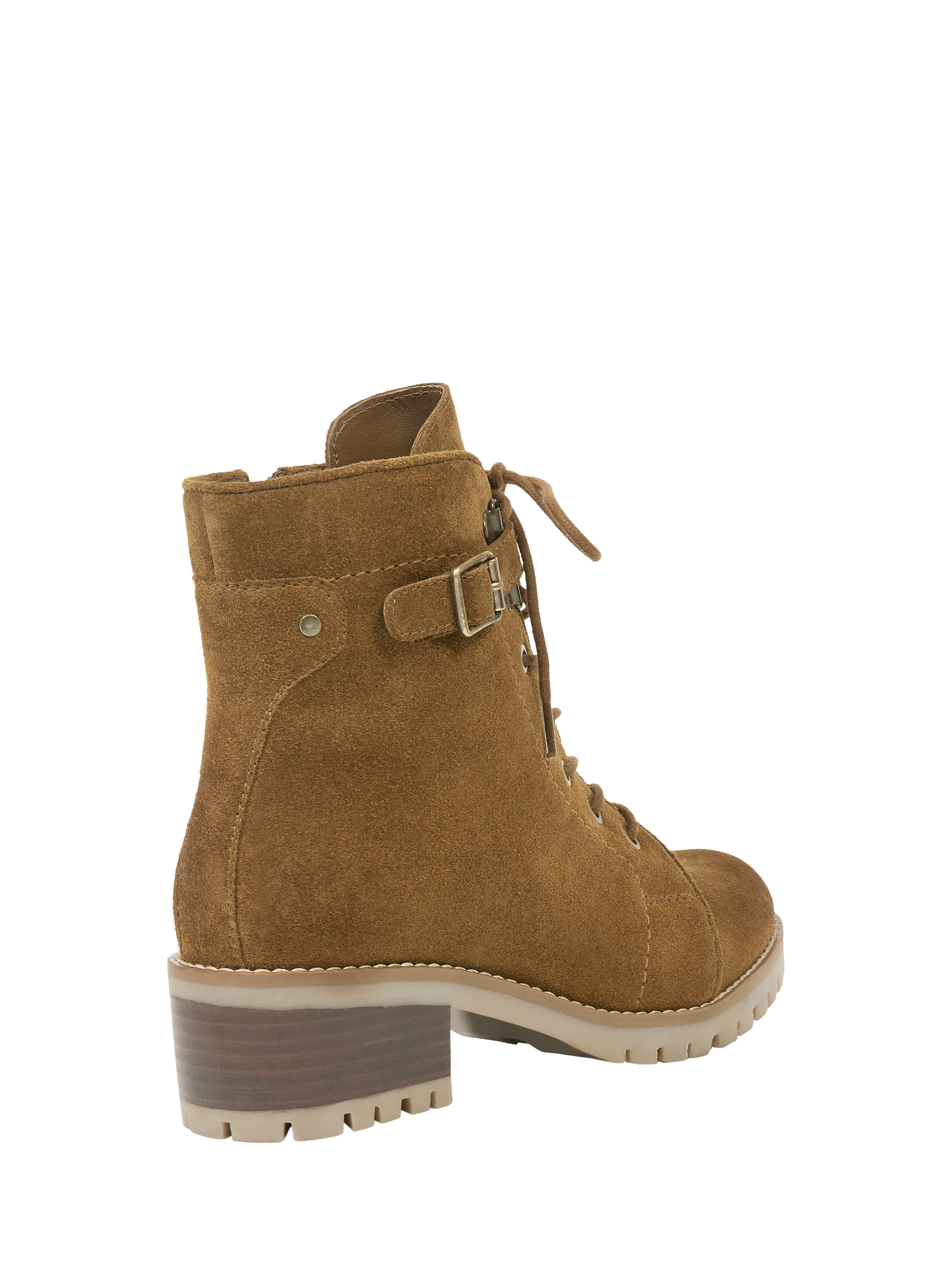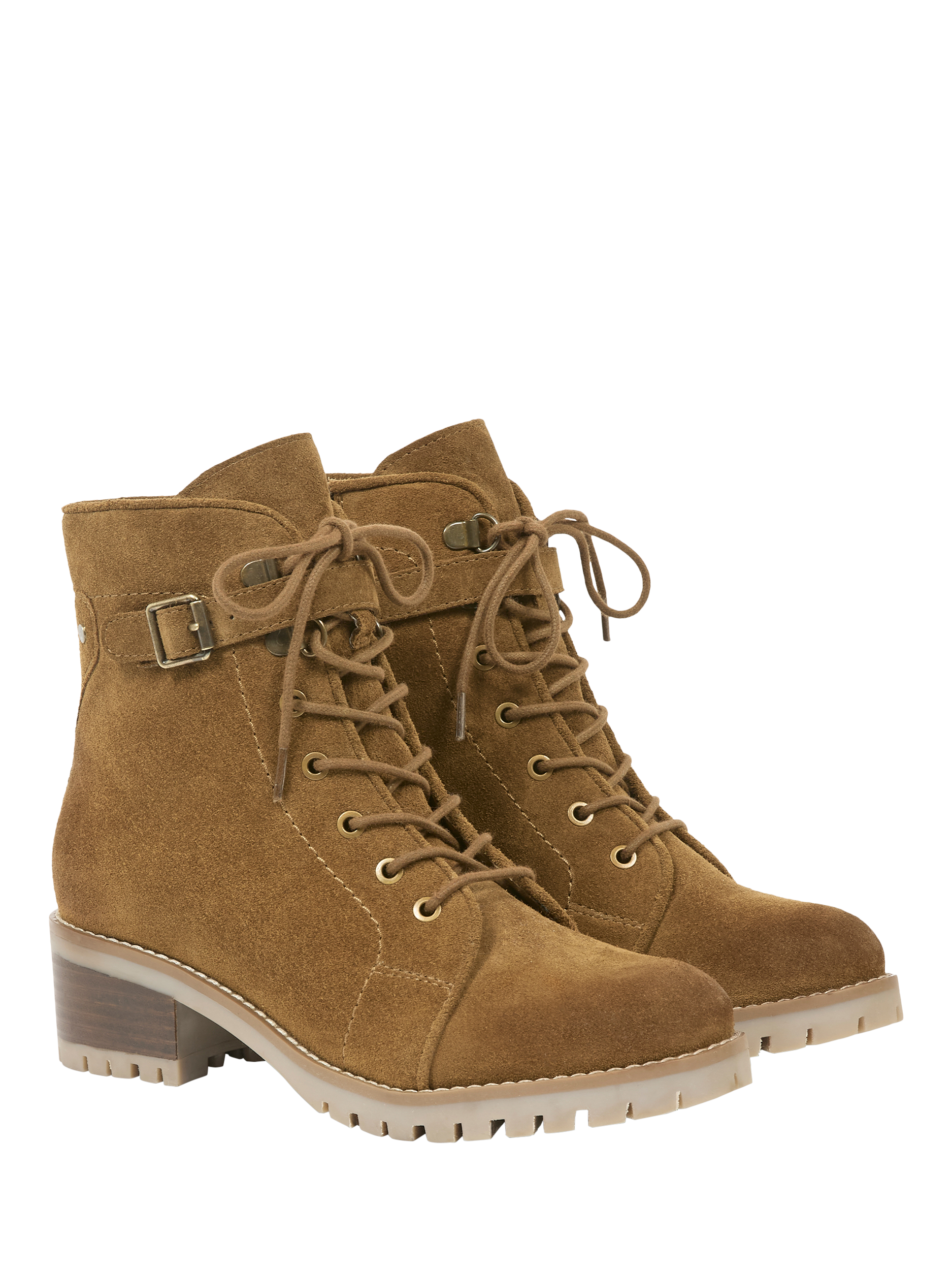 These hiker boots feature a suede upper with lace-up and buckle and strap detailing. They include a block heel with leather inlay, along with a leather lining and zipped opening functionality.