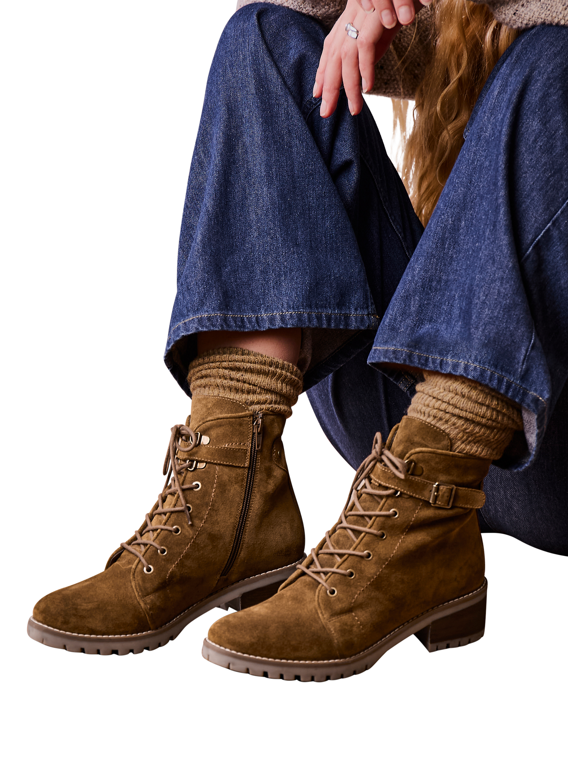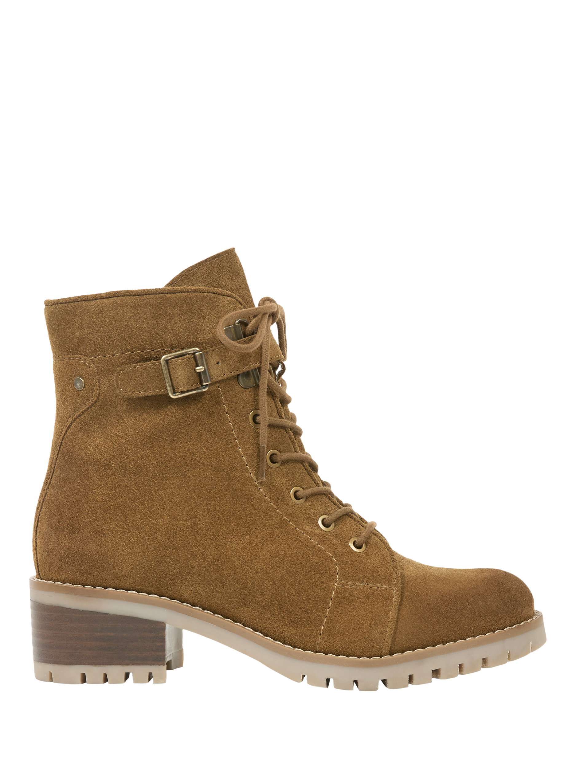 These hiker boots feature a suede upper with lace-up and buckle and strap detailing. They include a block heel with leather inlay, along with a leather lining and zipped opening functionality.