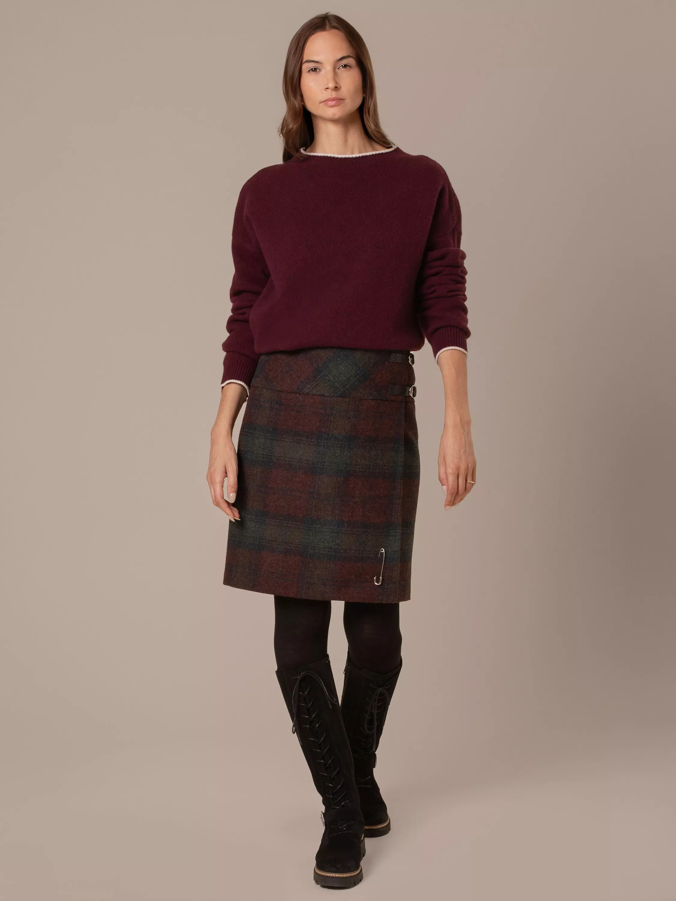 The Celt kilt presents a traditional style with a modern shape, allowing you to work a little Scottish charm into your look with contemporary influences. Meticulously crafted for Celtic & Co. by one of the last remaining traditional manufacturers in Scotland (who still produces kilts for the Royal Regiment of Scotland), this kilt is trimmed with twin leather straps which are supplemented by riptape for easy dressing and an adjustable fit around the waist. Full lining adds silky glide against the skin for extra comfort. Position the kilt pin at the bottom right-hand side of the kilt, around 2-4 inches from the bottom and 1.5 inches from the edge. You'll earn Celtic heritage points and the front flap will stay neatly in place.