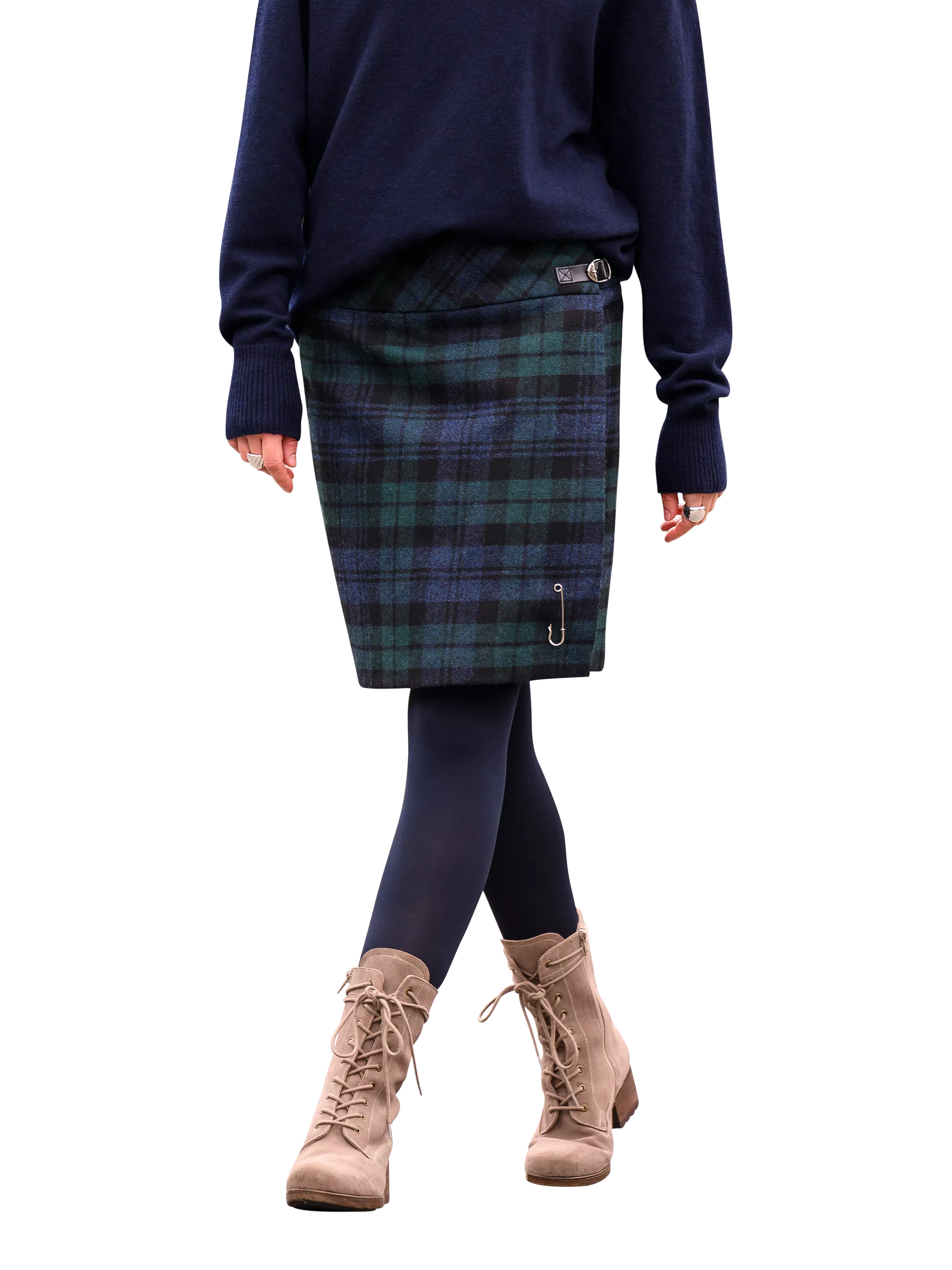 The Celt kilt presents a traditional style with a modern shape, allowing you to work a little Scottish charm into your look with contemporary influences. Meticulously crafted for Celtic & Co. by one of the last remaining traditional manufacturers in Scotland (who still produces kilts for the Royal Regiment of Scotland), this kilt is trimmed with twin leather straps which are supplemented by riptape for easy dressing and an adjustable fit around the waist. Full lining adds silky glide against the skin for extra comfort. Position the kilt pin at the bottom right-hand side of the kilt, around 2-4 inches from the bottom and 1.5 inches from the edge. You'll earn Celtic heritage points and the front flap will stay neatly in place.