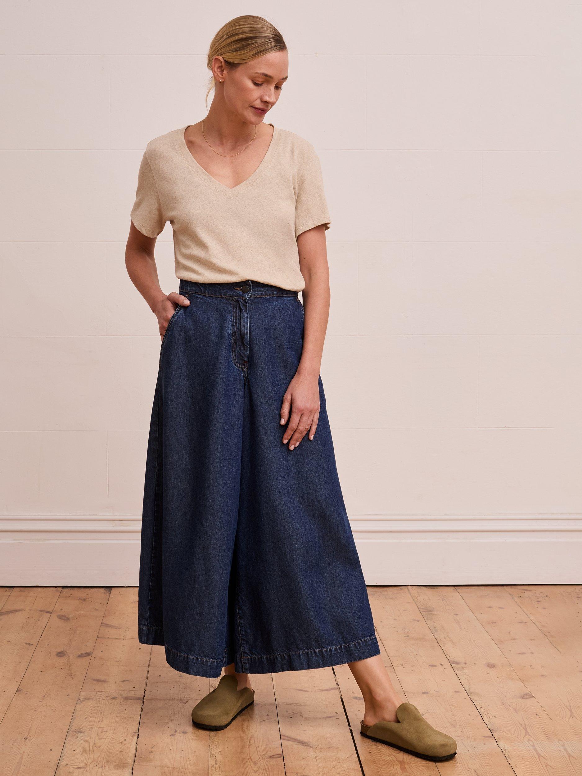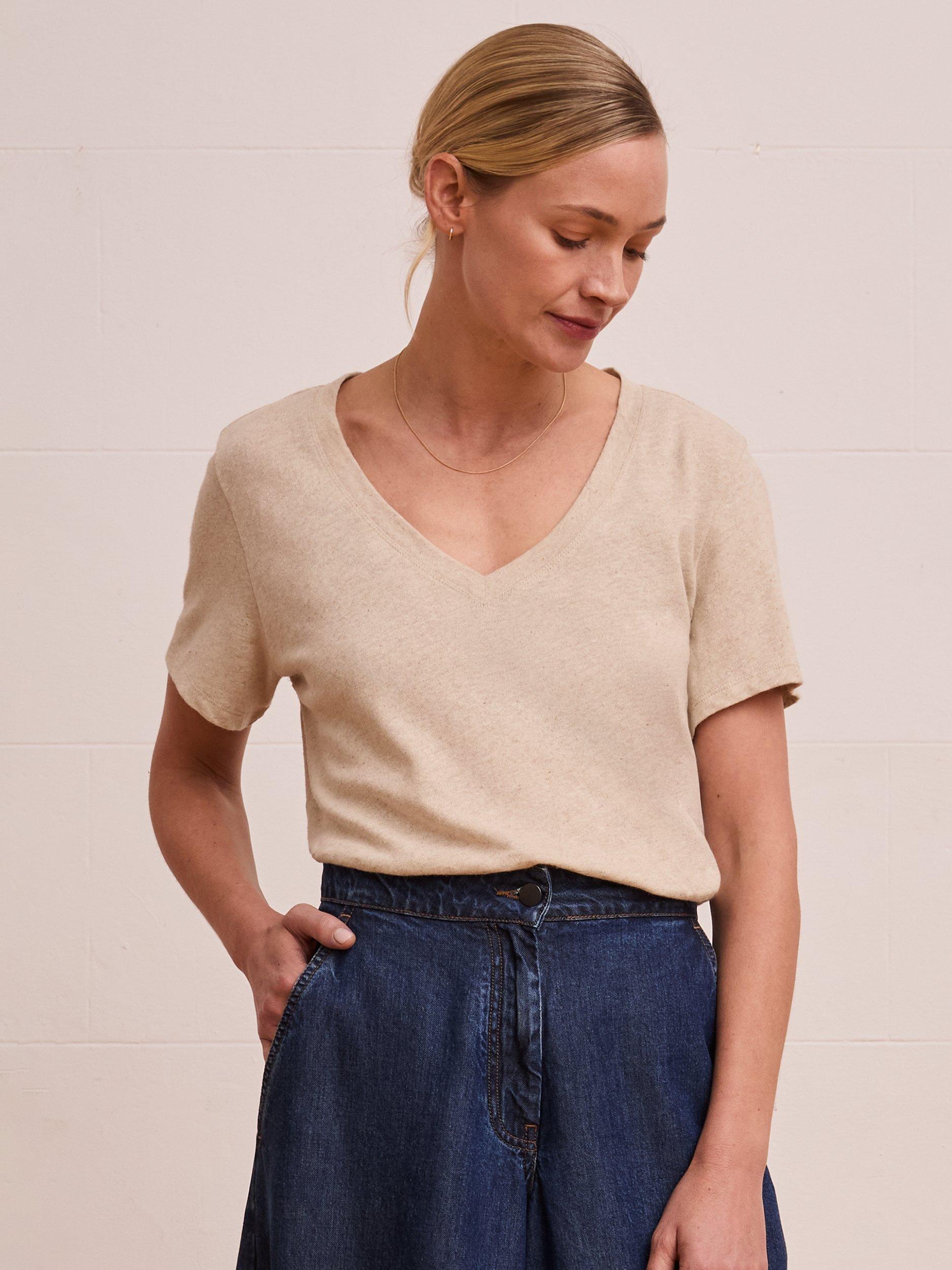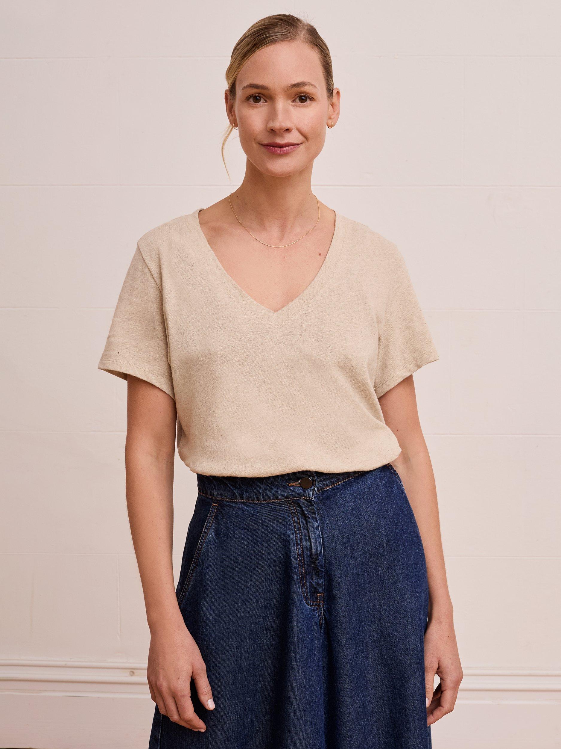 Effortless style meets comfort in this Linen Blend V Neck T-Shirt. Made from a classic linen and cotton blend jersey, it features a beautiful textured slub in the fabric. With an elegant V neckline and set-in short sleeves, it offers an easy fit for your daily wear. Whether you're dressing up or down, this T-shirt is a timeless addition to your wardrobe.