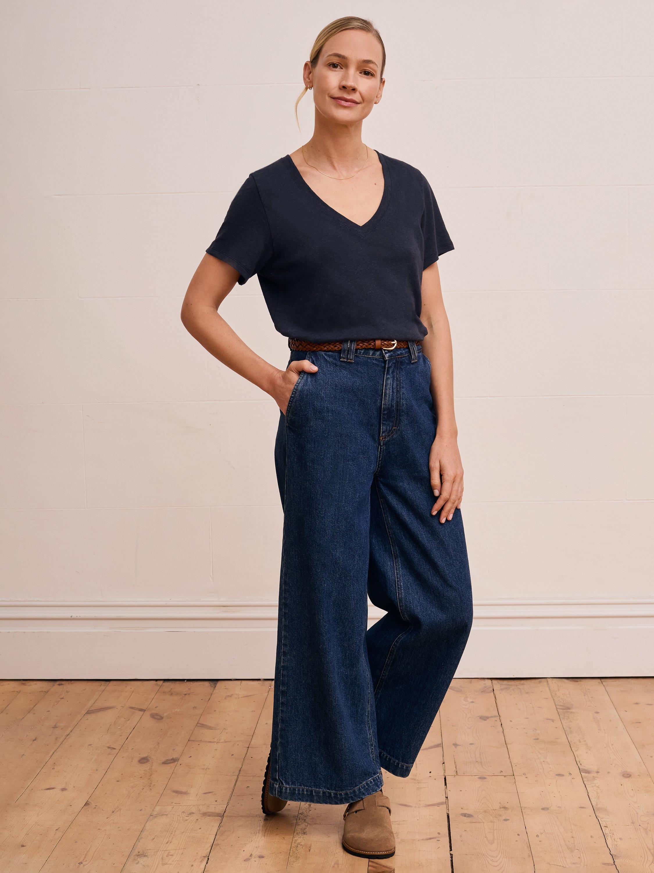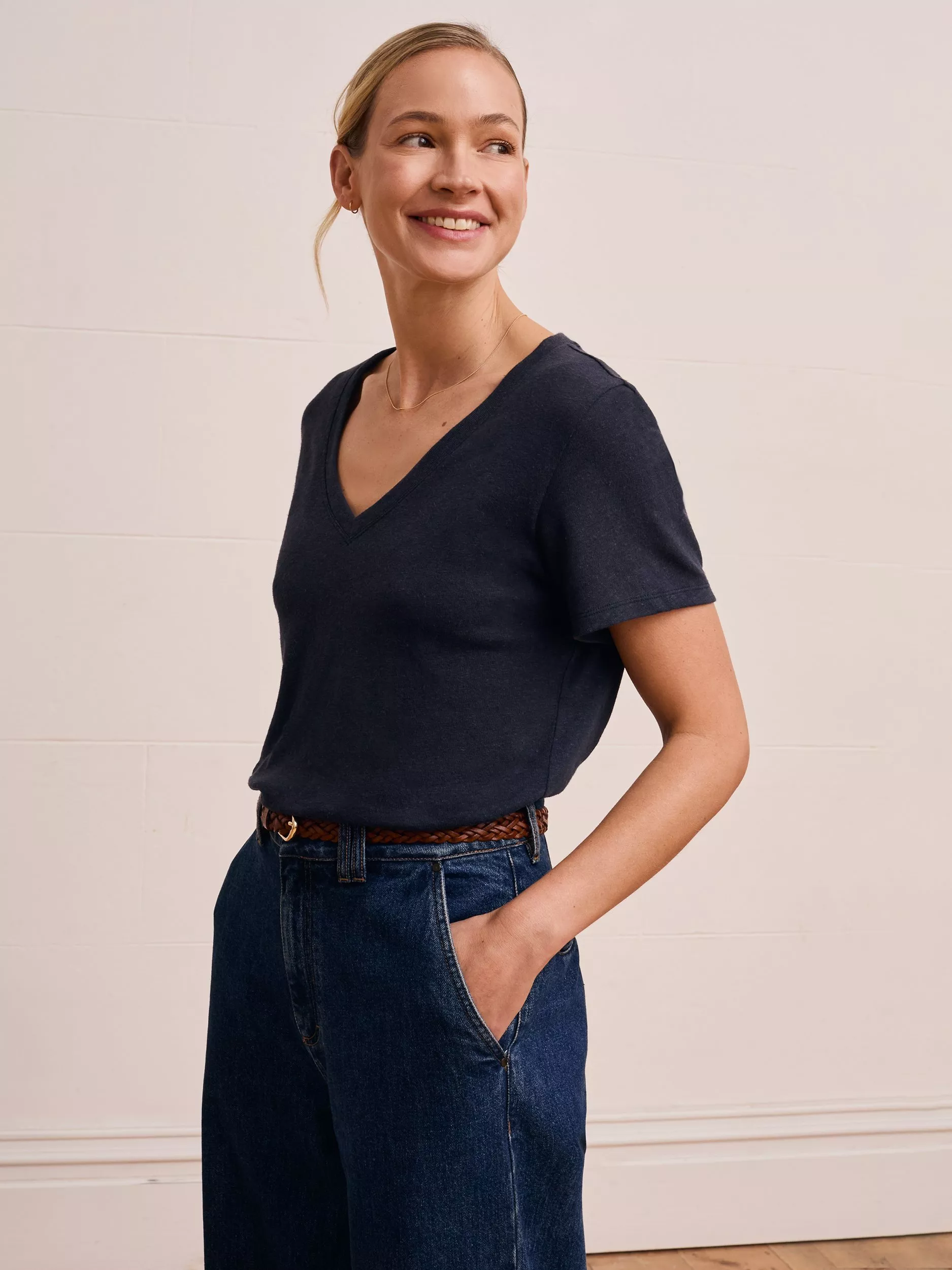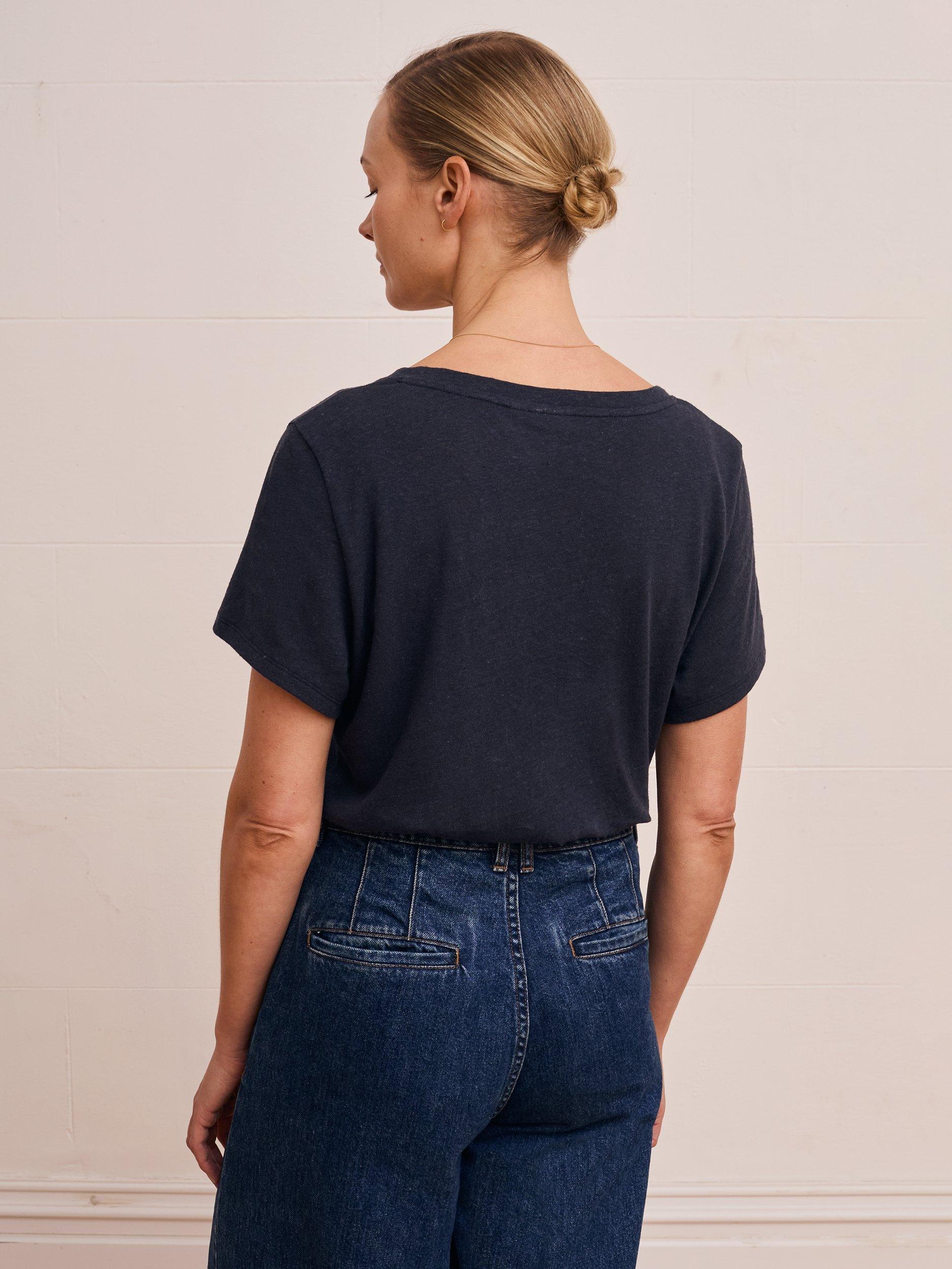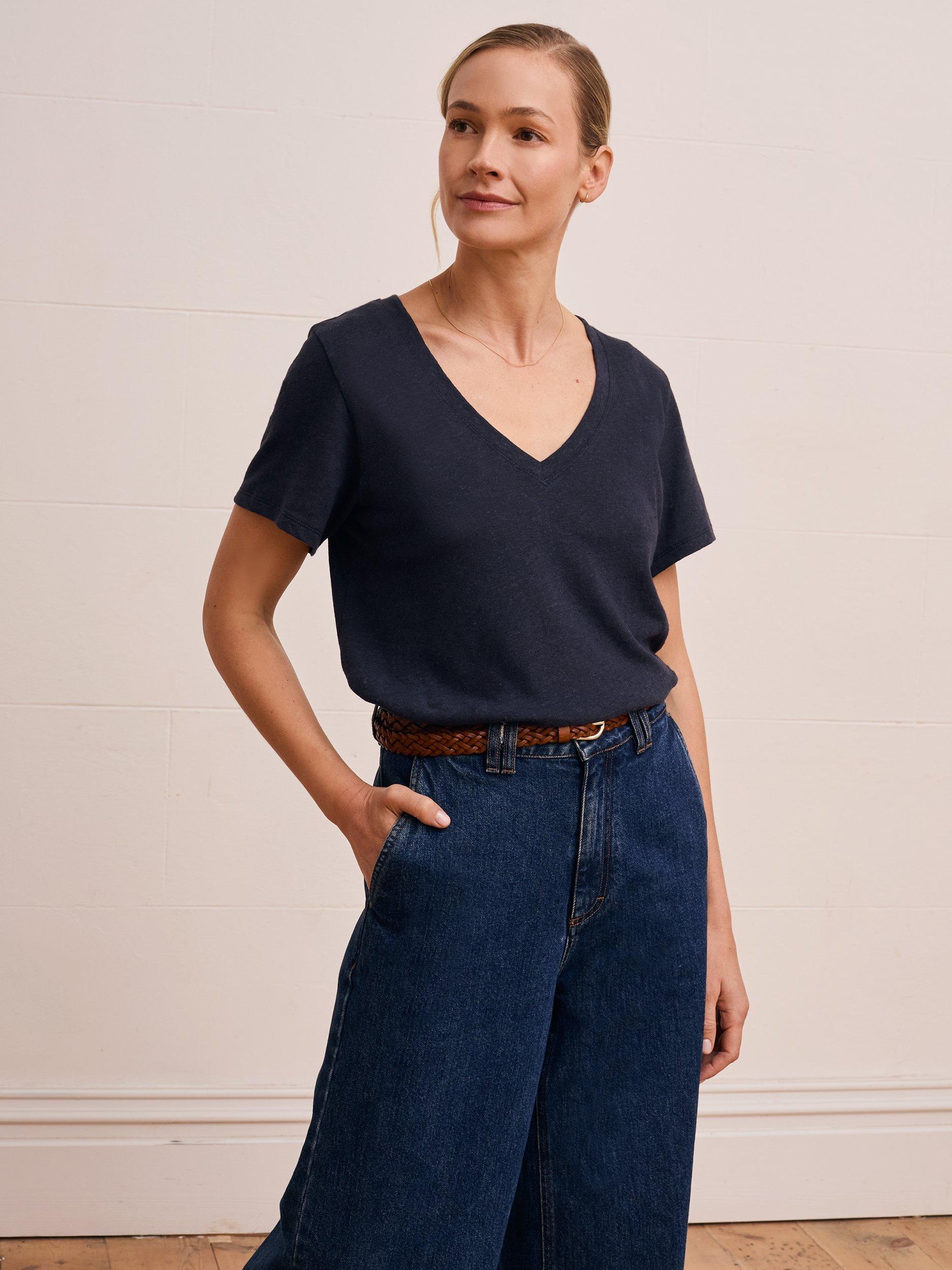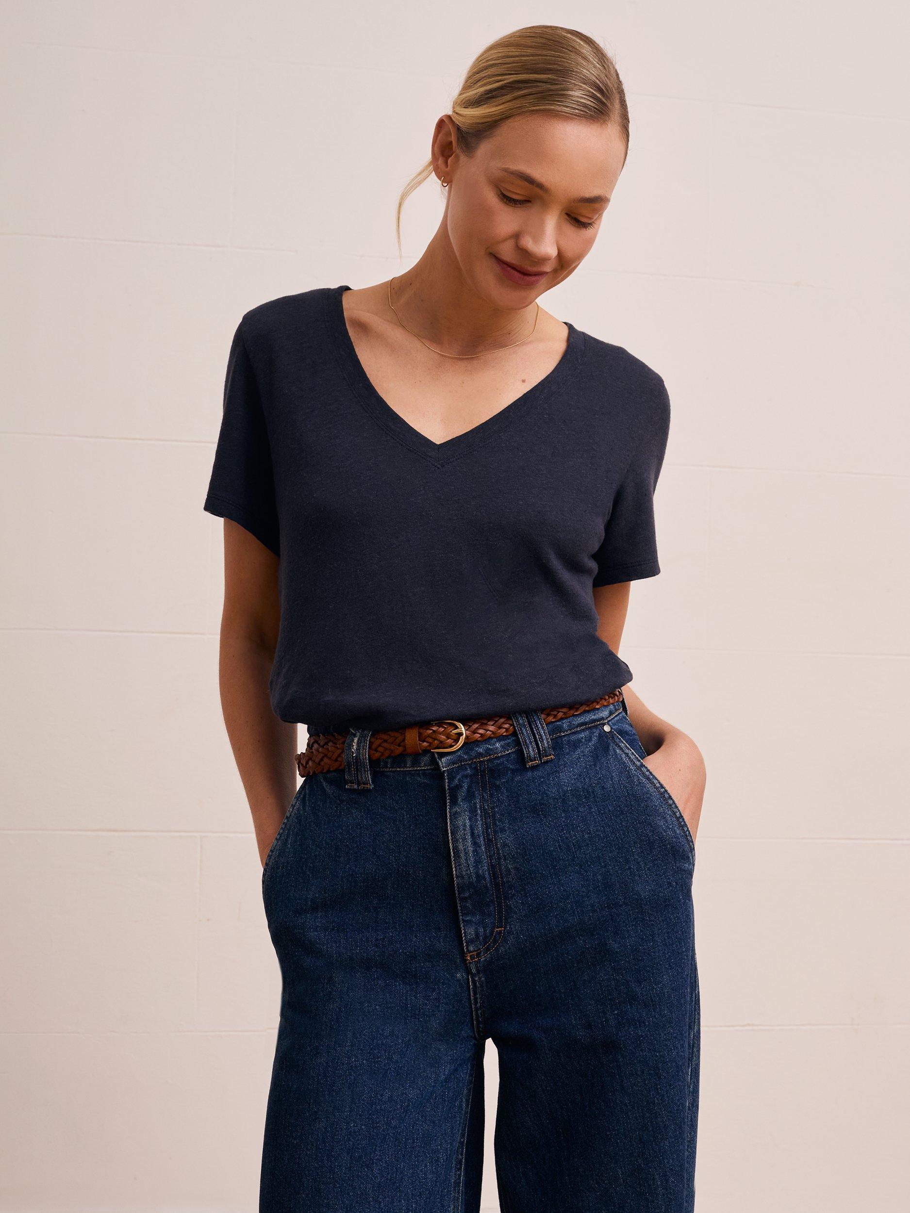 Made from a classic linen and cotton blend jersey, this tee features a beautiful textured slub in the fabric. With an elegant V neckline and set-in short sleeves, it offers an easy fit for your daily wear. Whether you're dressing up or down, this T-shirt is a timeless addition to your wardrobe.