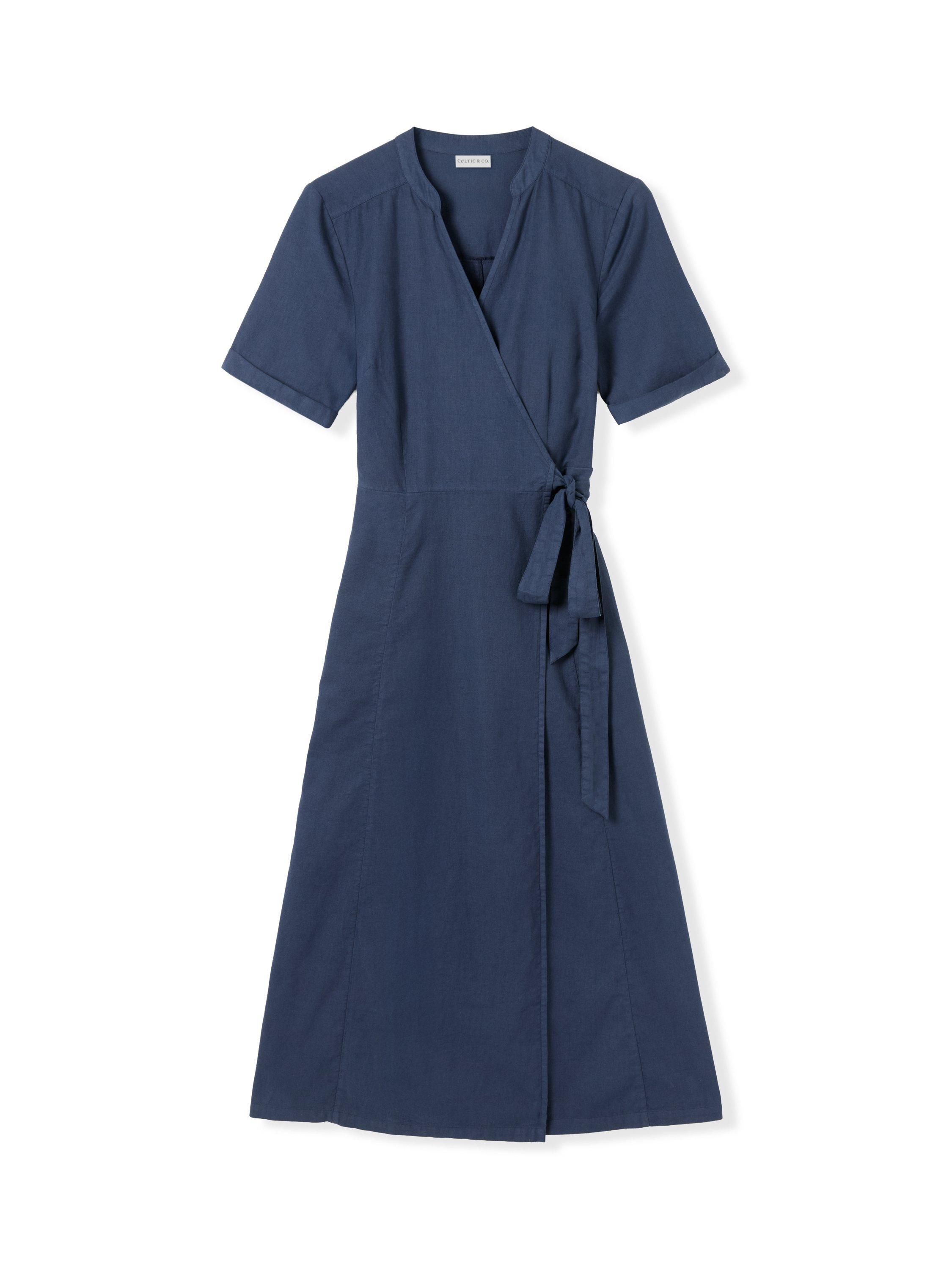 This fitted wrap midi dress features a V-neckline and short sleeves with a refined turn-back detail. The tie waist fastening adds a graceful finish to this elegant, naturally inspired piece.