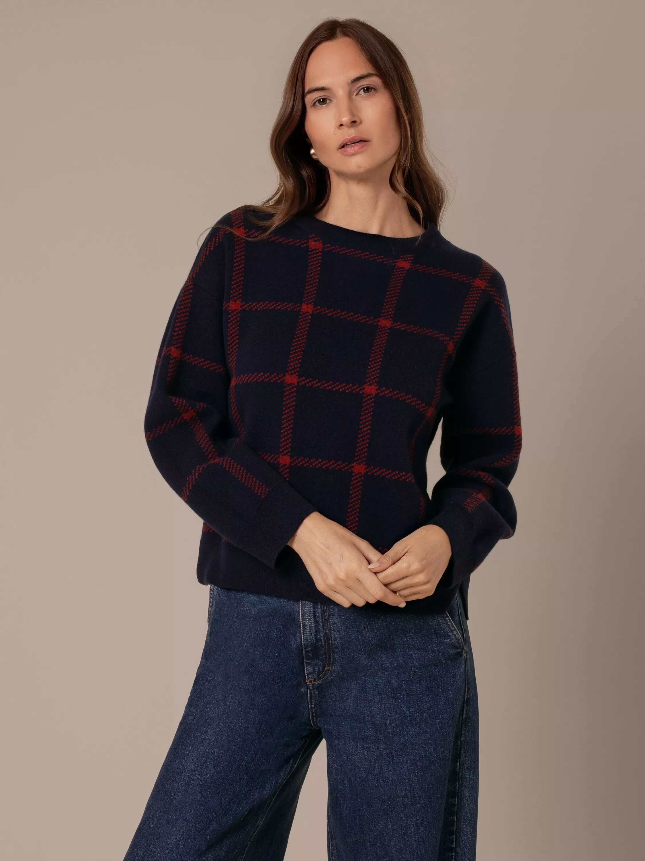 Made from pure lambswool, this jumper features a windowpane check design in a birdseye knit for subtle structure. The boxy, slightly cropped fit pairs with a classic crew neck and ribbed trims, making it a versatile option for smart or casual wear.