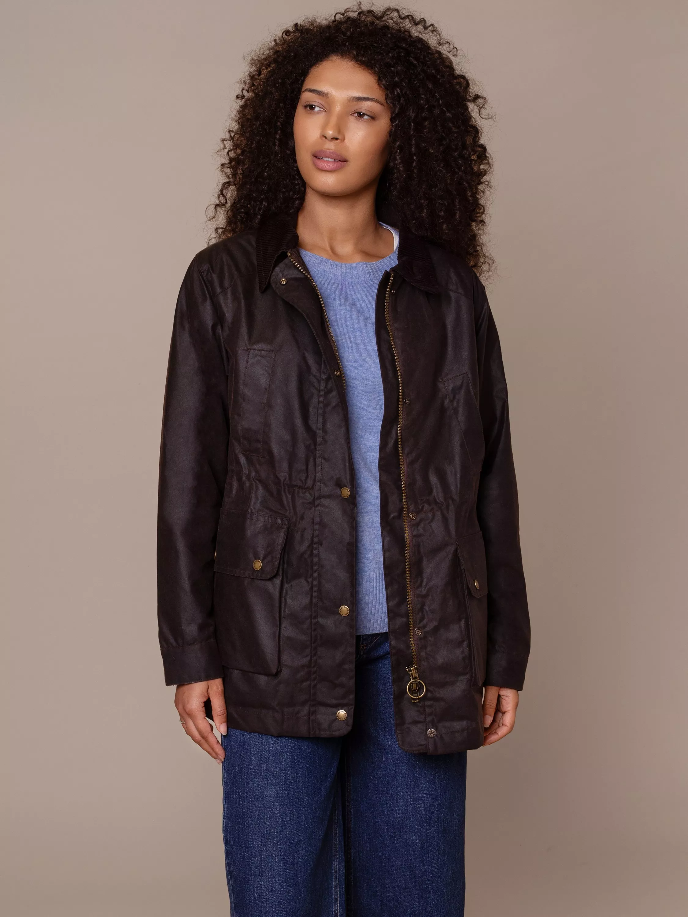 Classic-style wax jacket featuring a zip-through front and contrast cord collar. The internal drawstring waist detail provides a flattering fit.