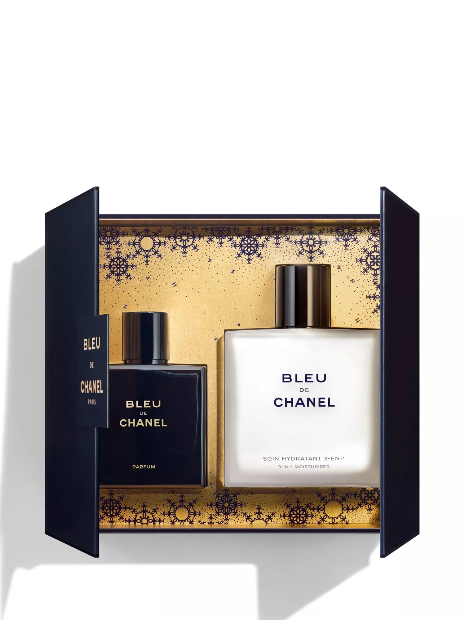 Showcased in a limited-edition case adorned with signature snowflakes, BLEU DE CHANEL Parfum and BLEU DE CHANEL 3-in-1 Moisturiser offer a masculine ritual featuring woody, aromatic notes.