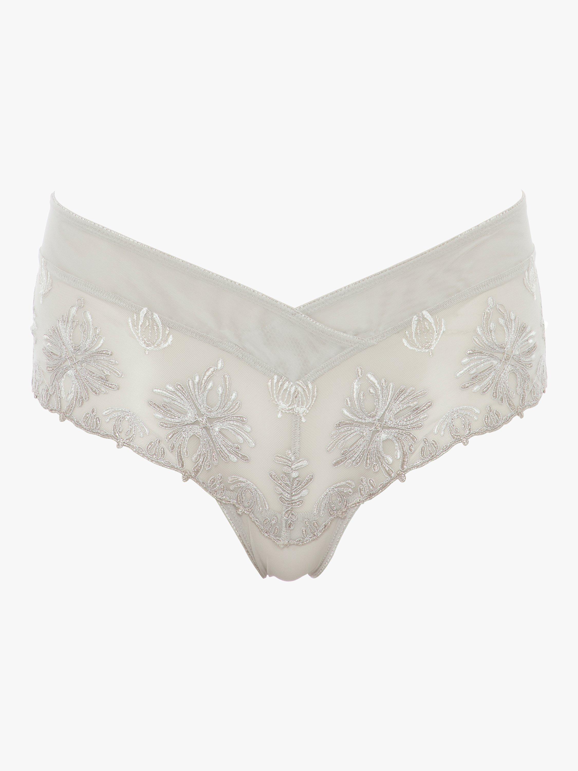 Wonderfully smooth against the skin in a sheer tulle composition, these briefs sit low on the waist with a modern v-shaped front and feature geometric embroidered detail.