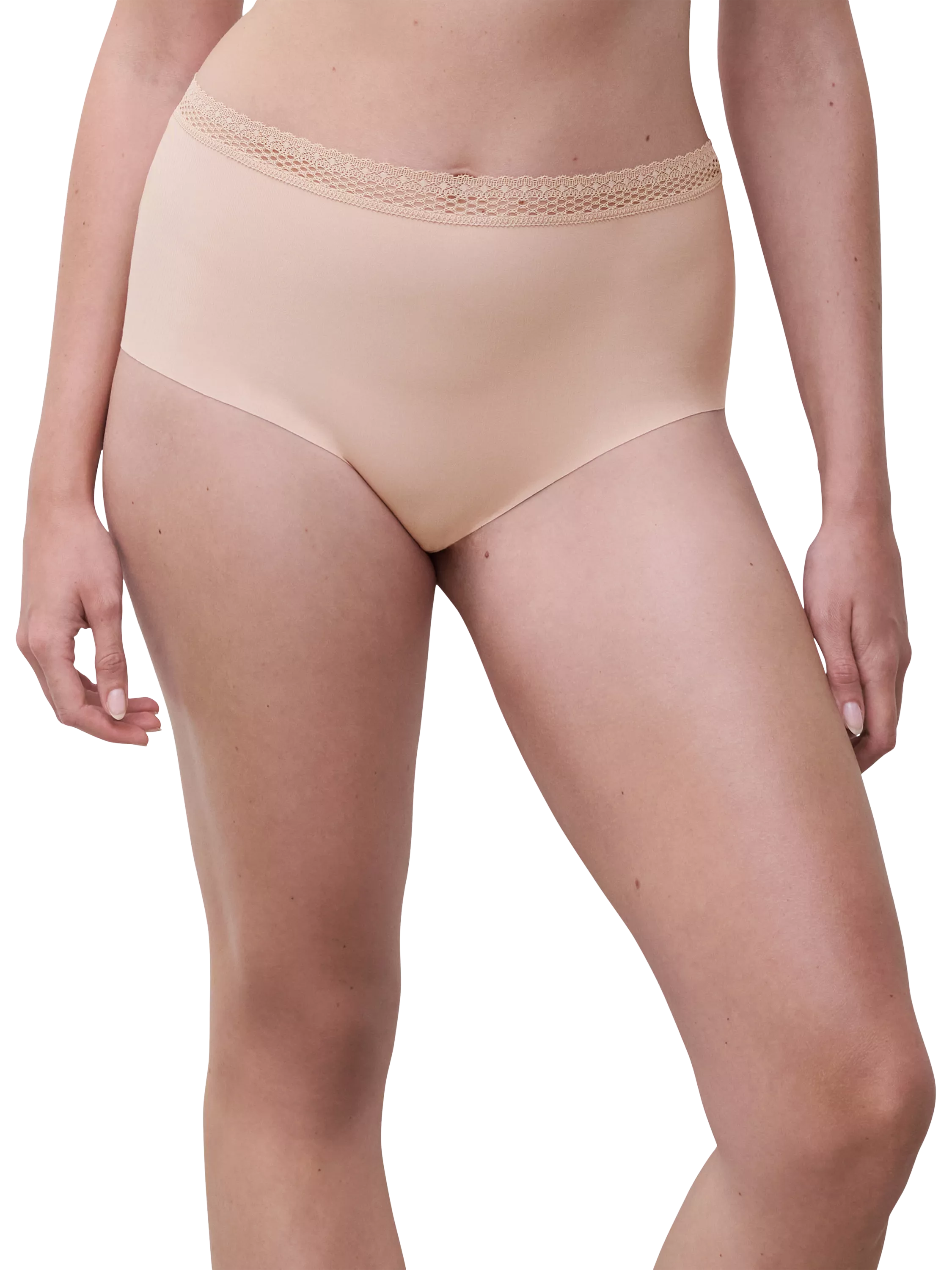 Discover the perfect everyday high-waisted brief by Chantelle, crafted from naturally soft and breathable fabrics, including modal and recycled lace trimming. Enjoy invisible comfort with a clean-cut design that eliminates visible panty lines, and experience good coverage over the tummy for added comfort. Designed in France.