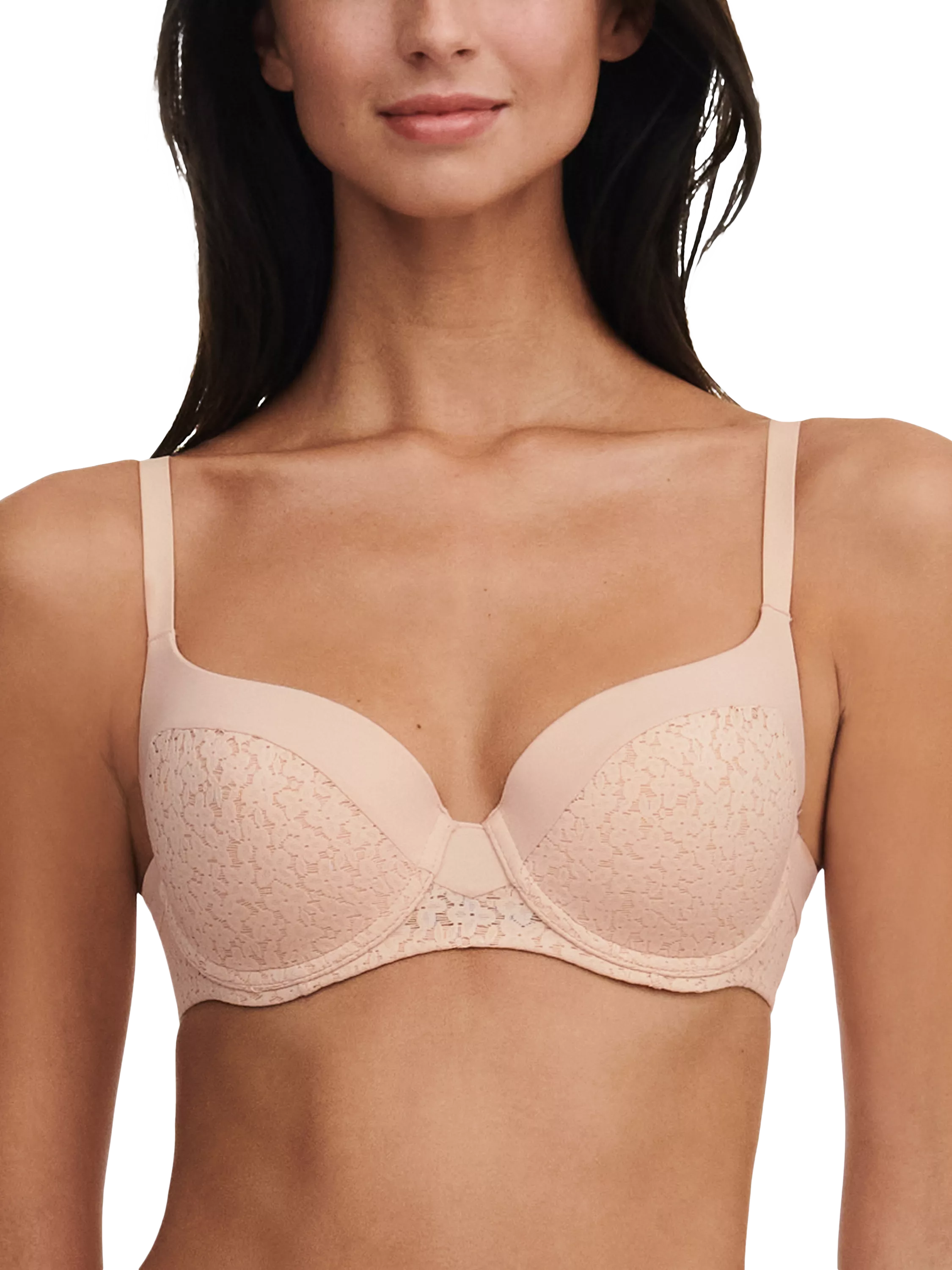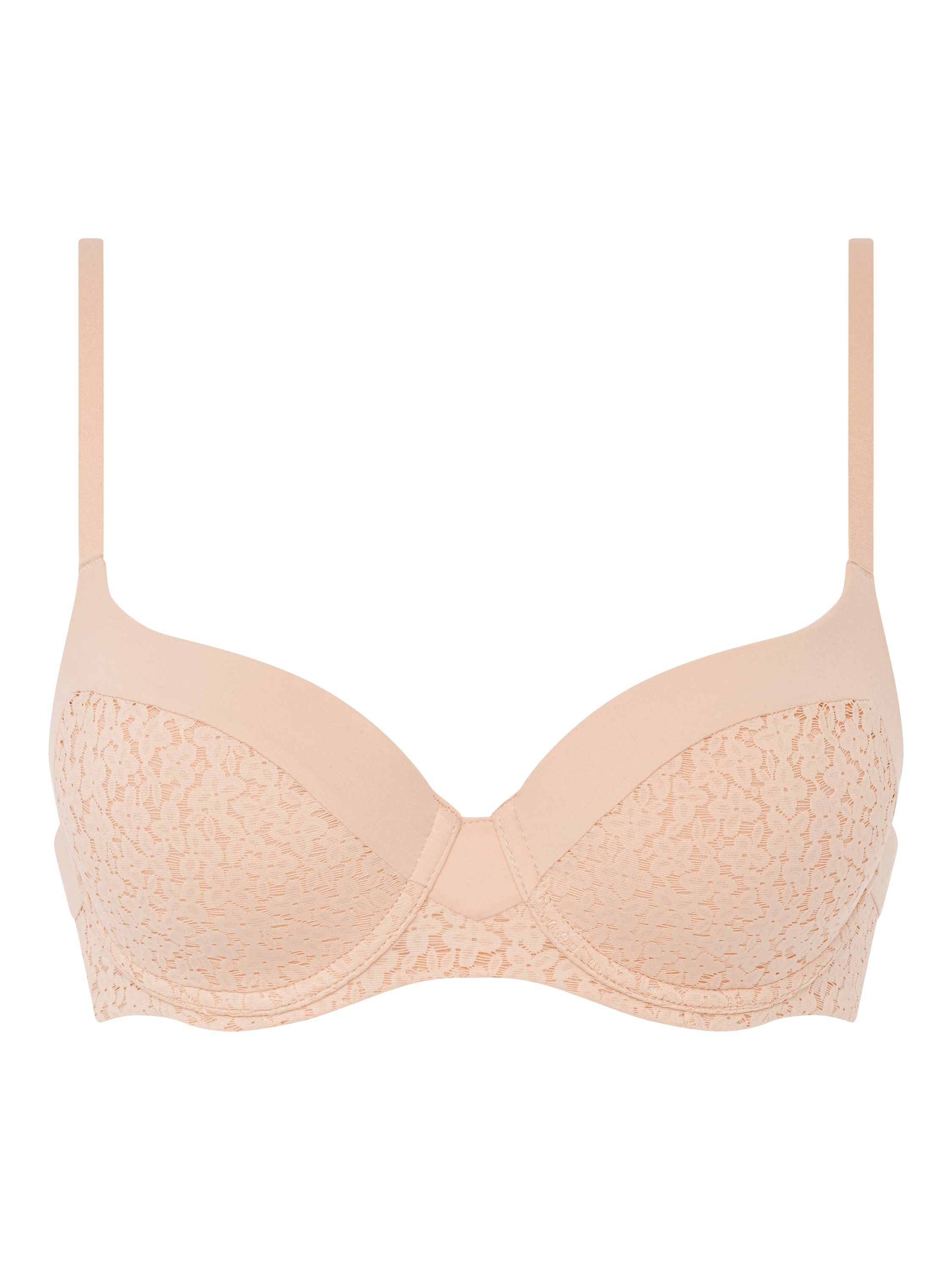 Norah, the line with incredible softness ensuring ultimate everyday comfort. This wired t-shirt bra is made with a floral lace and finished with an opaque knit trim on the cups for an elegant look. Lined with a soft opaque knit with enclosed seams for support and invisibility. Fully adjustable straps and a hook and eye on the back.