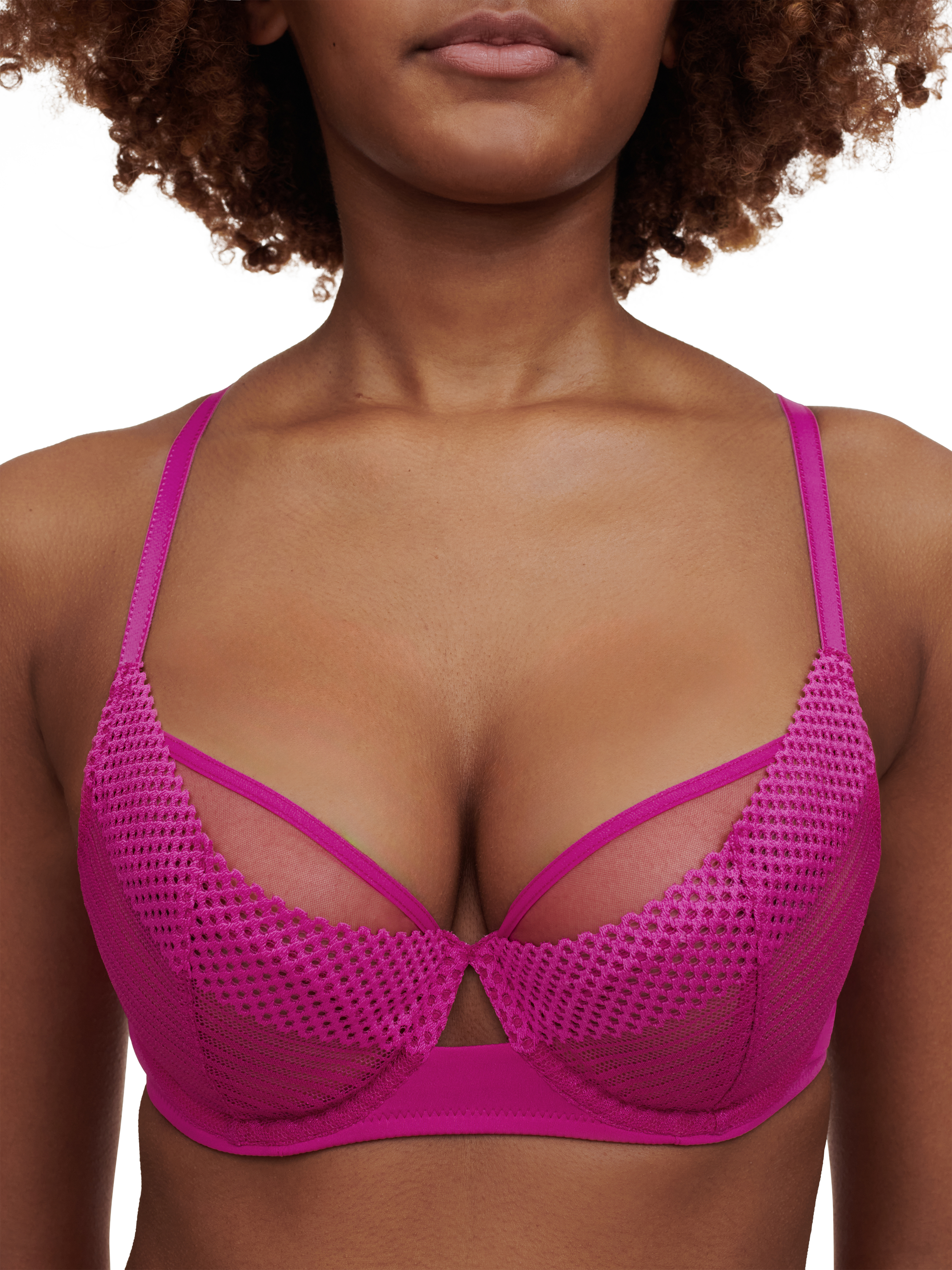 A new full-bust underwired bra shape from Chantelle Pulp. Designed with a 3-part tulle construction on the cups that provides a centred, rounded and lifted bust shape from C-G cups. The lace over the cups reinforces the centring effect and support. The thin and flat elastic finish on the neckline provides easy fit benefits and adaptability in all sizes.
