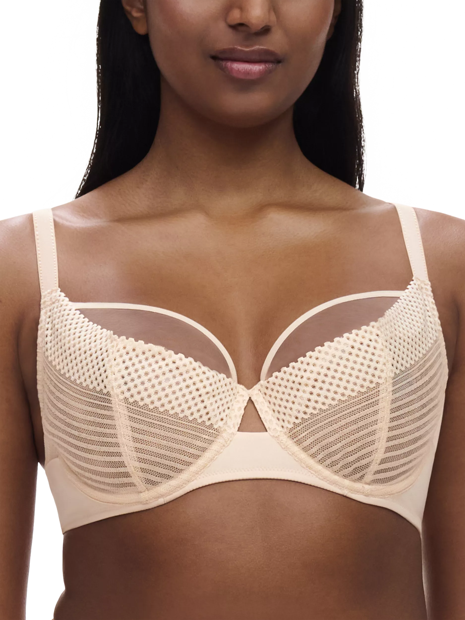 A new full-bust underwired bra shape from Chantelle Pulp. Designed with a 3-part tulle construction on the cups that provides a centred, rounded and lifted bust shape from C-G cups. The lace over the cups reinforces the centring effect and support. The thin and flat elastic finish on the neckline provides easy fit benefits and adaptability in all sizes.