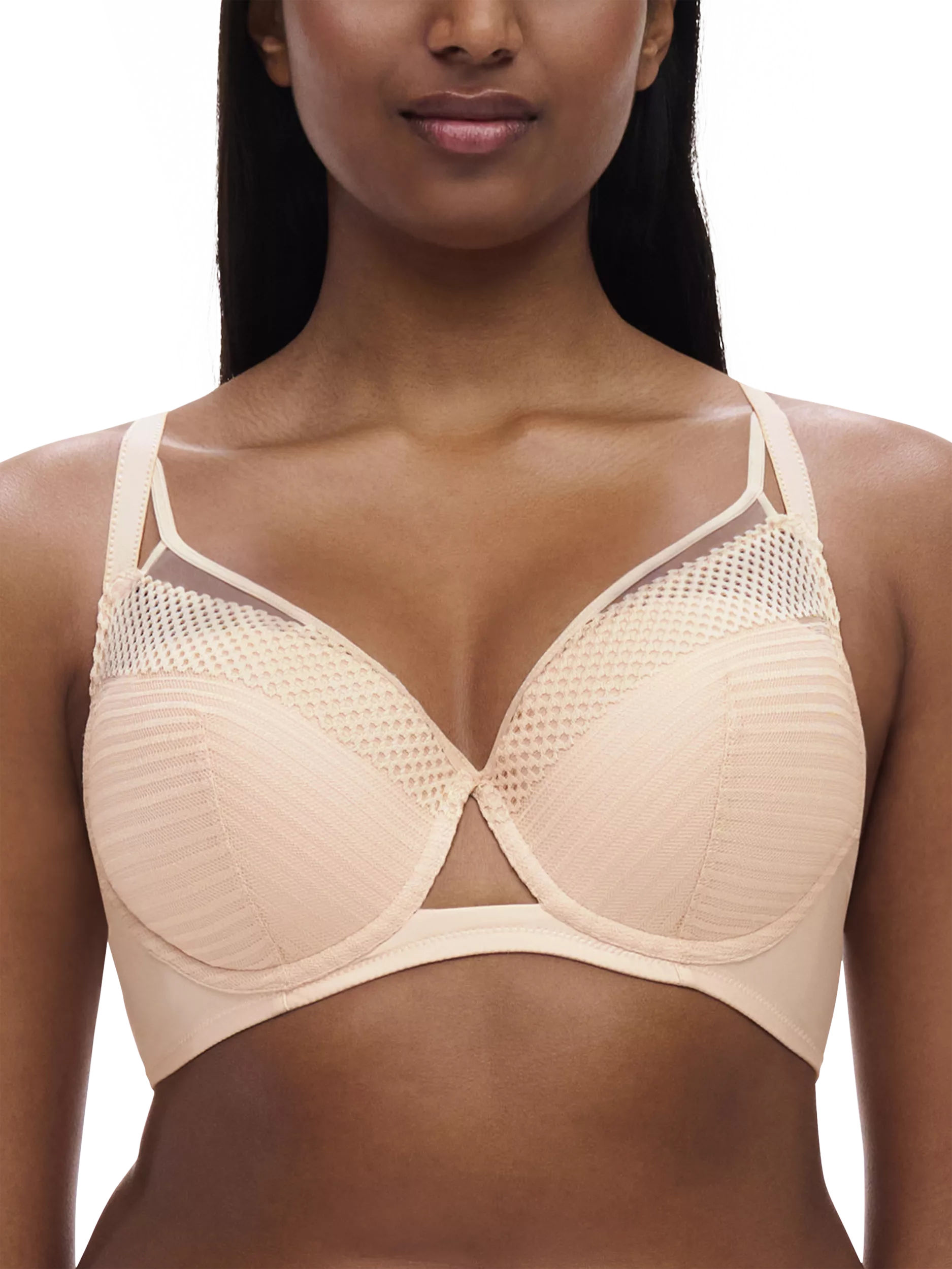The style boasts transparent tulle at the top of the cup for a modern look. The bra sits on a base to enhance the support and the new elasticated back construction at the hook and eye provides support and comfort as well as a contemporary look. The back is made of strong opaque and soft knit and the bra is completed with fully adjustable straps. Designed in France.