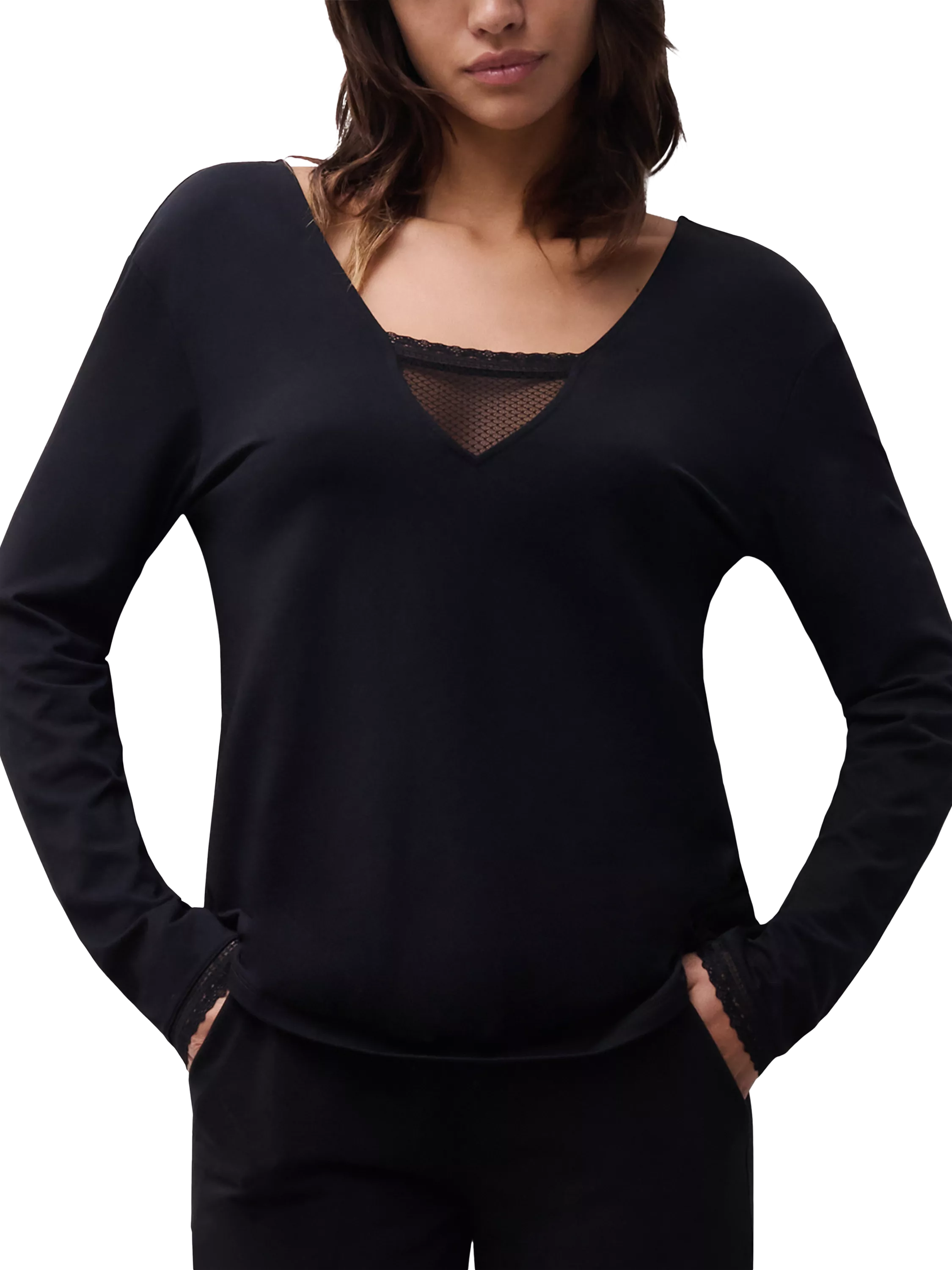 Made from a comfortable blend of cotton, modal, and elastane, this long-sleeved lounge top features a lower back and a delicate lace panel on both the front and back.