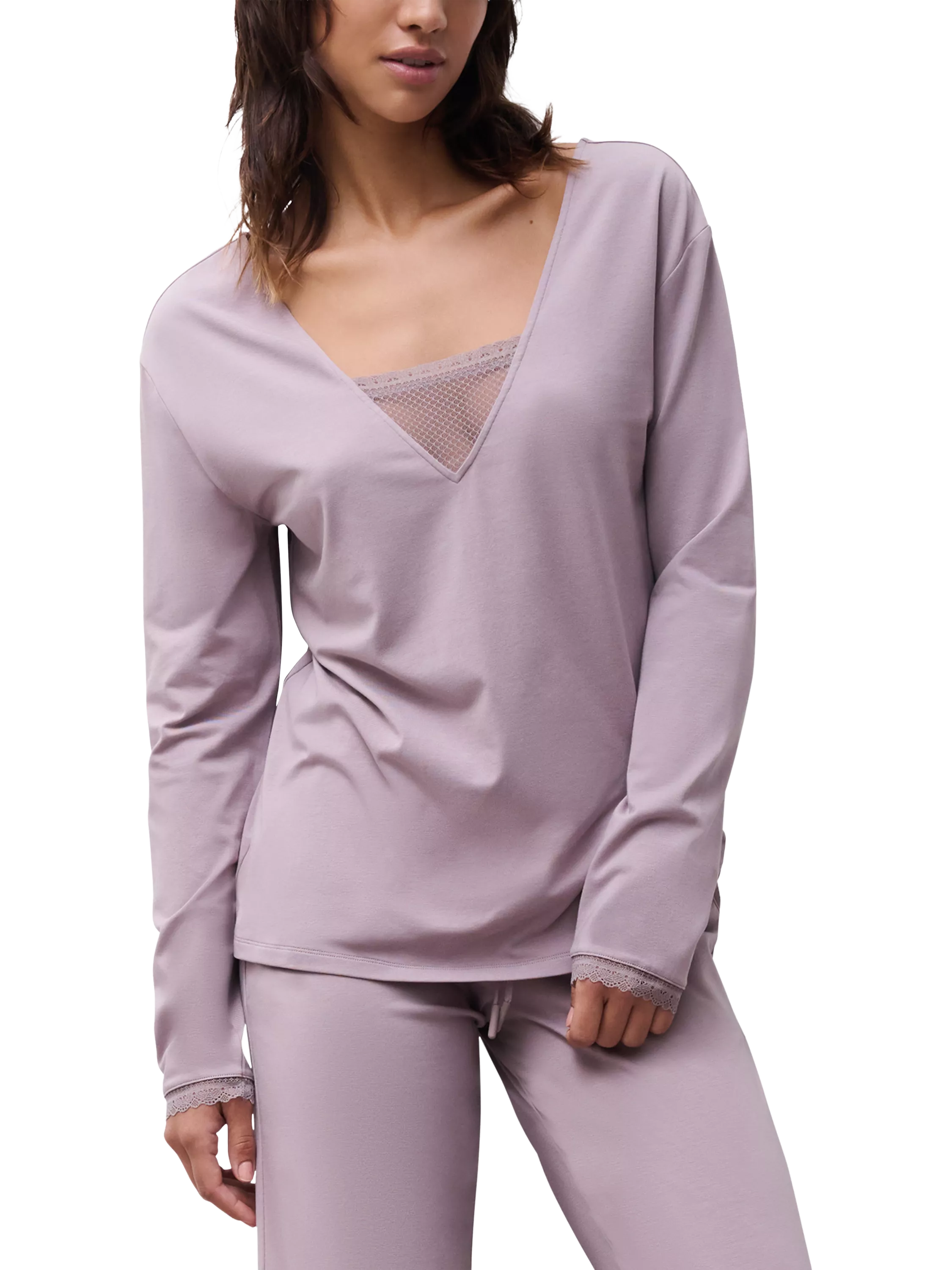 Made from a comfortable blend of cotton, modal, and elastane, this long-sleeved lounge top features a lower back and a delicate lace panel on both the front and back.