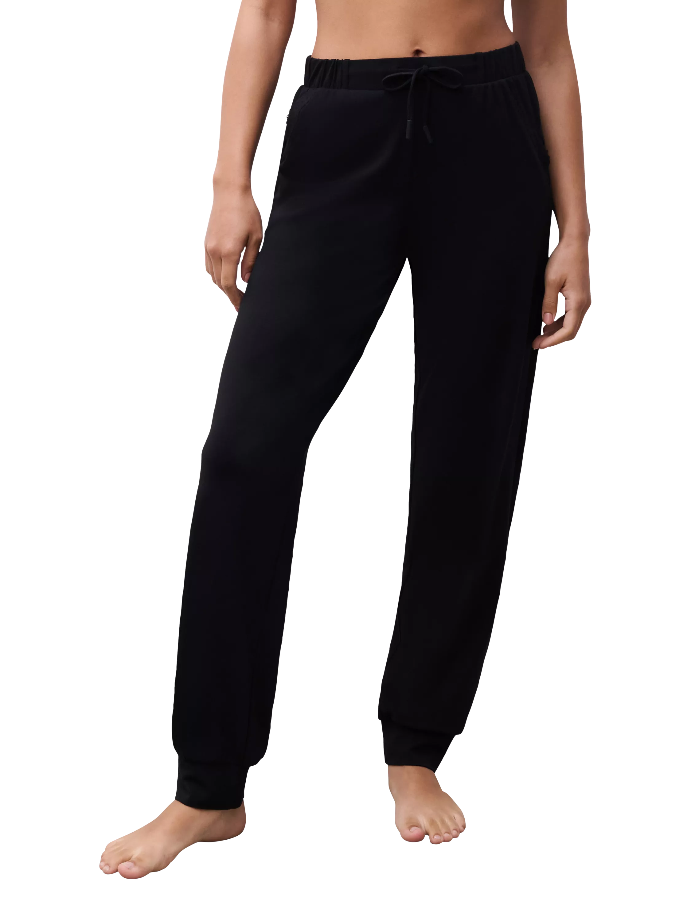Made from a comfortable blend of cotton, modal, and elastane, these lounge trousers feature two pockets, an elasticated waistband with a tie for adjustability, and cuffs at the bottom of the legs for a modern look.
