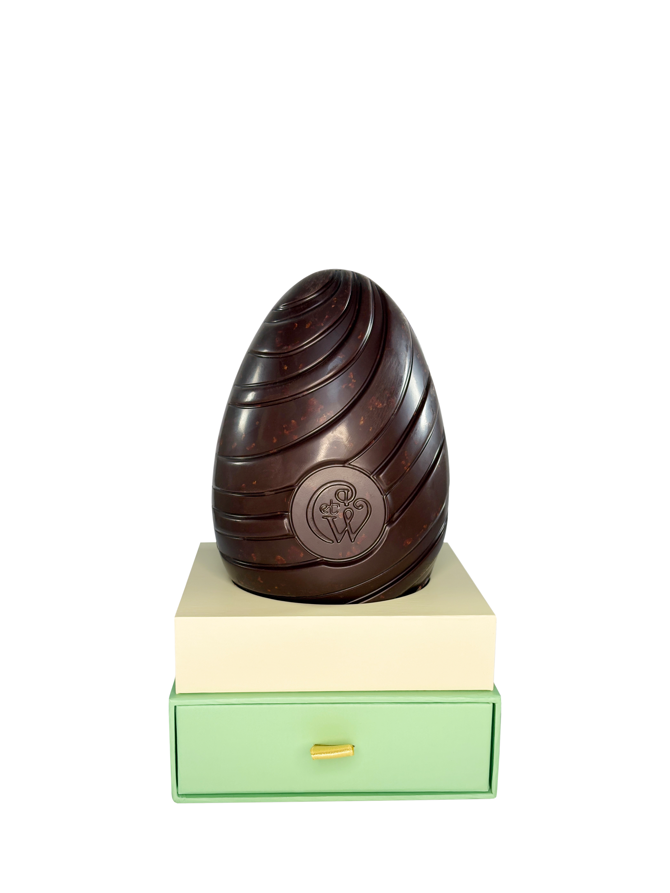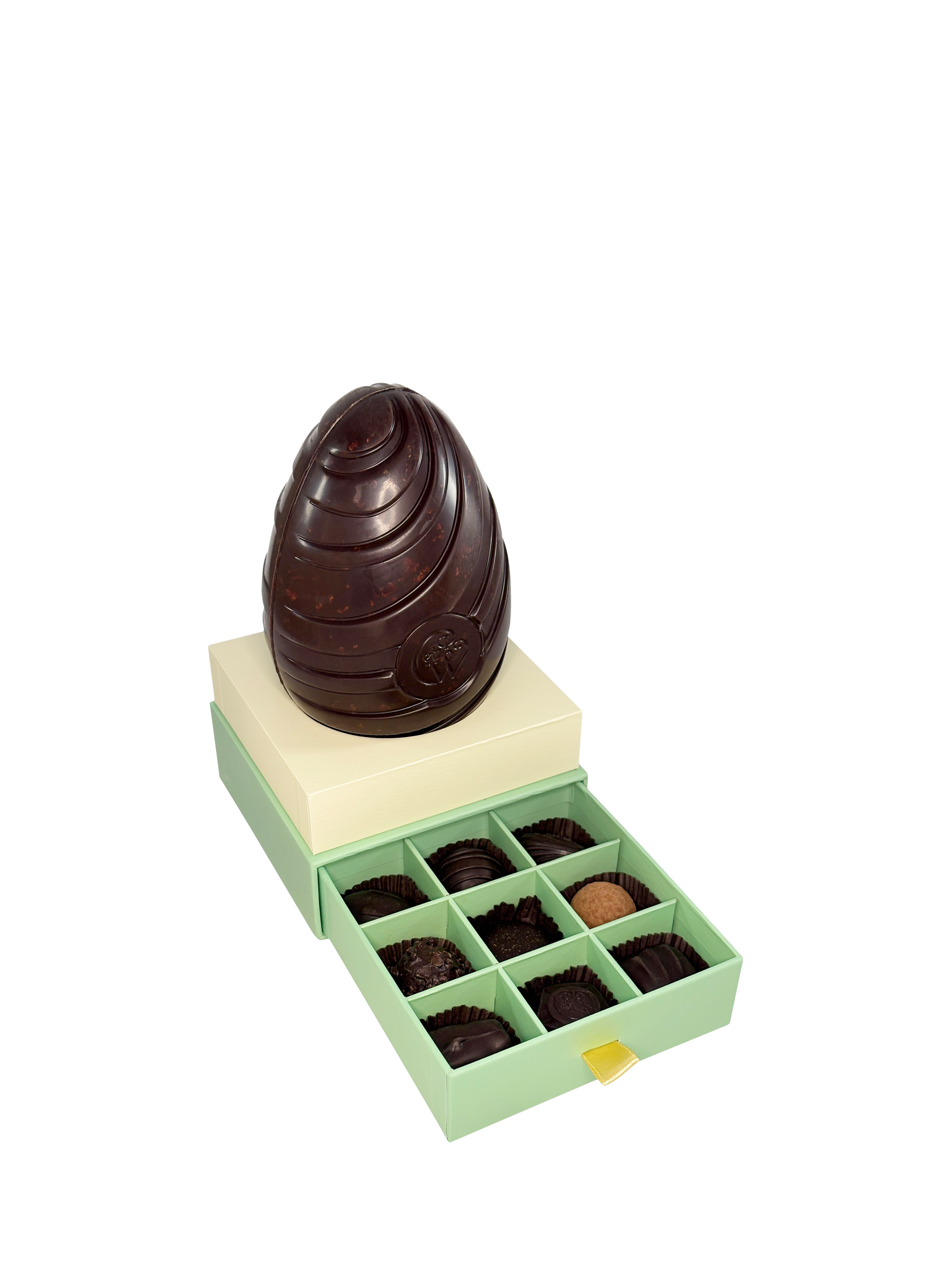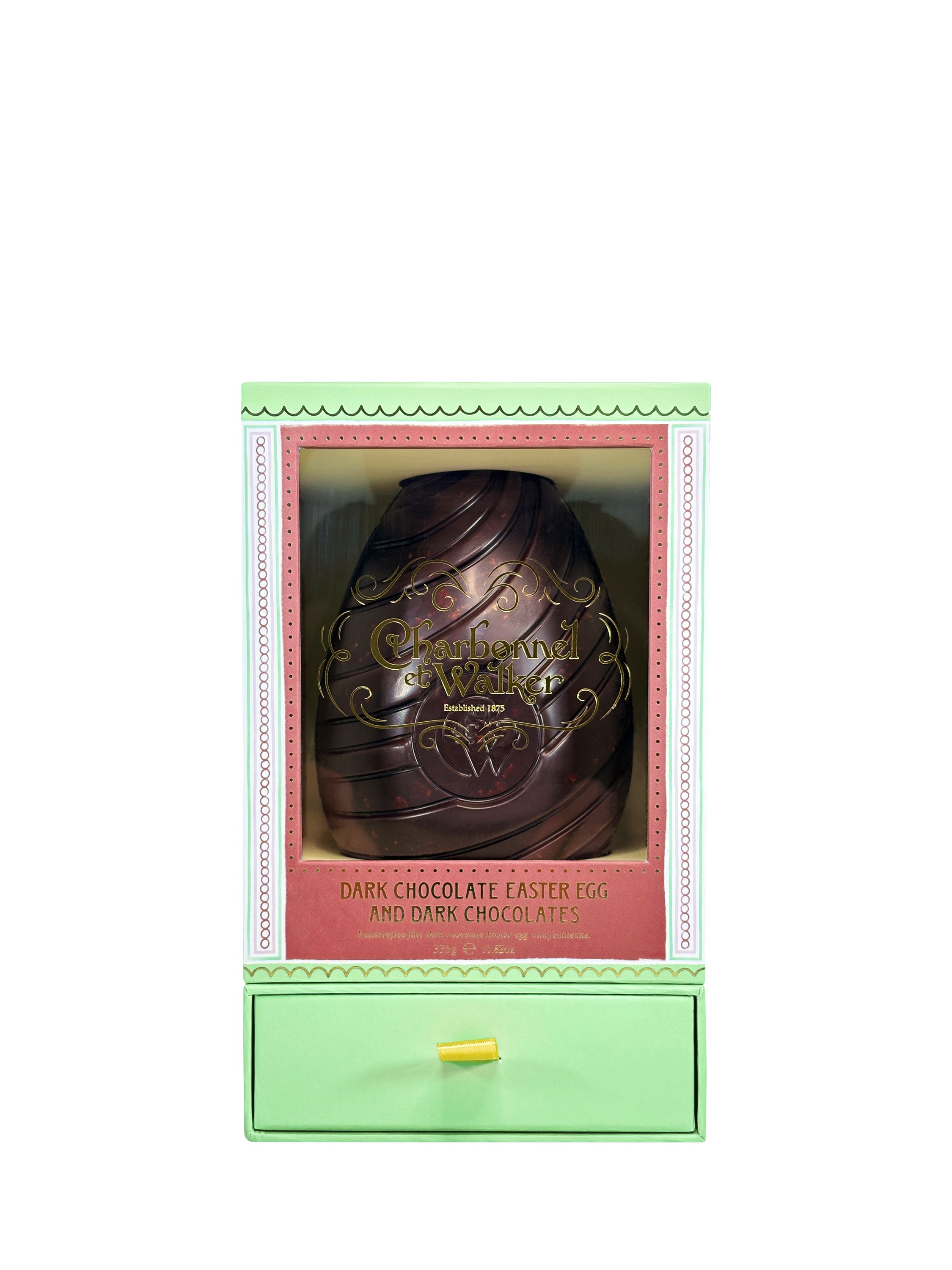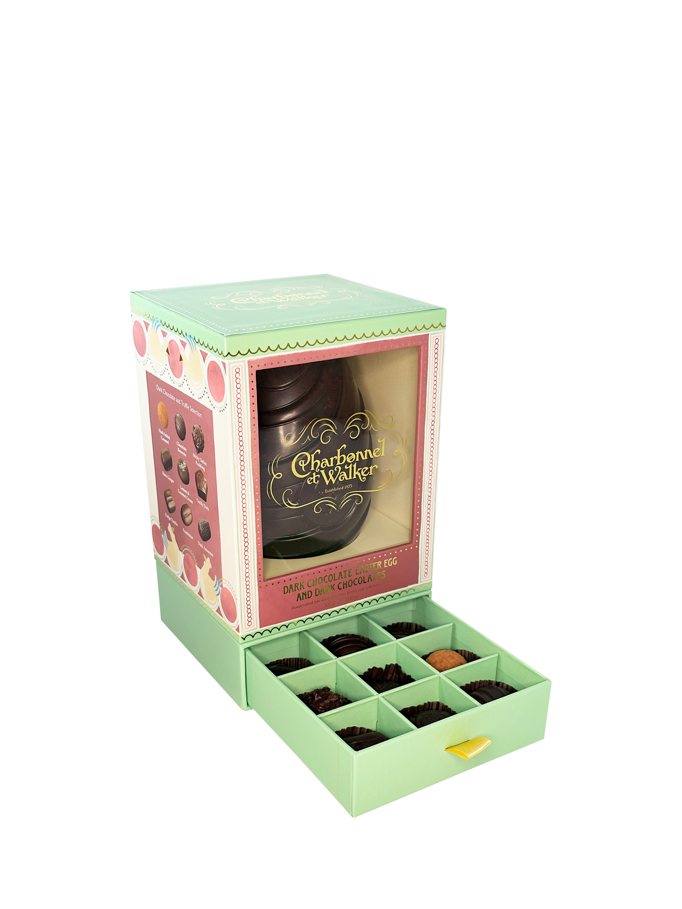 Charbonnel et Walker Dark Chocolate egg with a selection of assorted truffles.