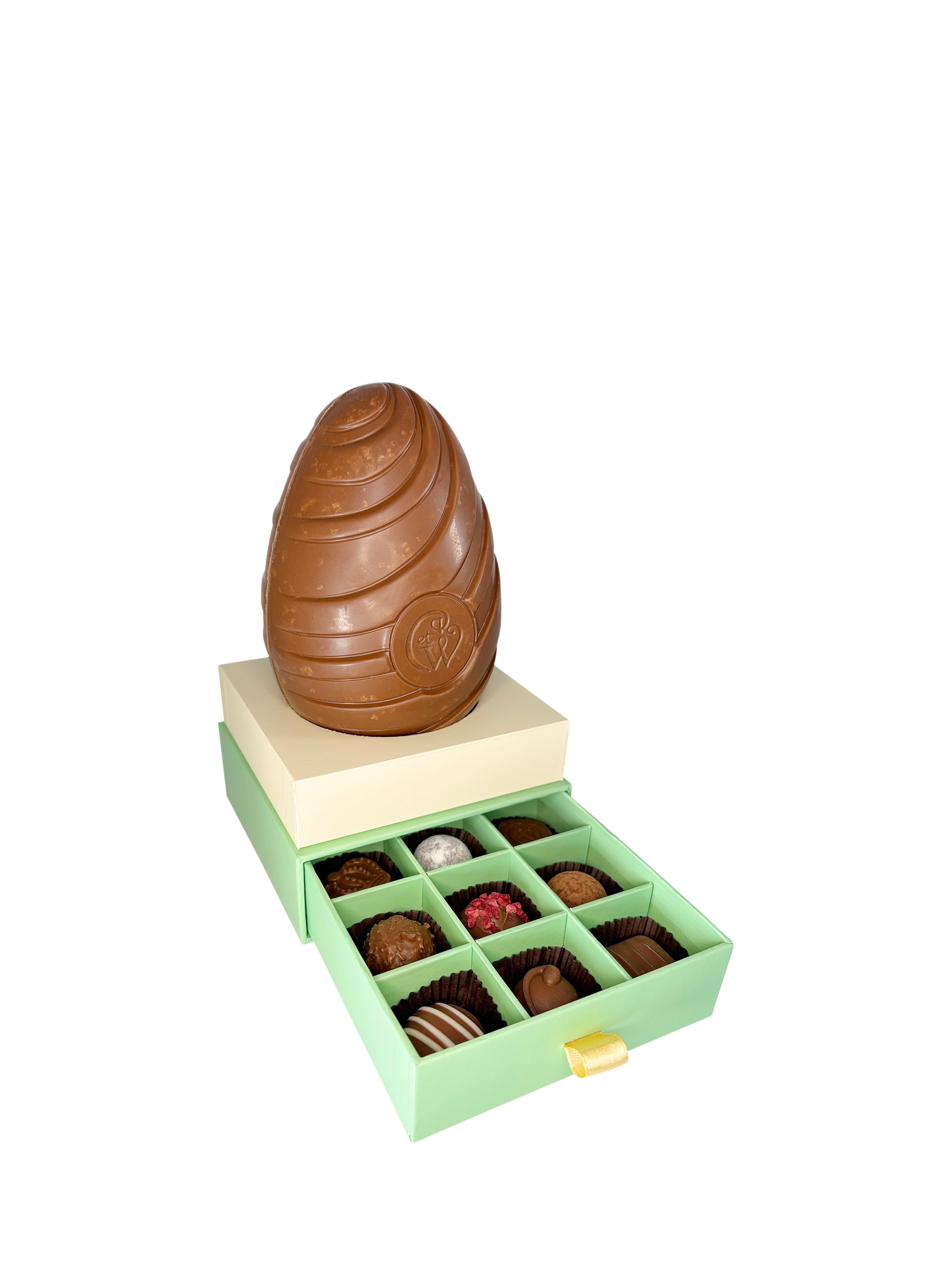 Charbonnel et Walker Milk Chocolate egg with a selection of assorted truffles.