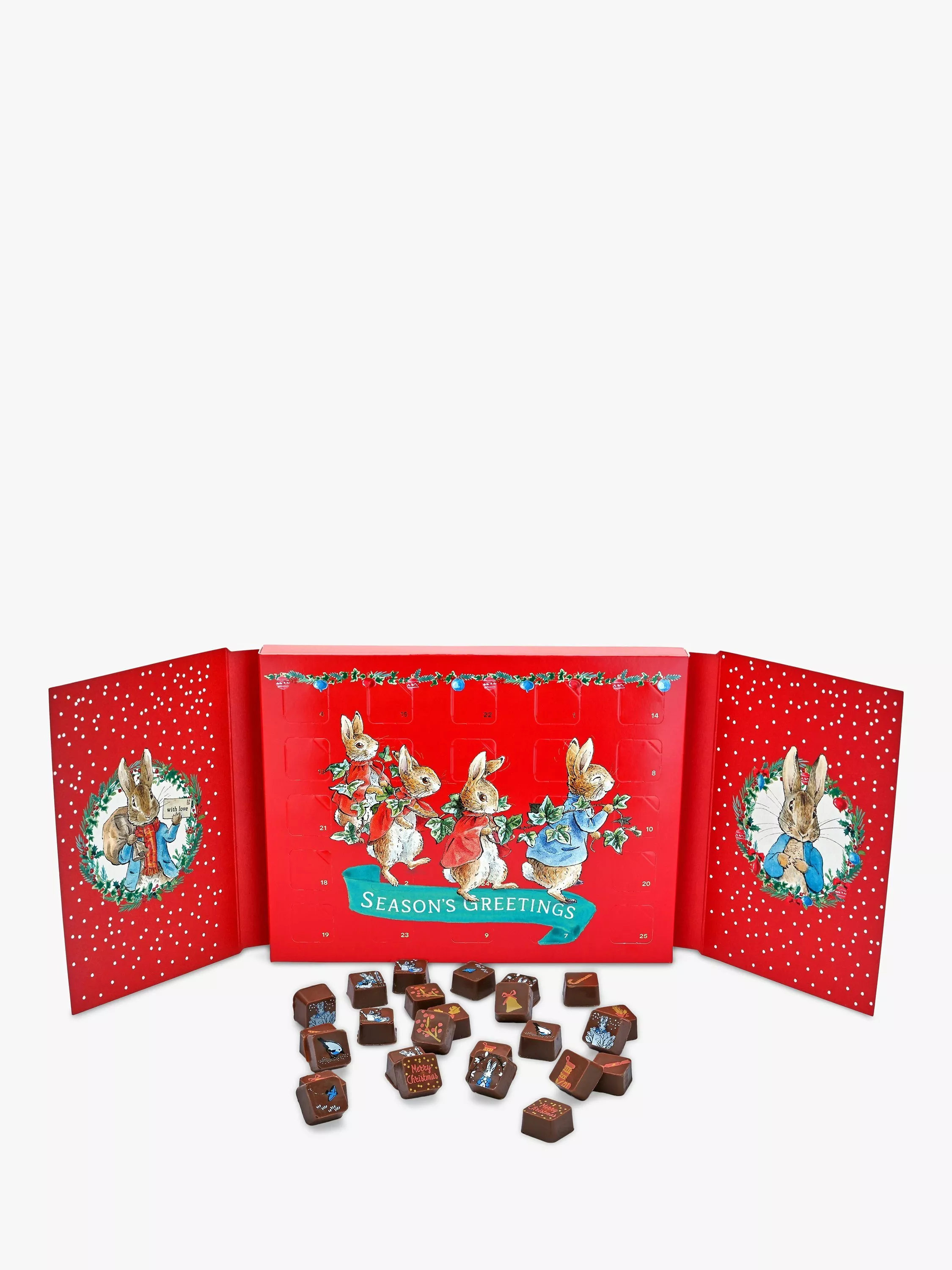 25 milk chocolates for Advent, transfer-printed with Peter Rabbit-themed images.