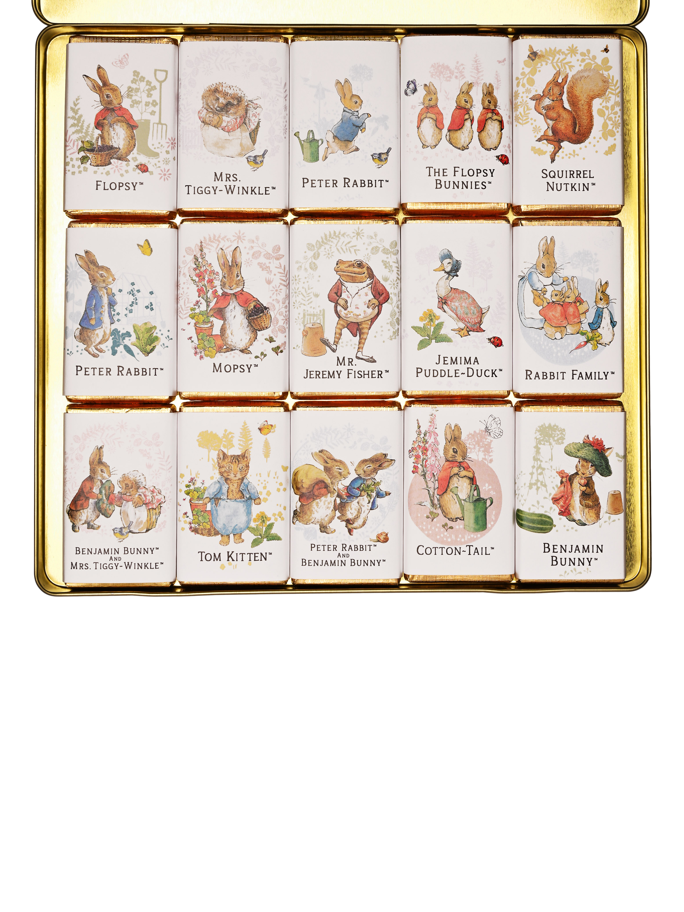 Delicious milk chocolate squares each wrapped in a unique Peter Rabbit designed wrapper, presented in a decorated gift tin.