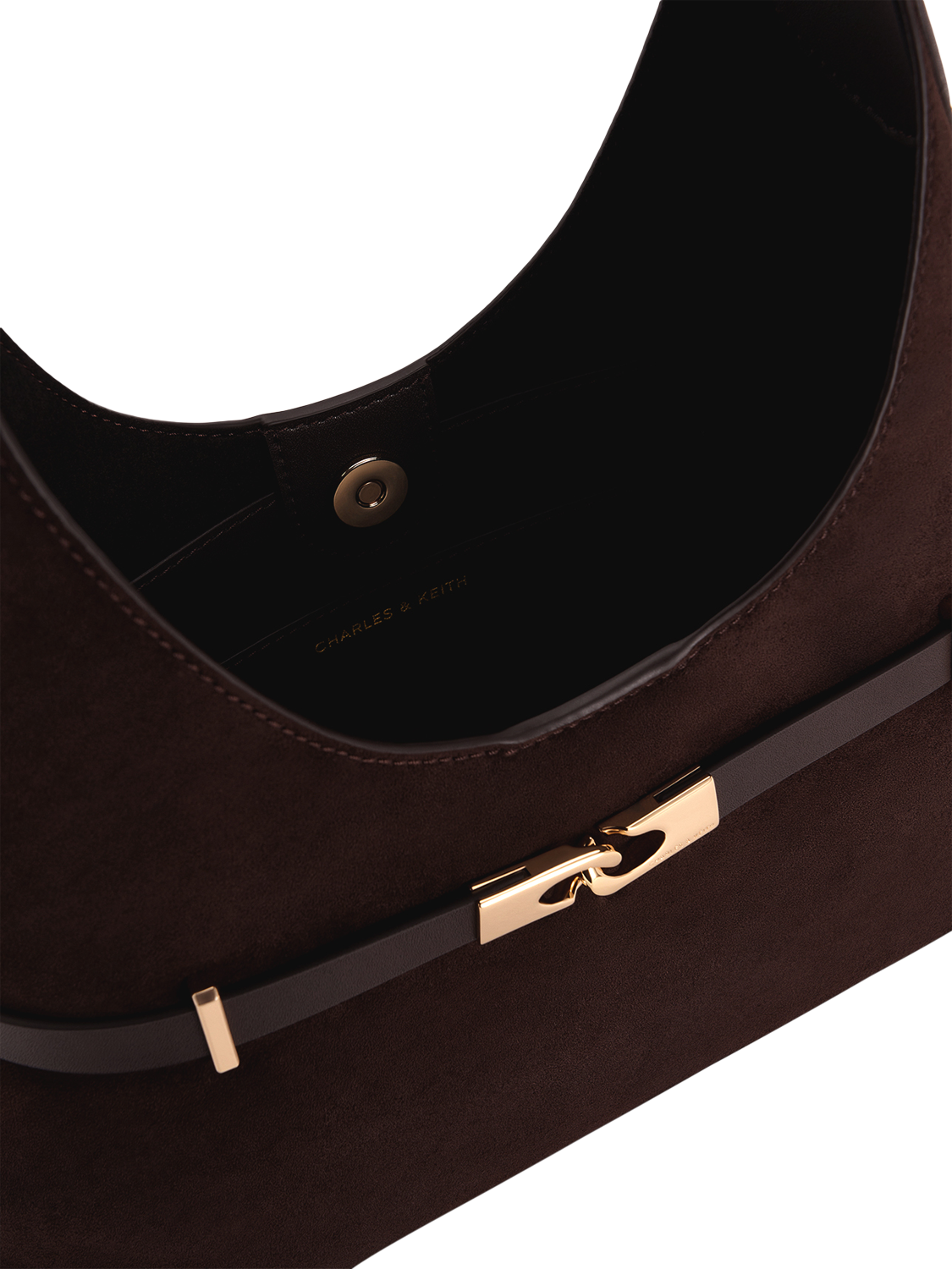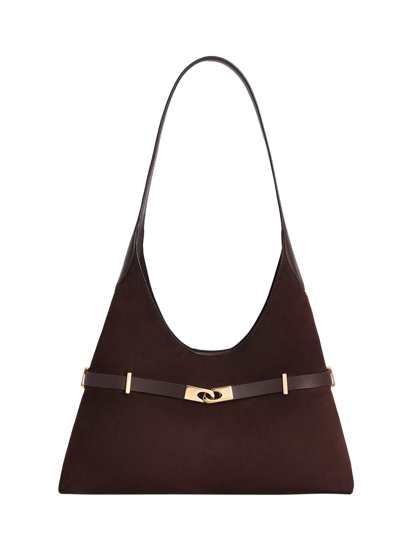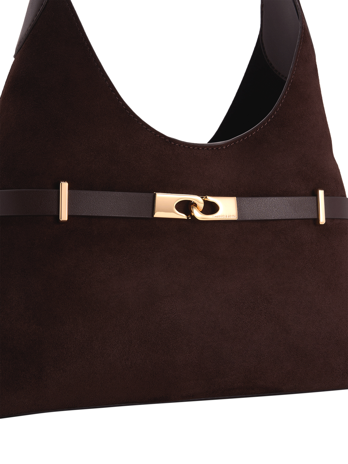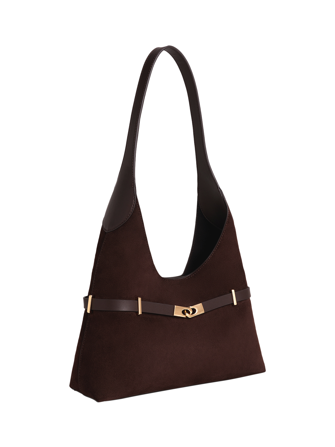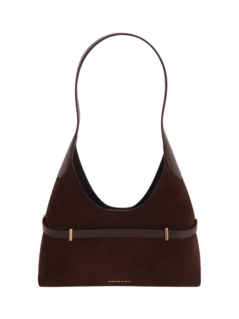 This Arlet hobo bag by CHARLES & KEITH is made with recycled suede and features a belted detail, a structured trapeze silhouette and a single handle. Carry it to add refined tactility to understated ensembles.