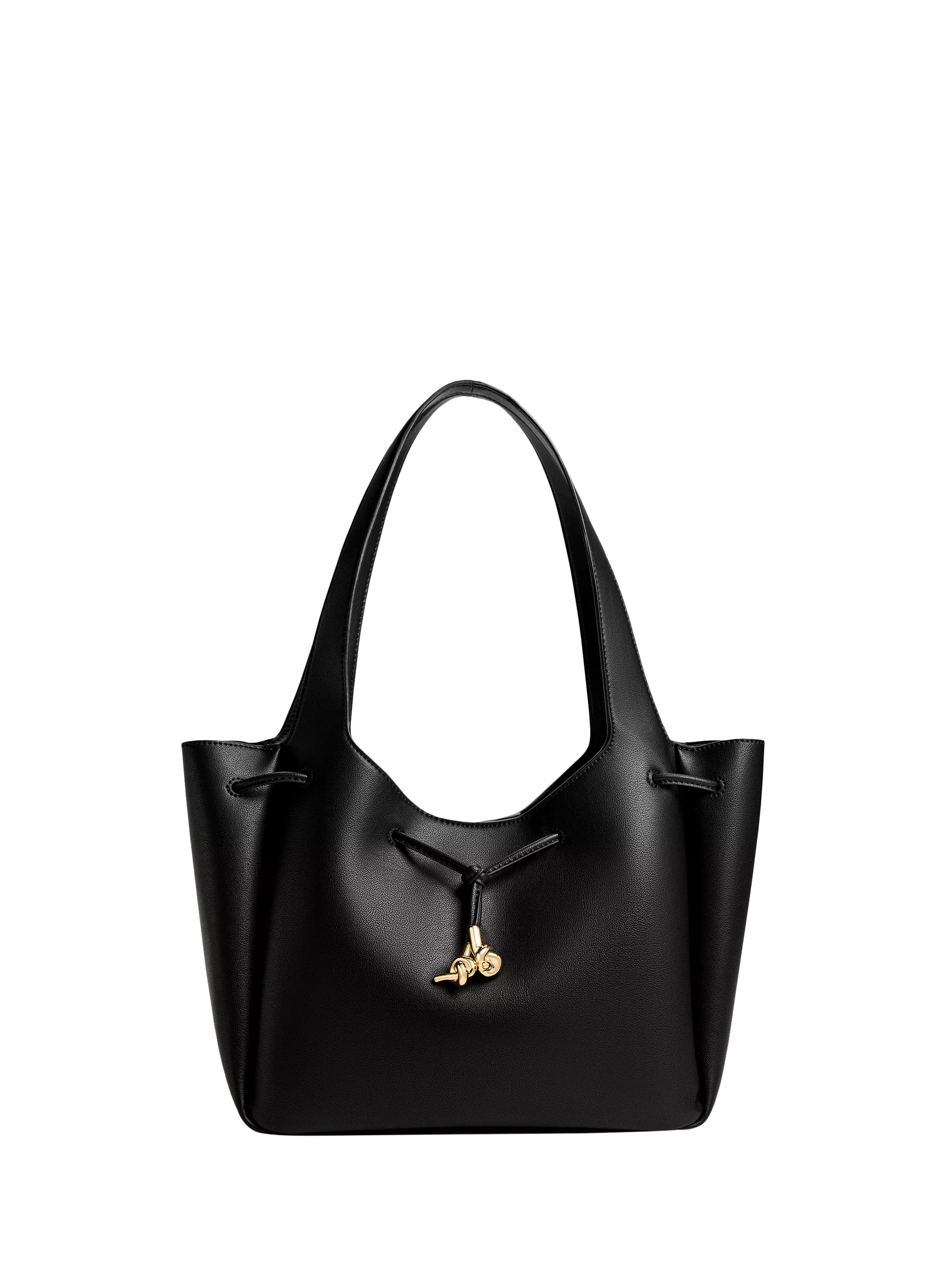 This Mila tote bag in black features metallic-knot details, a magnetic closure and a soft, slouchy silhouette. Carry it with tailored separates or neutral knits for an effortlessly refined outfit that works for both workdays and weekends.