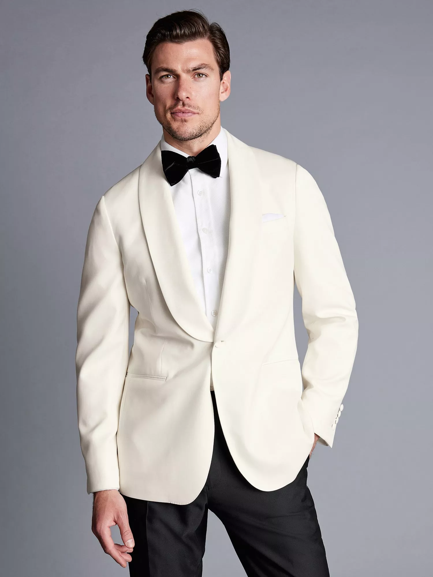 Add a twist to typical formal attire with Charles Tyrwhitt's dashing white dinner jacket.