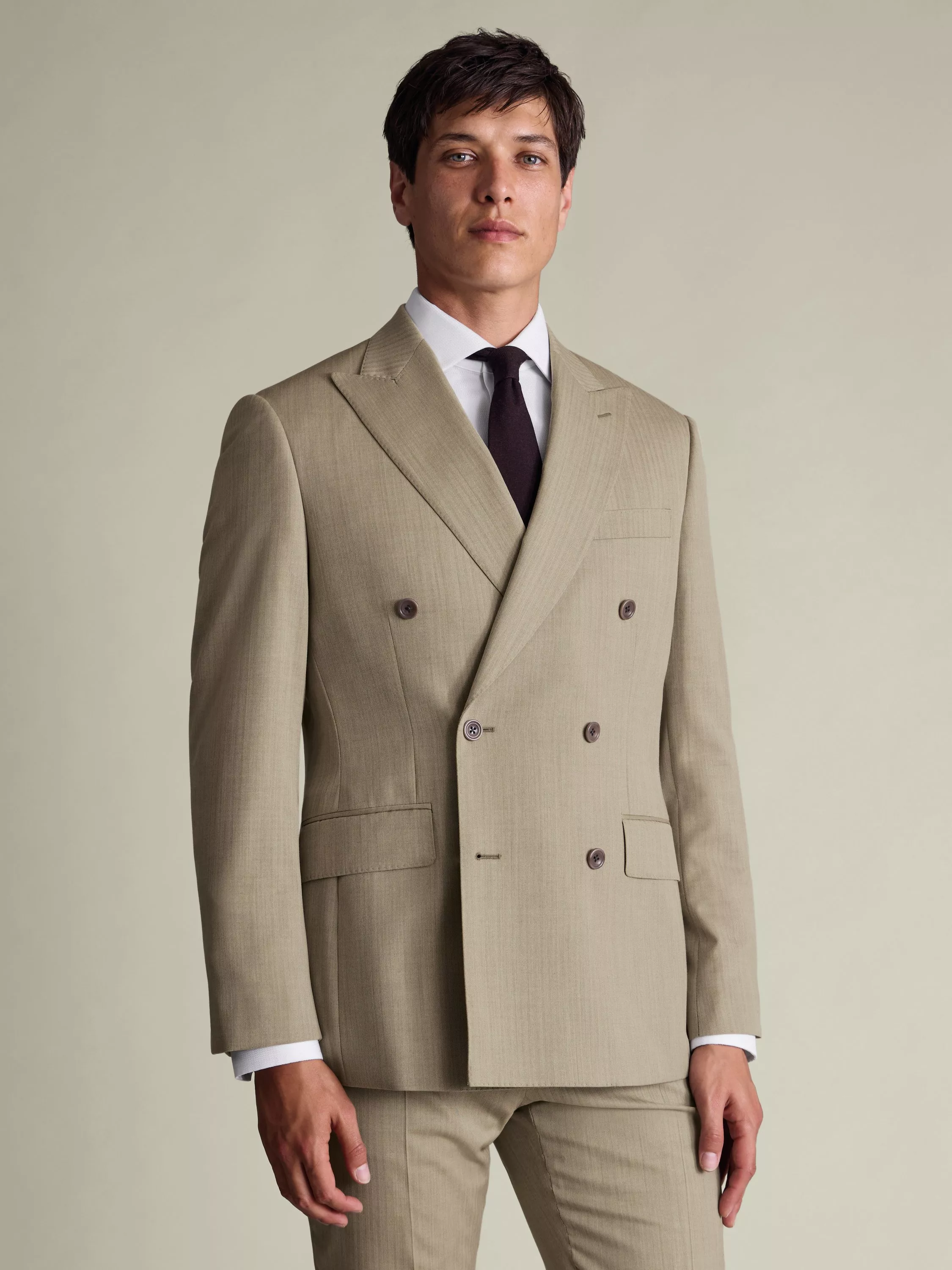 This double-breasted blazer is cut from premium wool, boasting natural stretch and crease-resistant properties. It also has a herringbone structure that enriches the style with a unique look and feel.