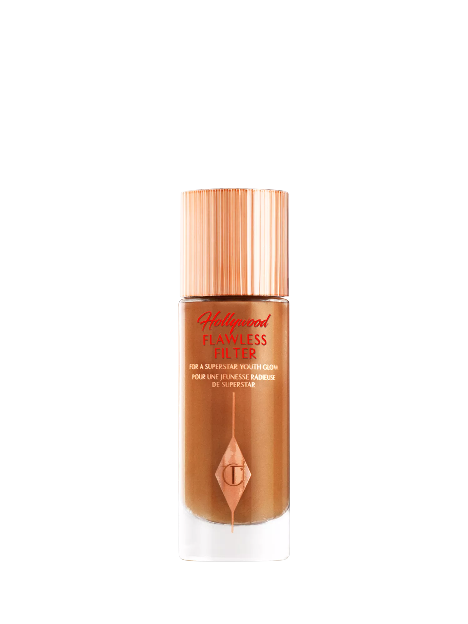 "Darlings, get your Hollywood glow on with my award-winning Hollywood Flawless Filter! Inspired by the perfecting properties of social media and illuminating effects of Hollywood lights, it blurs, smooths and illuminates for the most magical Hollywood effect glow of your life!"Get your glow on and unlock 4 ways to a flawless-looking glow by wearing Hollywood Flawless Filter alone, underneath, mixed with or on top of your favourite foundation! Not to glow prime is a beauty crime, darlings!" Charlotte Tilbury MBE.