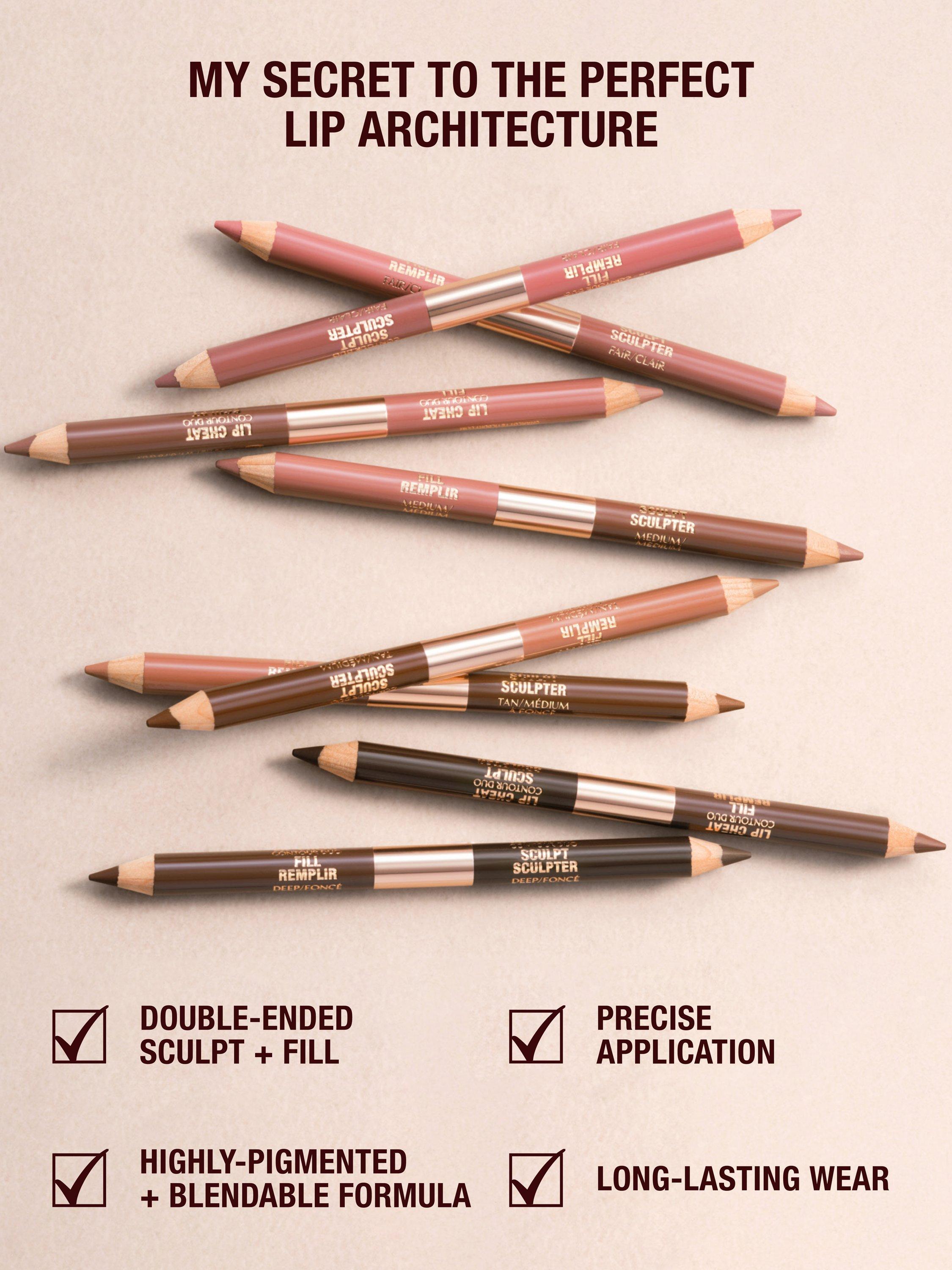 "A good nude should look good and work hard! When creating my Lip Cheat Contour Duos, I studied the nude undertones and overtones that lips of all skin tones are naturally blessed with, then formulated fair, medium, tan and deep lip liner duos with a flawless balance of beige, brown, peach and blush tones. Each shade is super-nuanced and super-intelligent, creating super-wearable looks that beautify every complexion, whether you have fair, medium, or deep skin, from cool to warm." Charlotte Tilbury MBE.