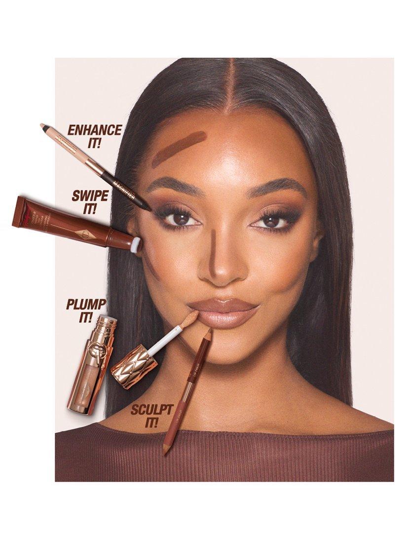 - Sculpt End: Define, contour and sculpt by tracing along the outer edge of your natural lip line and gently diffuse using your fingertip or a lip brush. Overline to cheat a fuller-looking lip shape