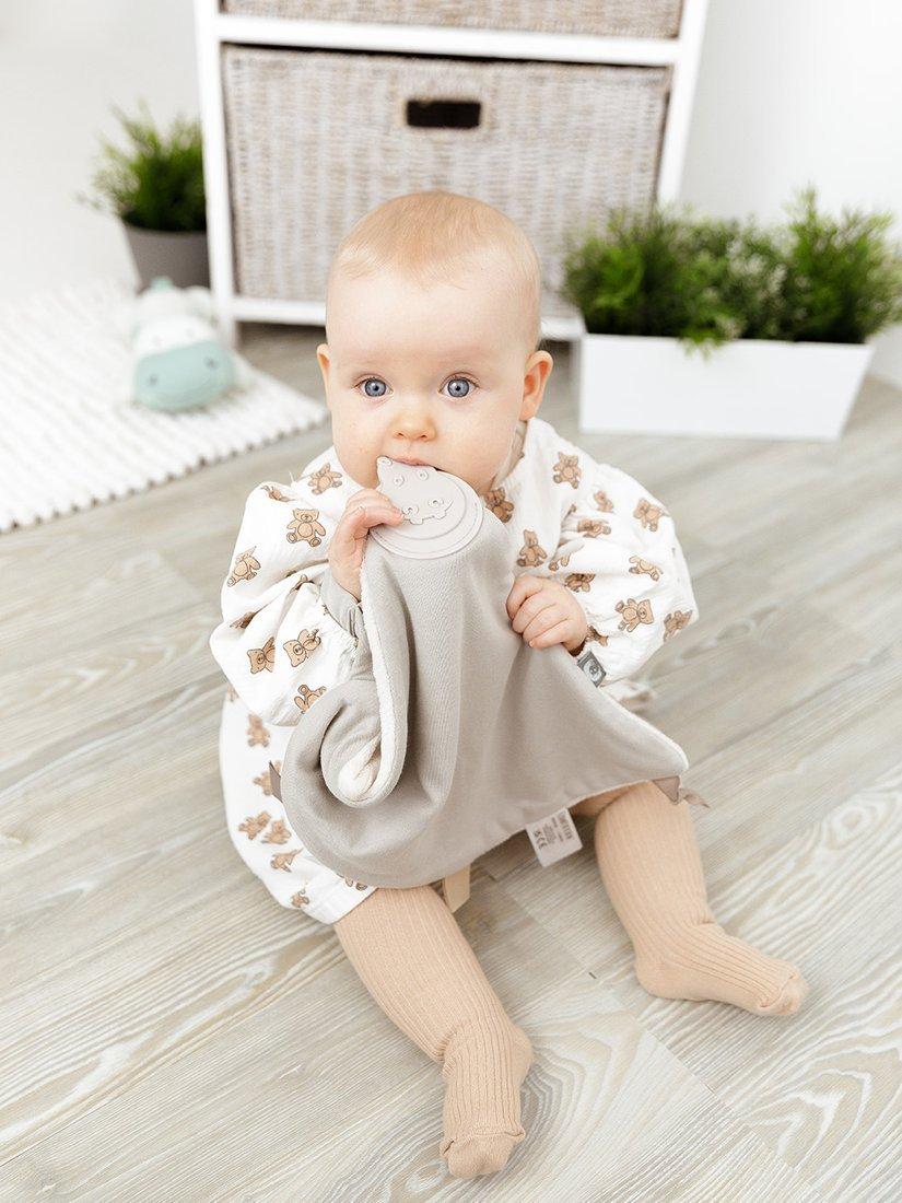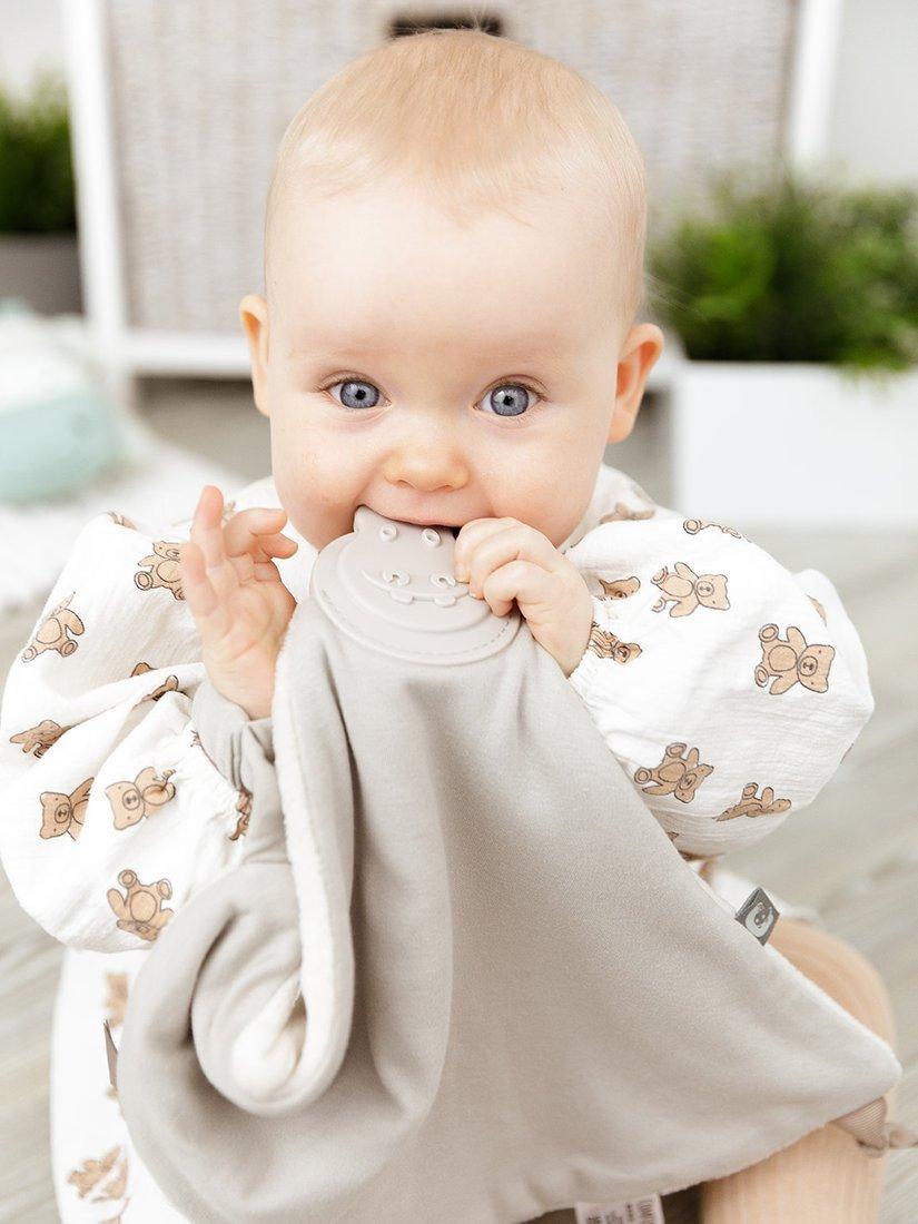 Perfect for sensory development, this comforter is super soft and snuggly, with an attached teether. It has everything you need to stimulate and soothe your little one. The soft, textured teether gives a great 'bite', using an innovative, dimpled design to massage and soothe tender gums and encourage new teeth to break through. With super-soft jersey cotton and cuddle fleece that's delicate on young skin, the Comfortchew combines baby's favourite essentials - comforter, teether, sensory tags, and a soft feel similar to that of their favourite teddy.