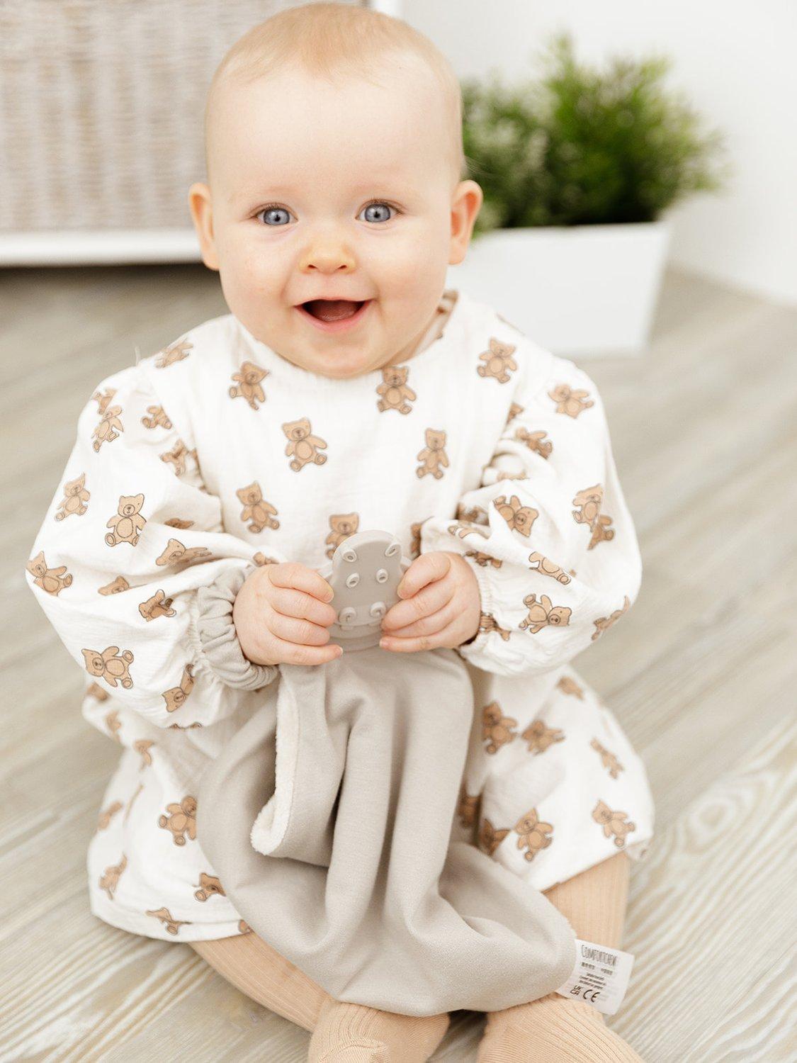 - Front: 100% organic cotton, Back 100% polyester, Teether: food grade silicone