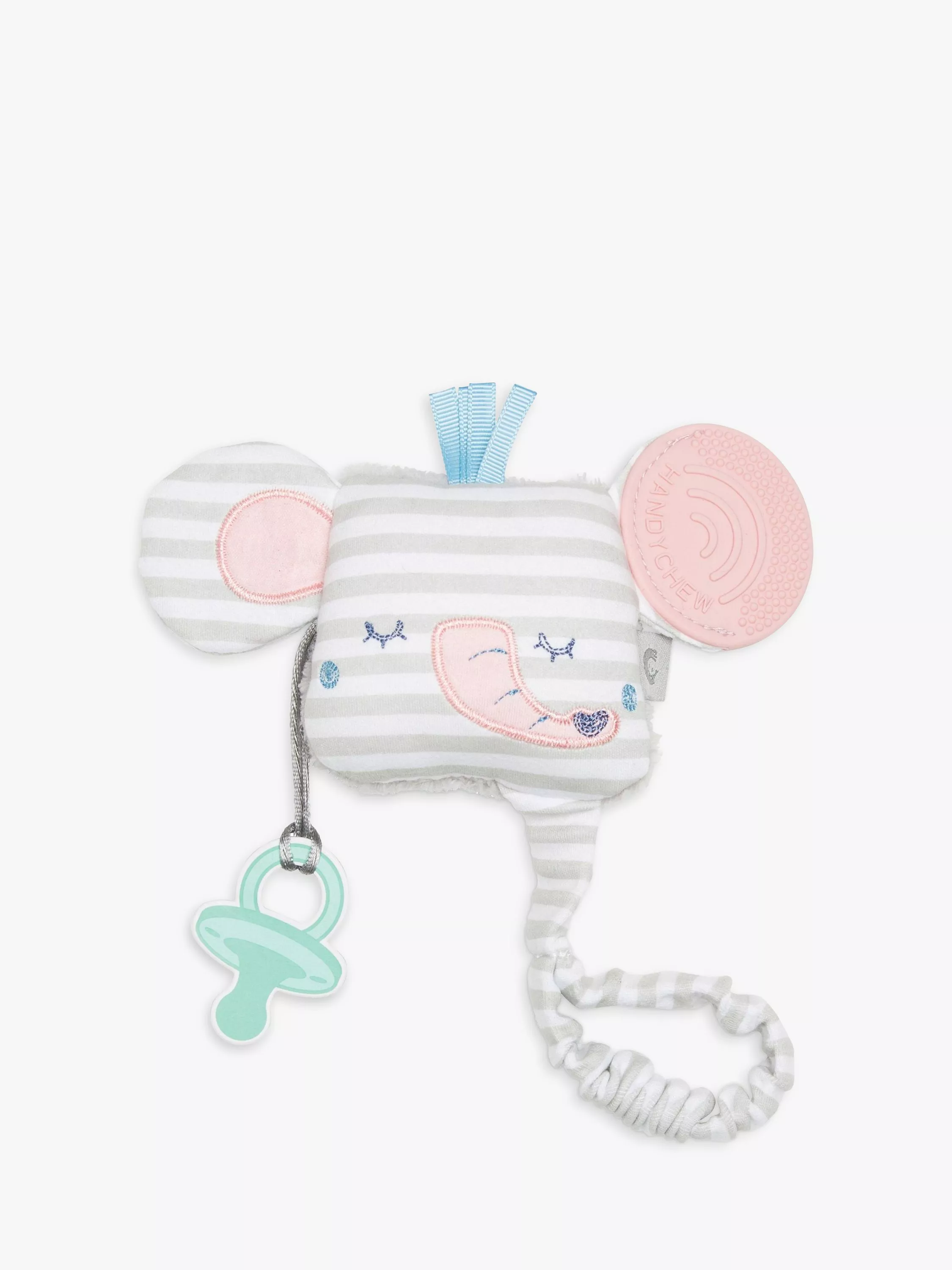 Bursting with sensory features that your little one will love, this compact teething toy features a crinkly ear to play with, a rattle to shake with an attachable handle and dummy link for a safe, satisfying chew.