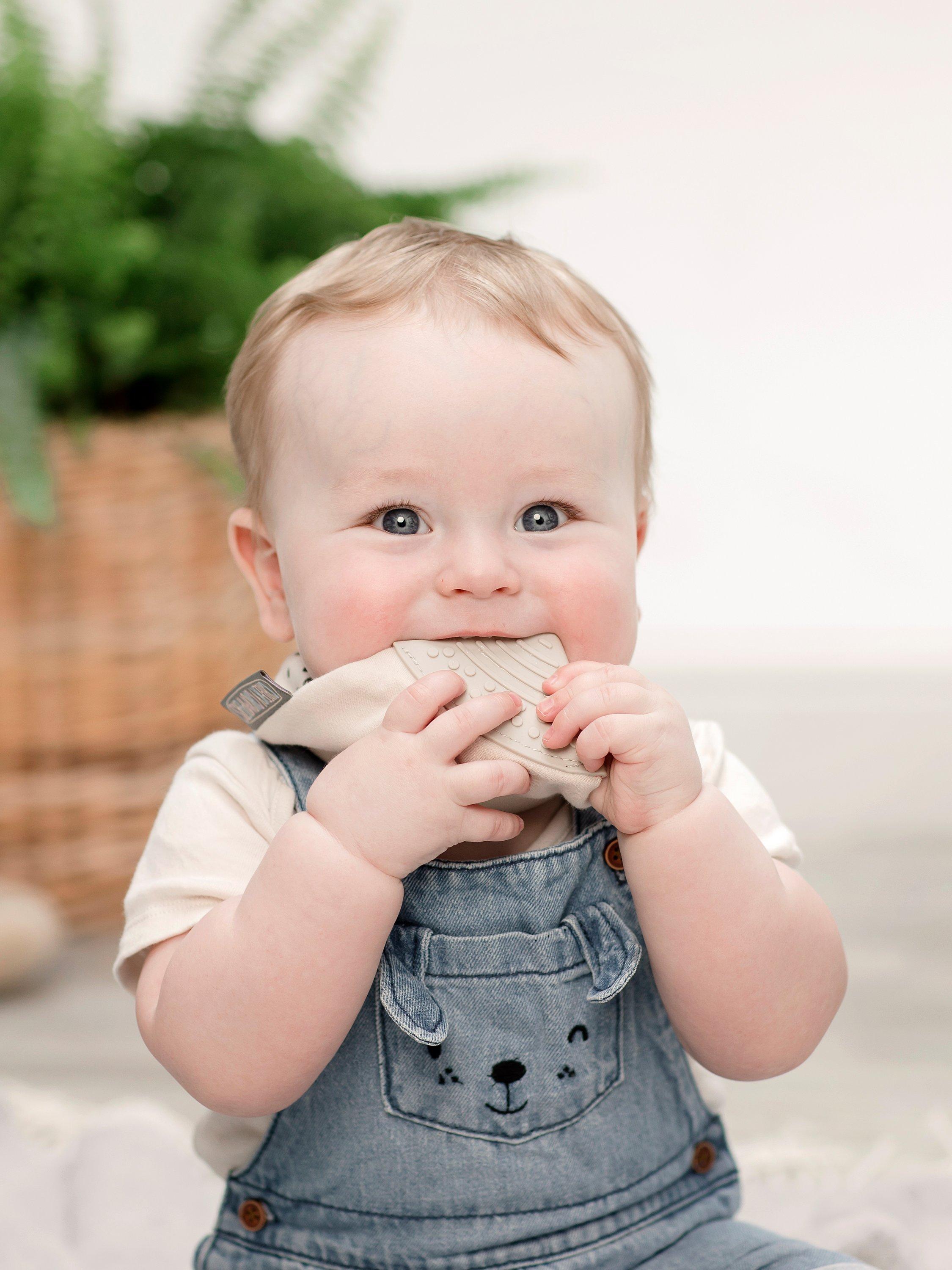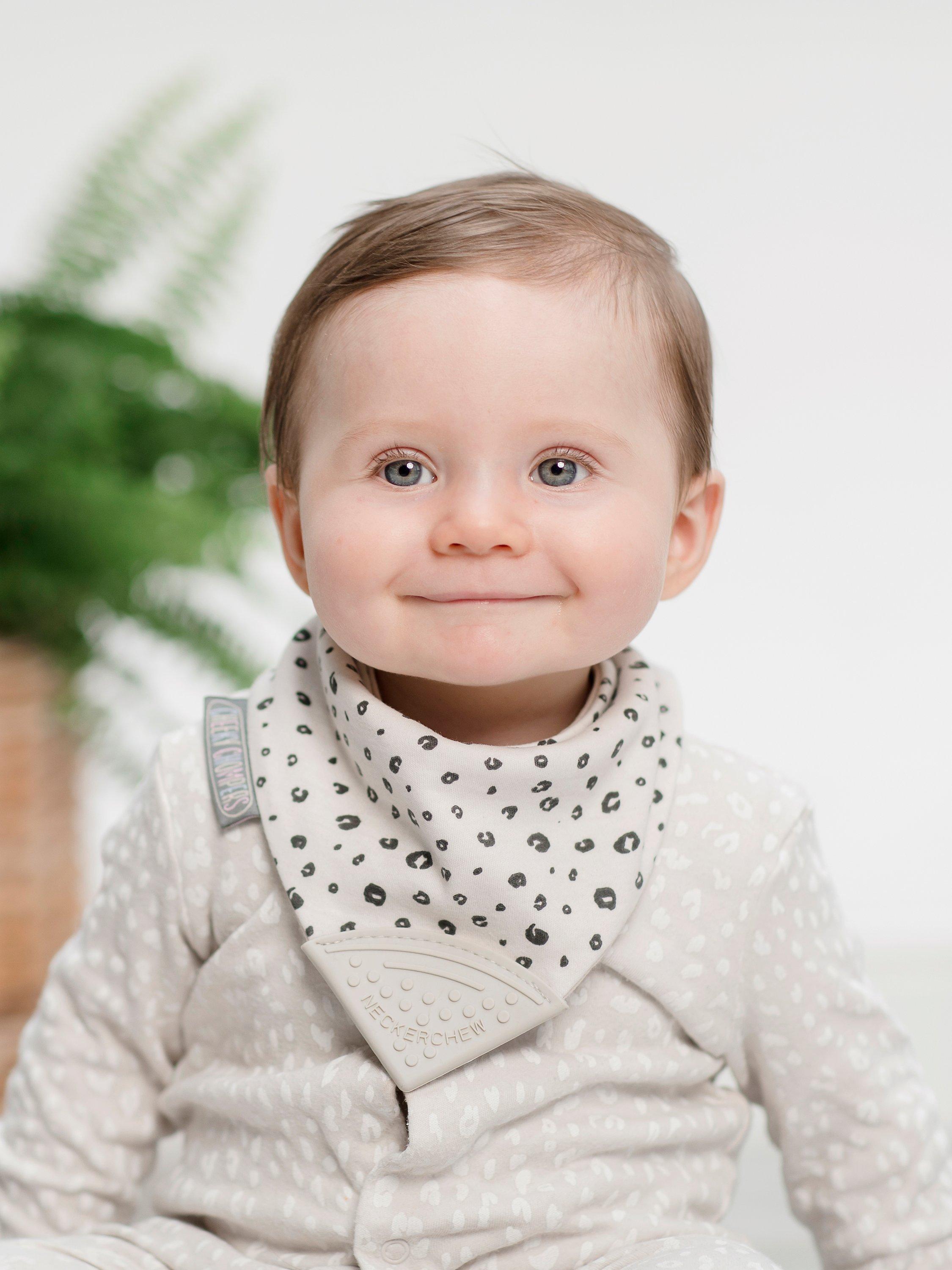 This award-winning teething dribble bib, the Neckerchew from Cheeky Chompers, helps keep teething babies dry while offering a safe silicone corner for them to chew on.