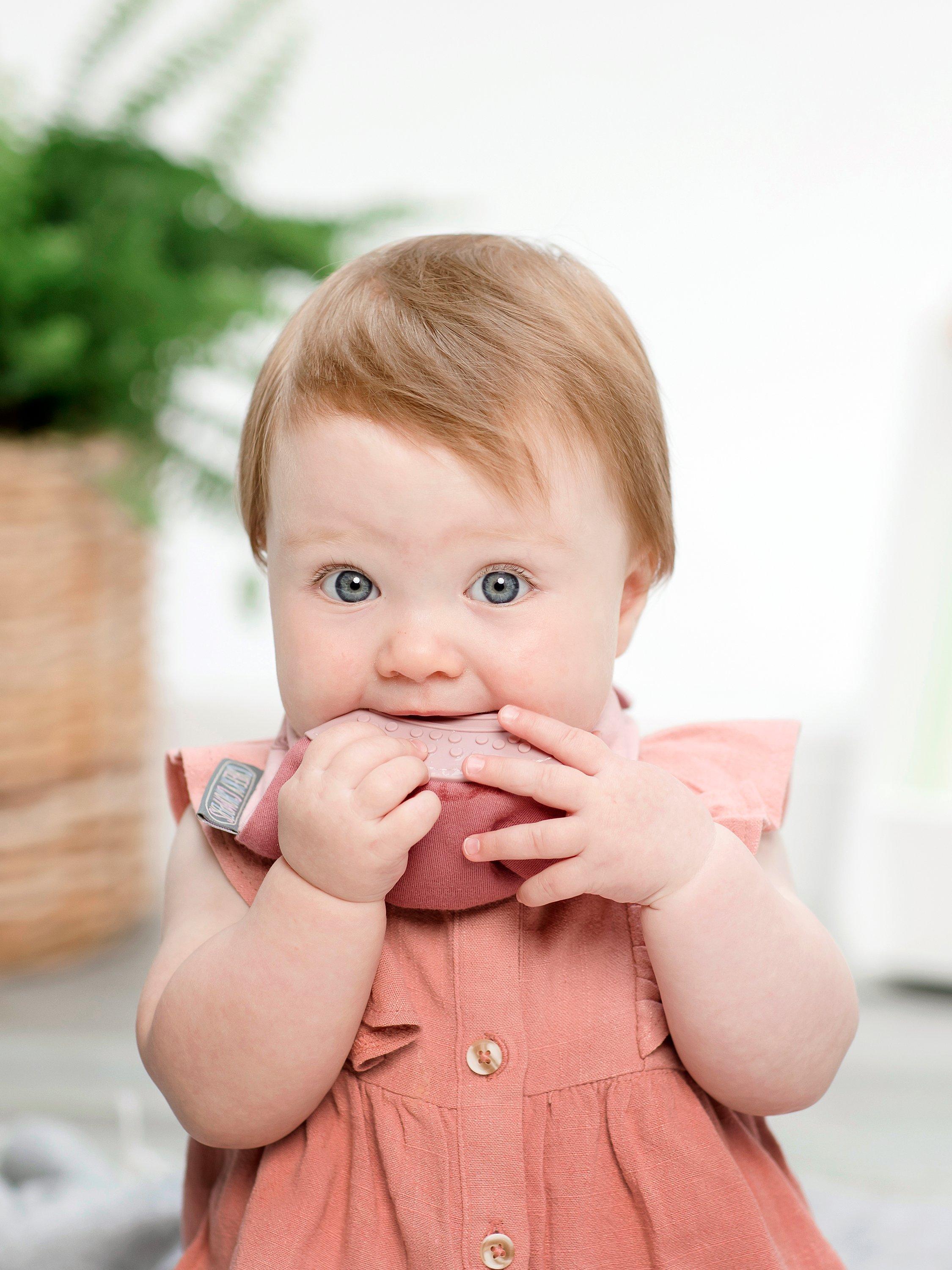 This award-winning teething dribble bib, the Neckerchew from Cheeky Chompers, helps keep teething babies dry while offering a safe silicone corner for them to chew on.