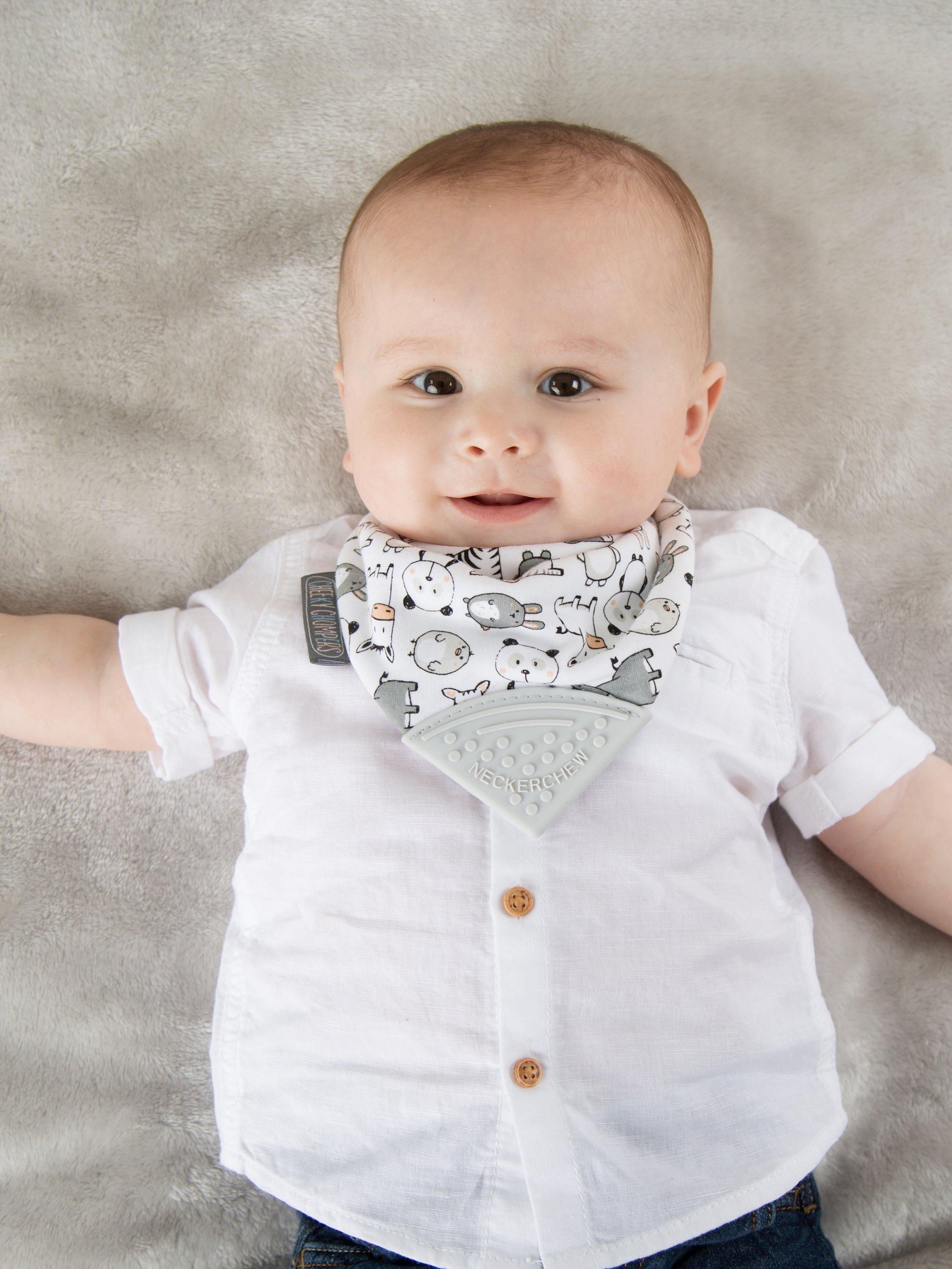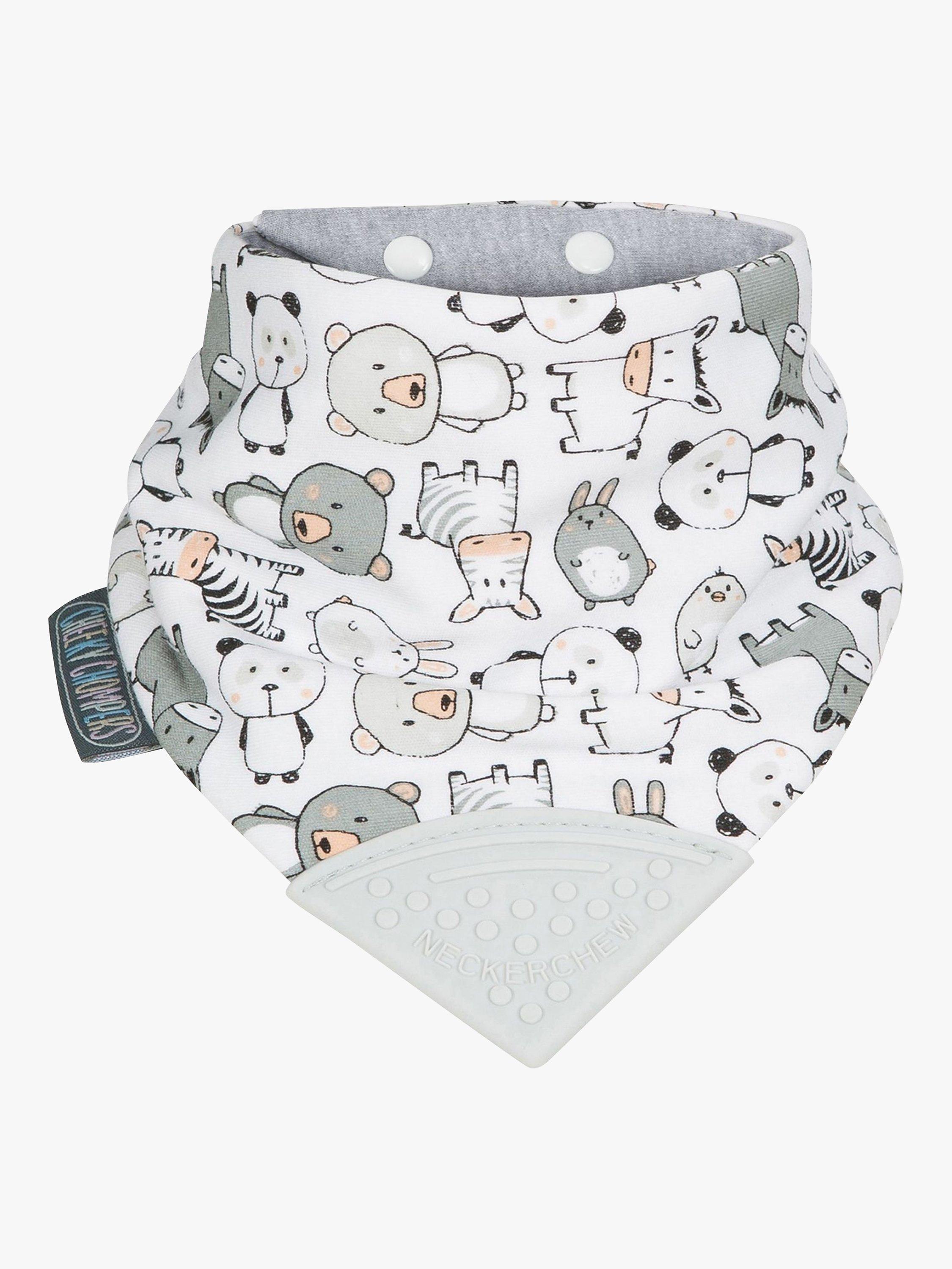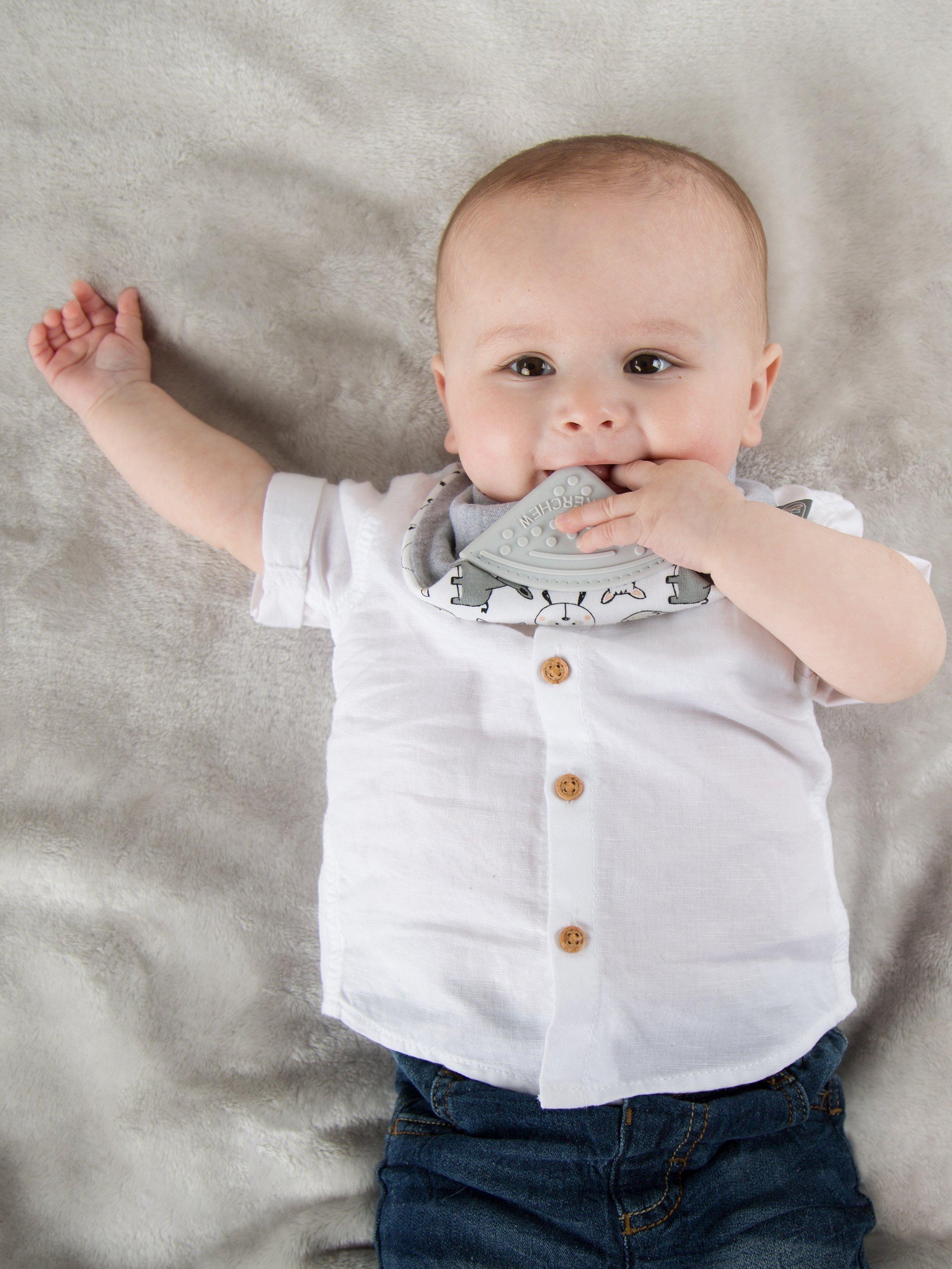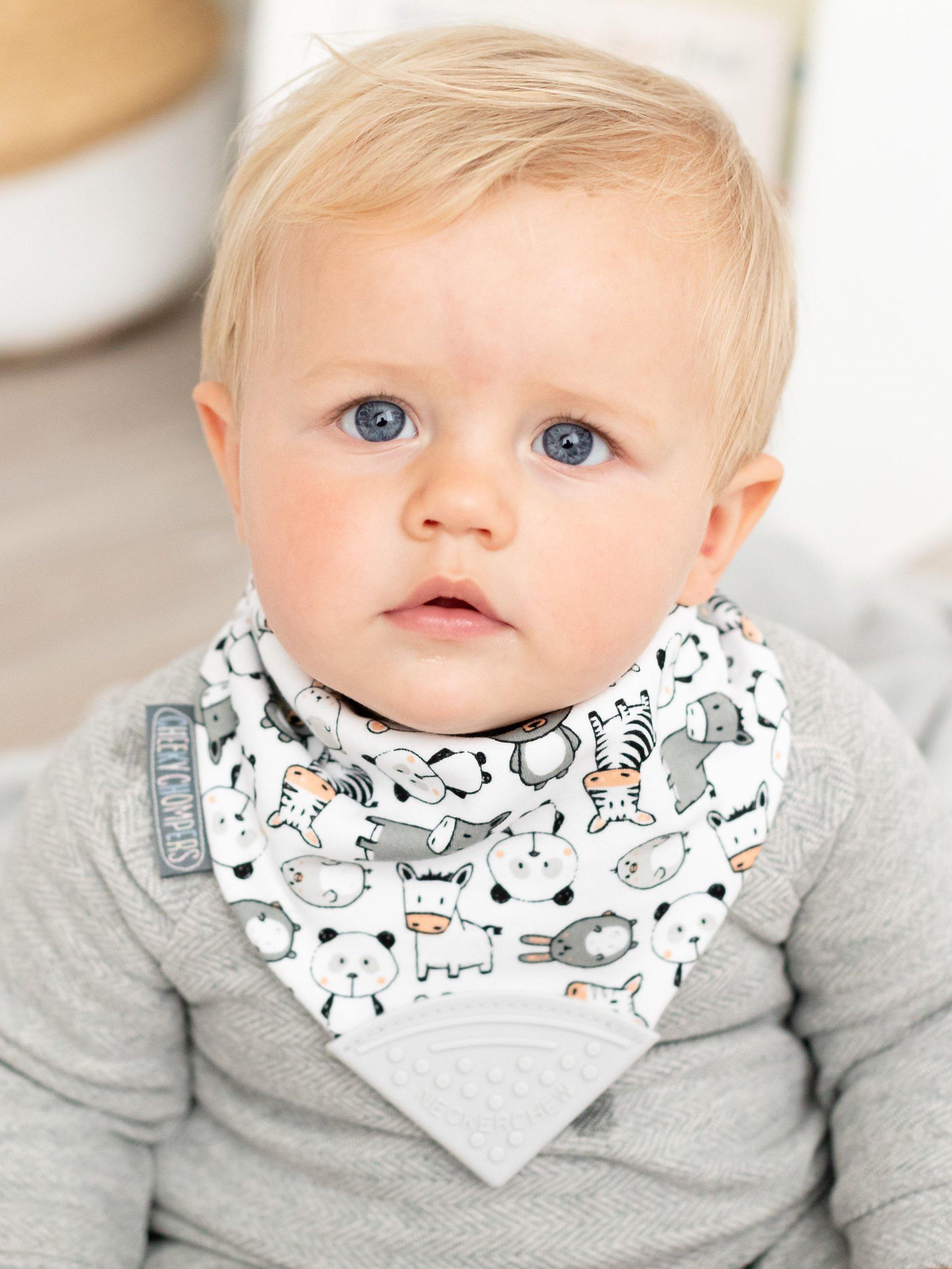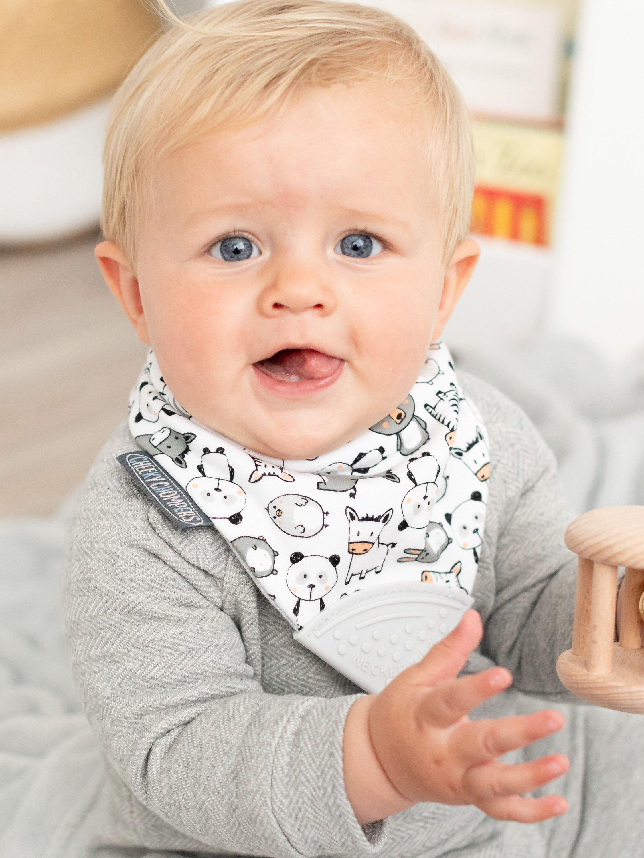 This Award Winning teething dribble bib, the Neckerchew from Cheeky Chompers, helps keep teething babies dry while offering a safe silicone corner for them to chew on.