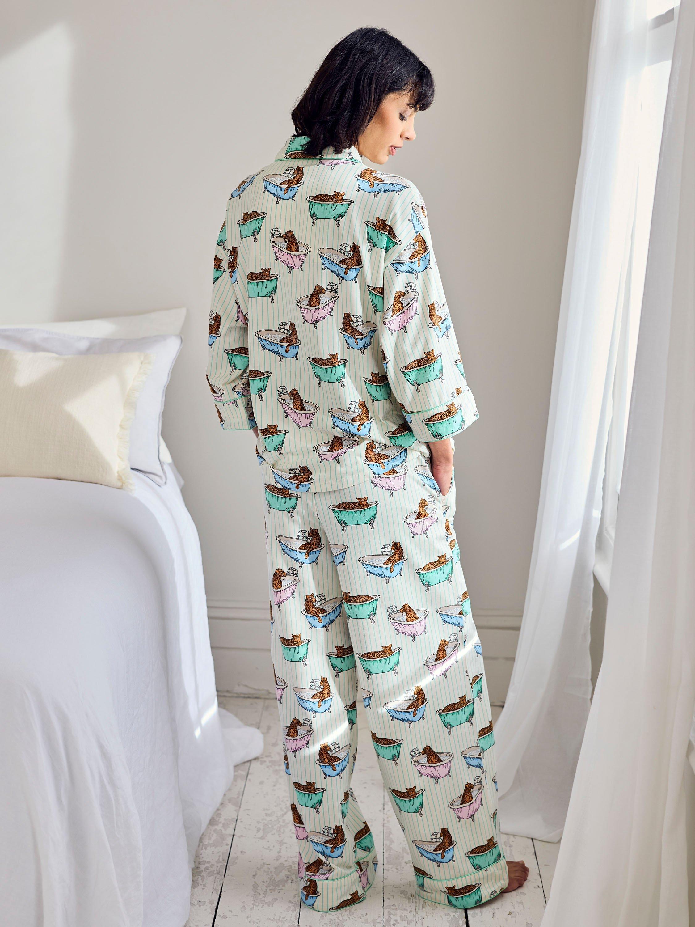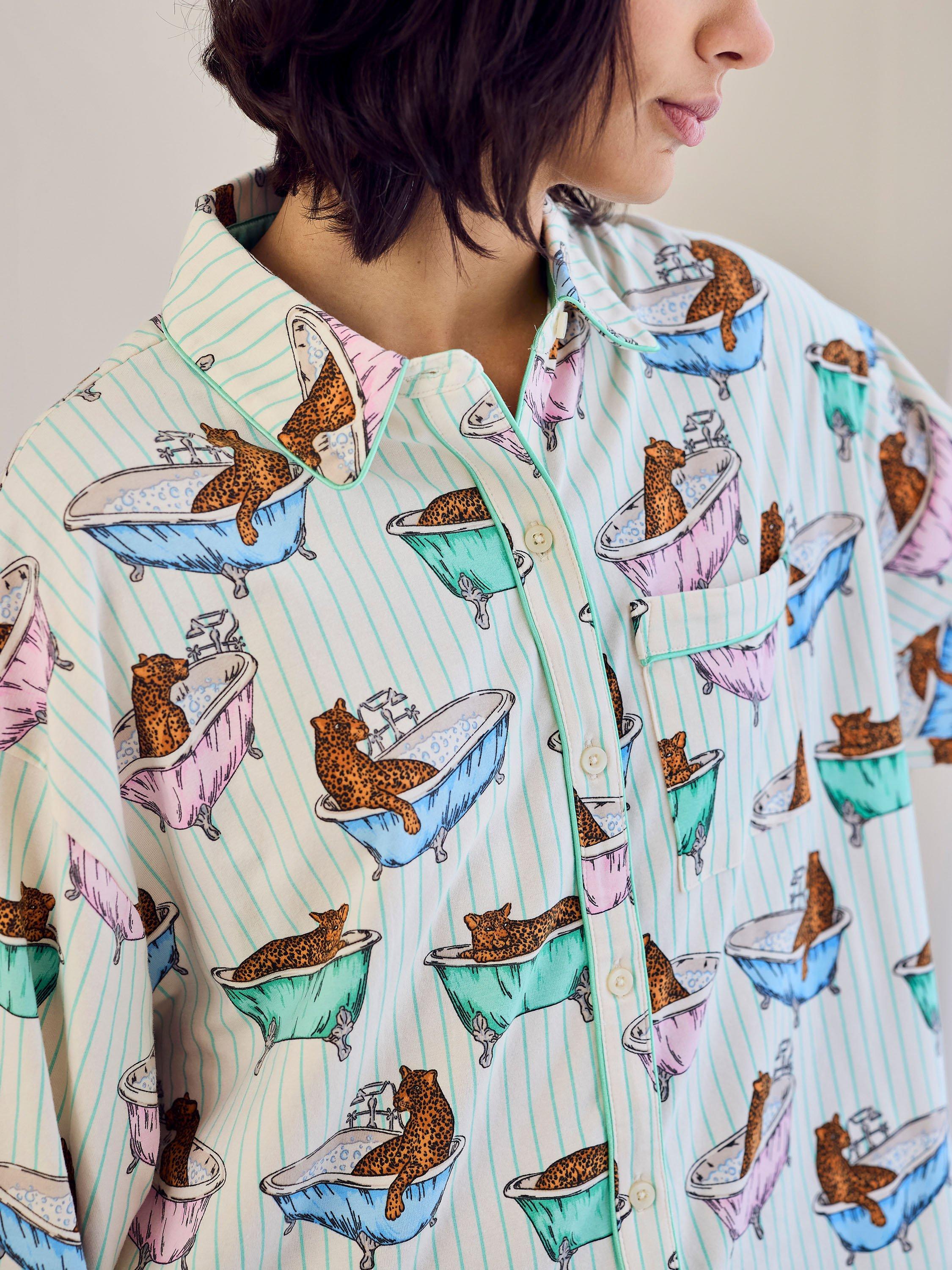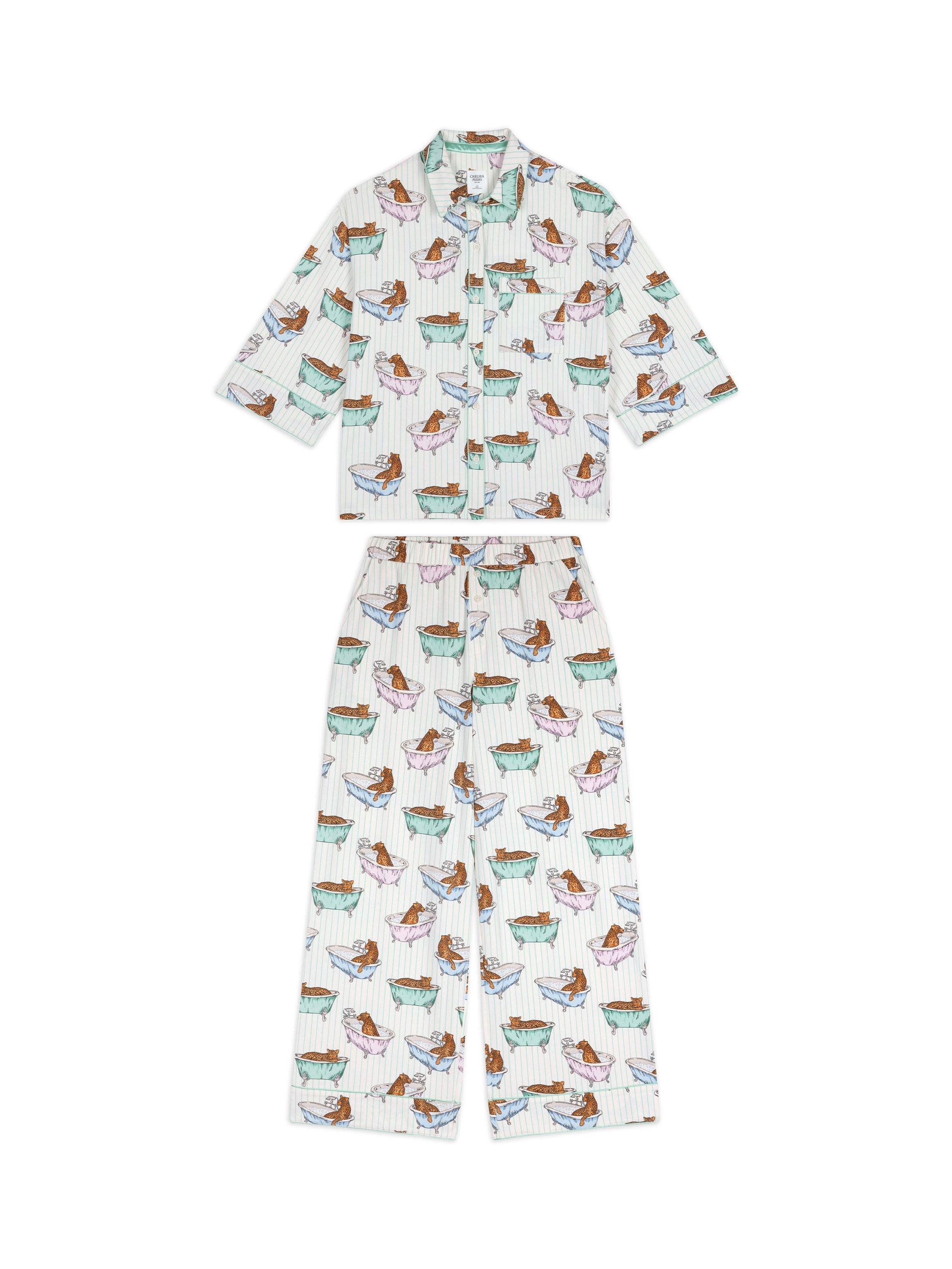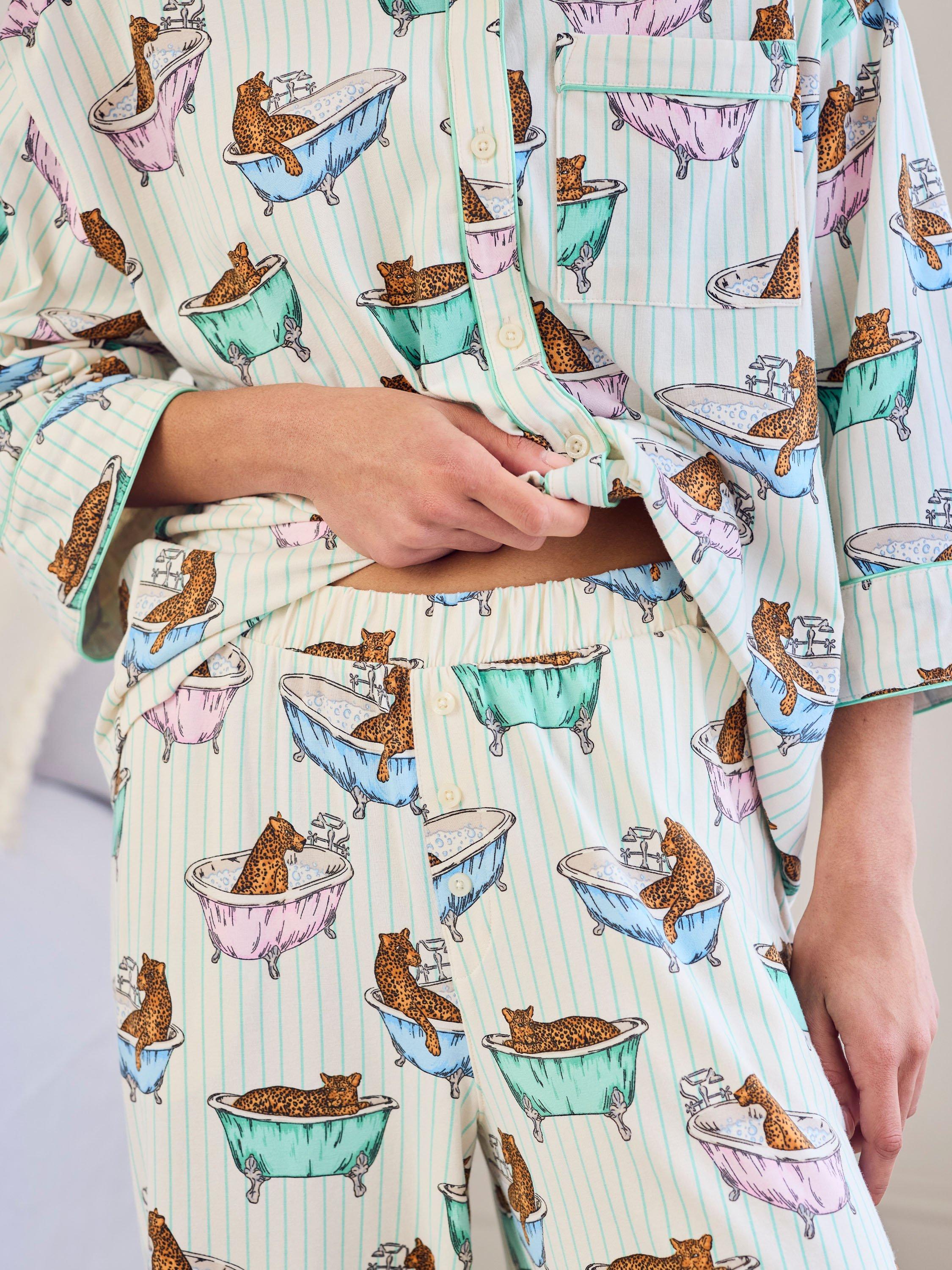 Bathtime bliss meets bedtime comfort in this much-loved set, printed with lounging leopards on a stripe base. Made from cotton with gentle stretch, this long-sleeved set features contrast piping, relaxed silhouettes and boxer-style shorts for a playful finish. It’s your excuse to slow down, leopard-style.