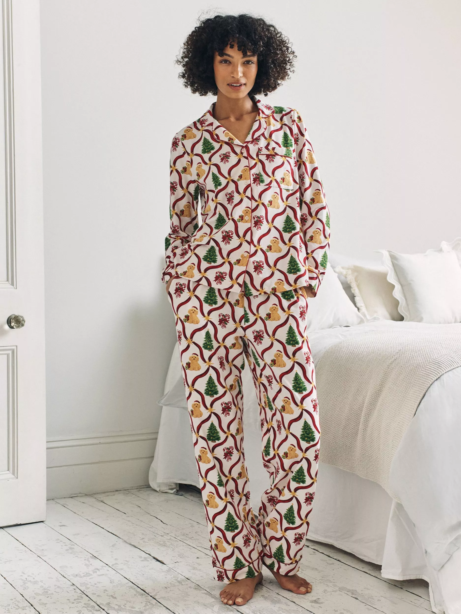 Festive, flattering and forever soft. Playful yet polished, this pyjama set is printed with hand-drawn diamonds of cockapoo dogs, candy canes, gold bells and fir trees tied up in ribbon grids. A nostalgic yet modern take on festive prints, perfect for Christmas lounging and memory-making. Crafted from soft cotton jersey with a revere collar, tonal piping and relaxed bottoms with pockets, this set is designed to match with partners, kids and even pets for the ultimate Christmas morning photo.
