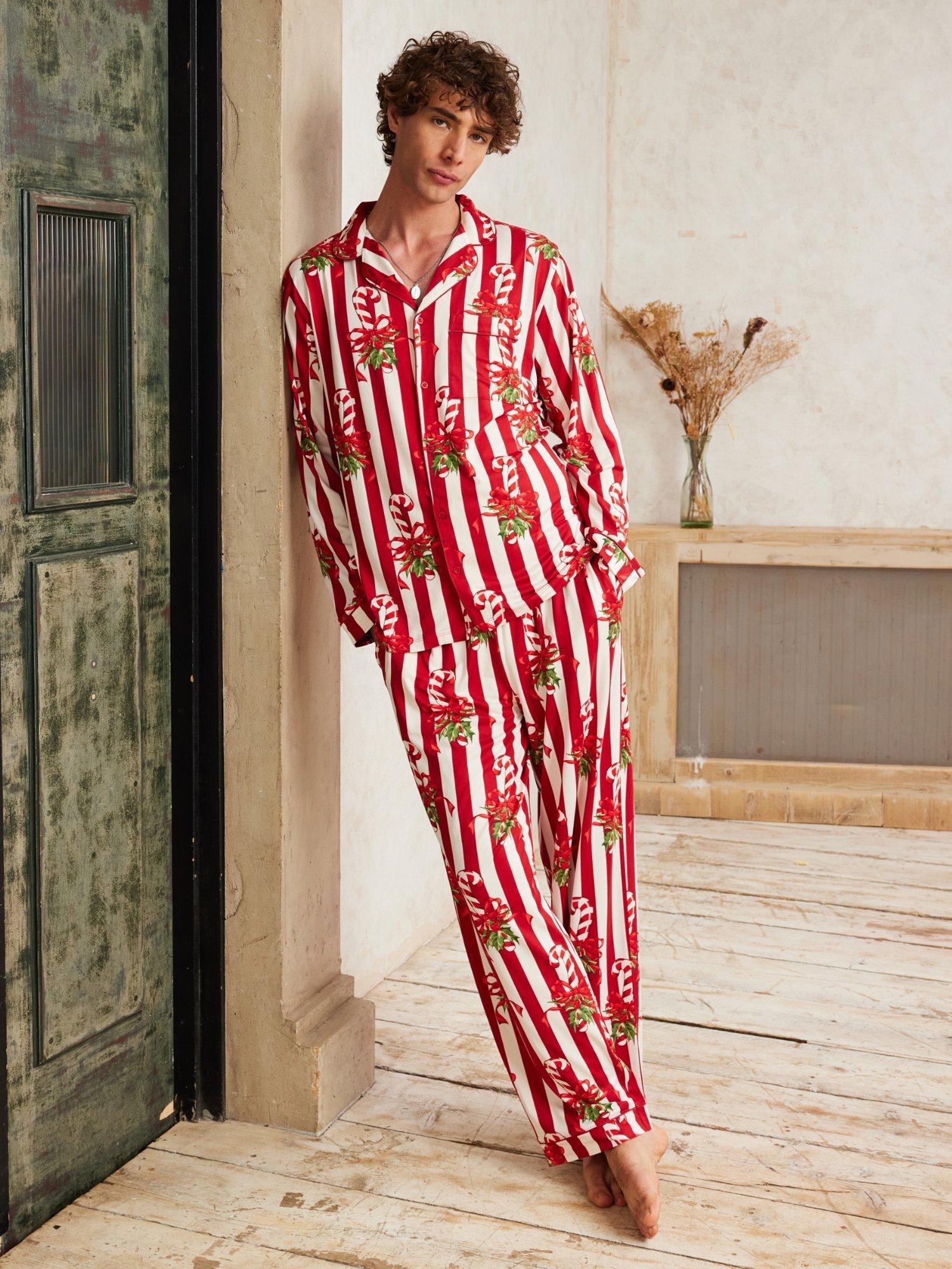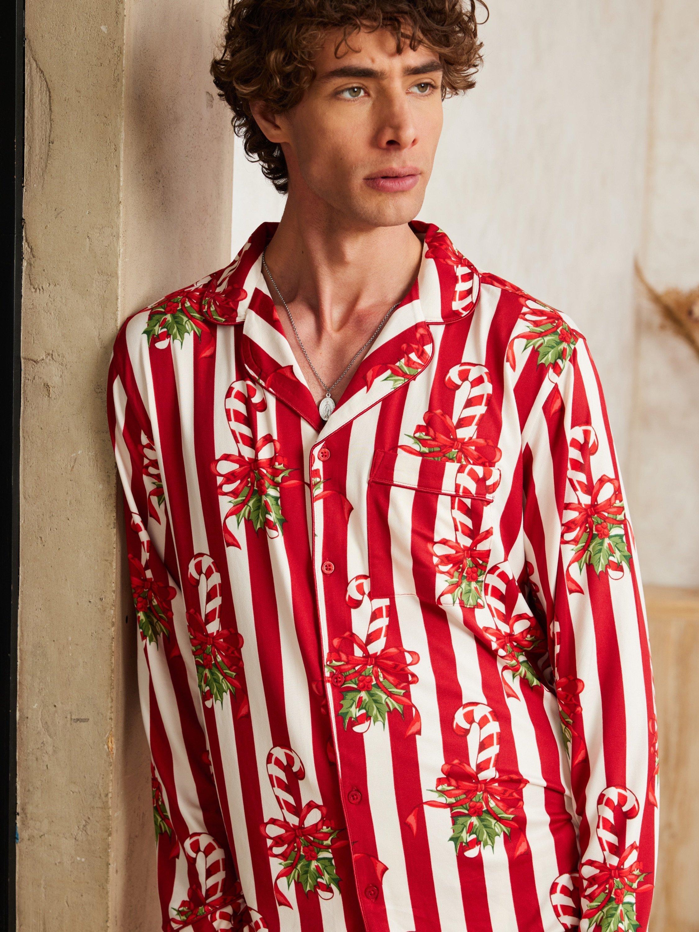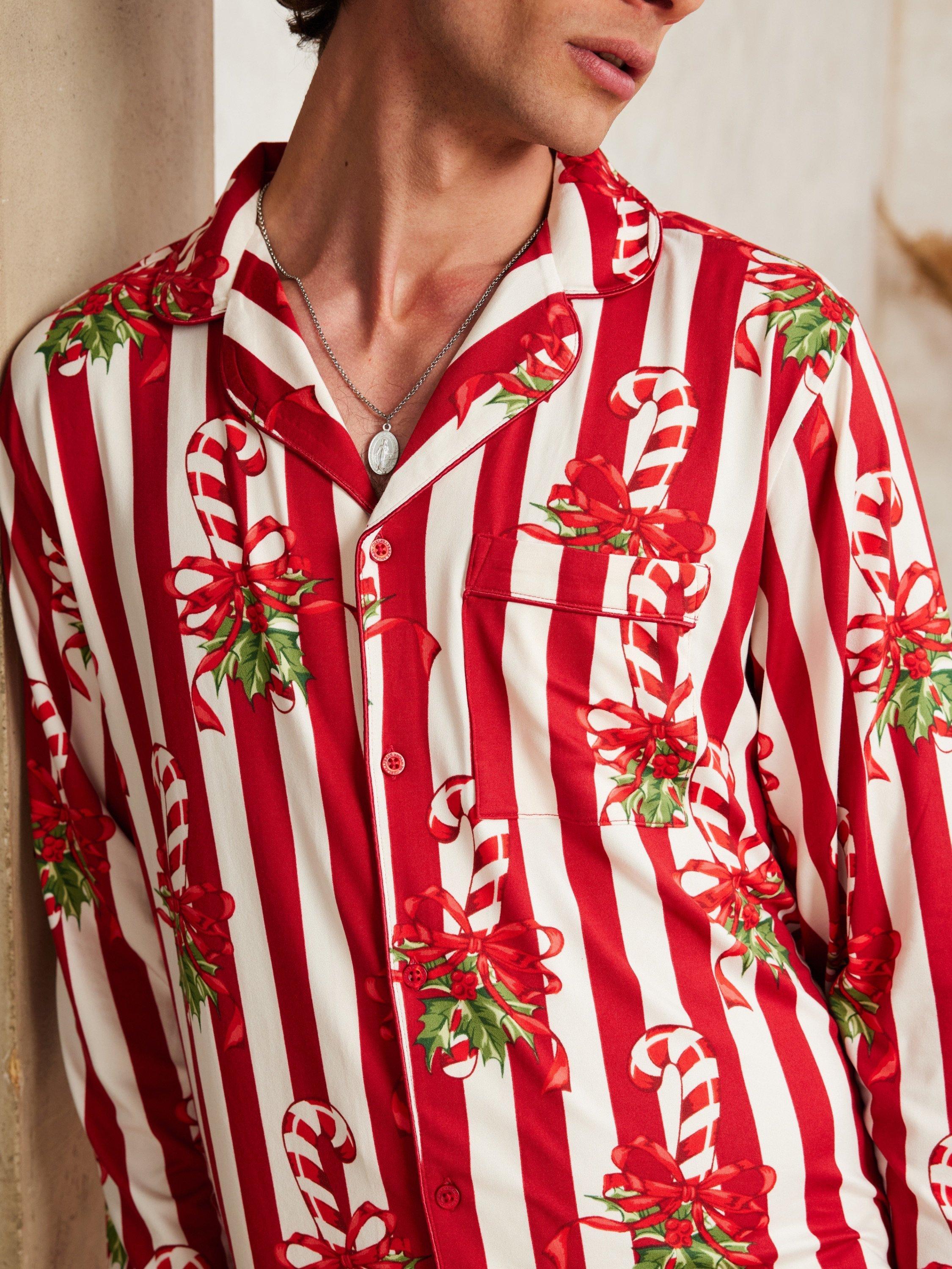 Crafted from soft and stretchy recycled fibres jersey fabric, this classic button up style pyjama set comes in a Christmas print, hand-drawn in London by Chelsea Peers' design team. On a background of red and white stripes, those favourite Xmas sweet treats, candy canes, are tied up with red ribbon bows and a sprig of festive foliage!
