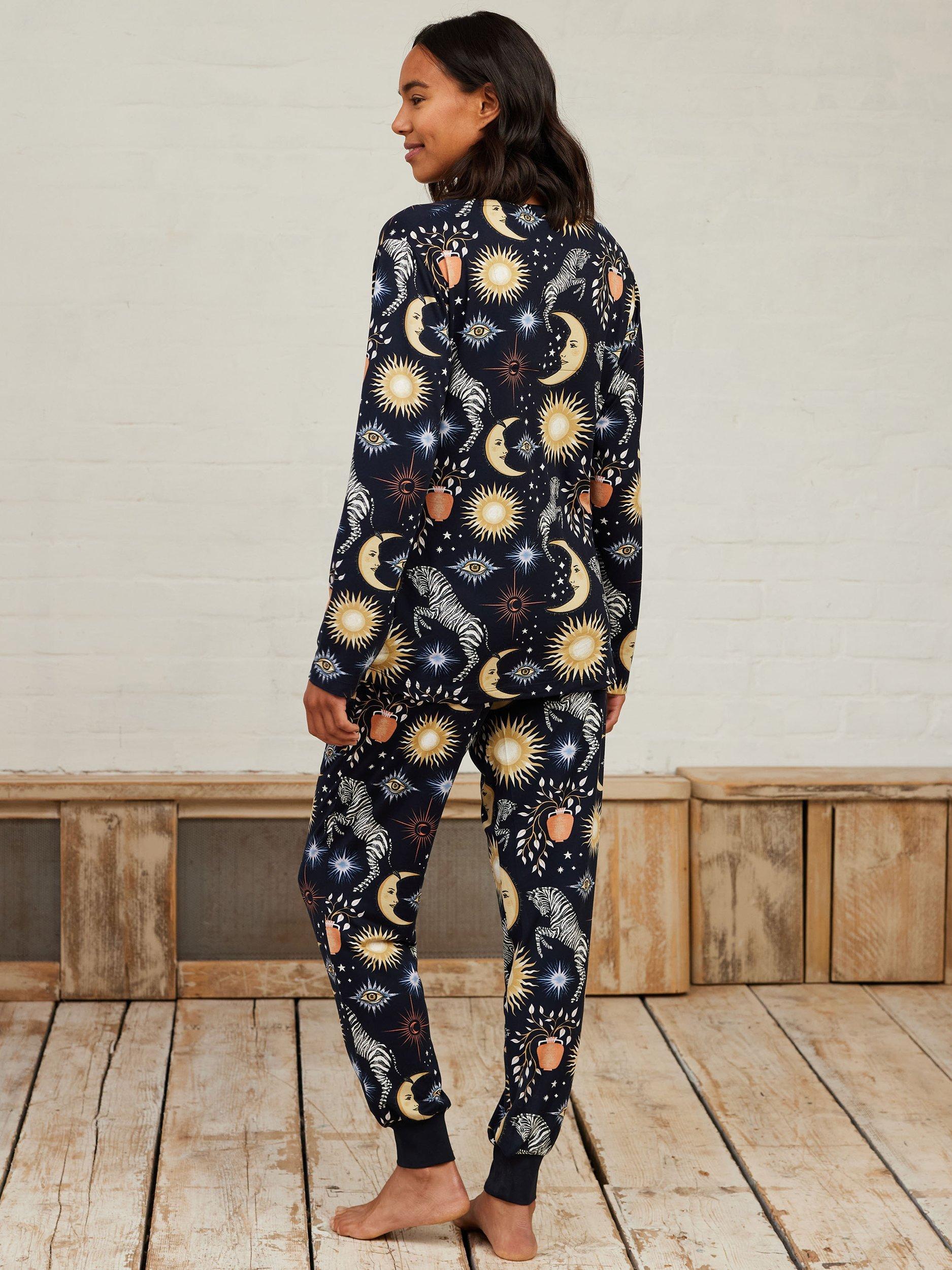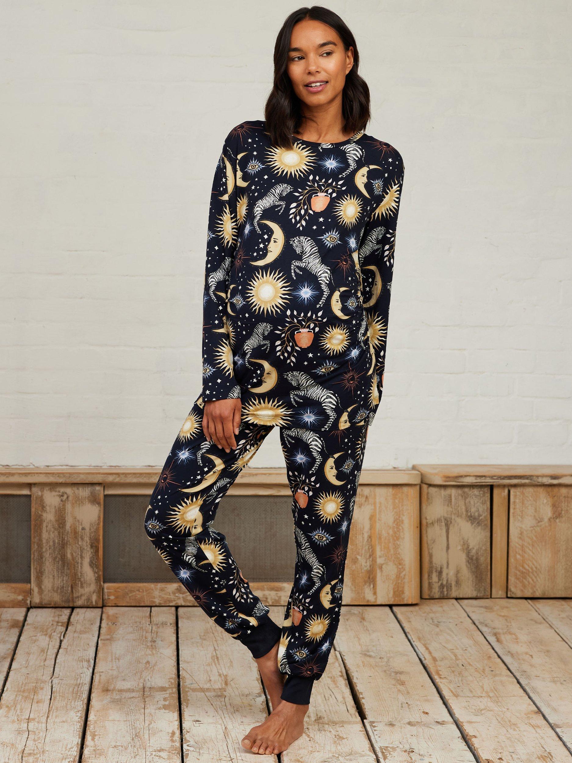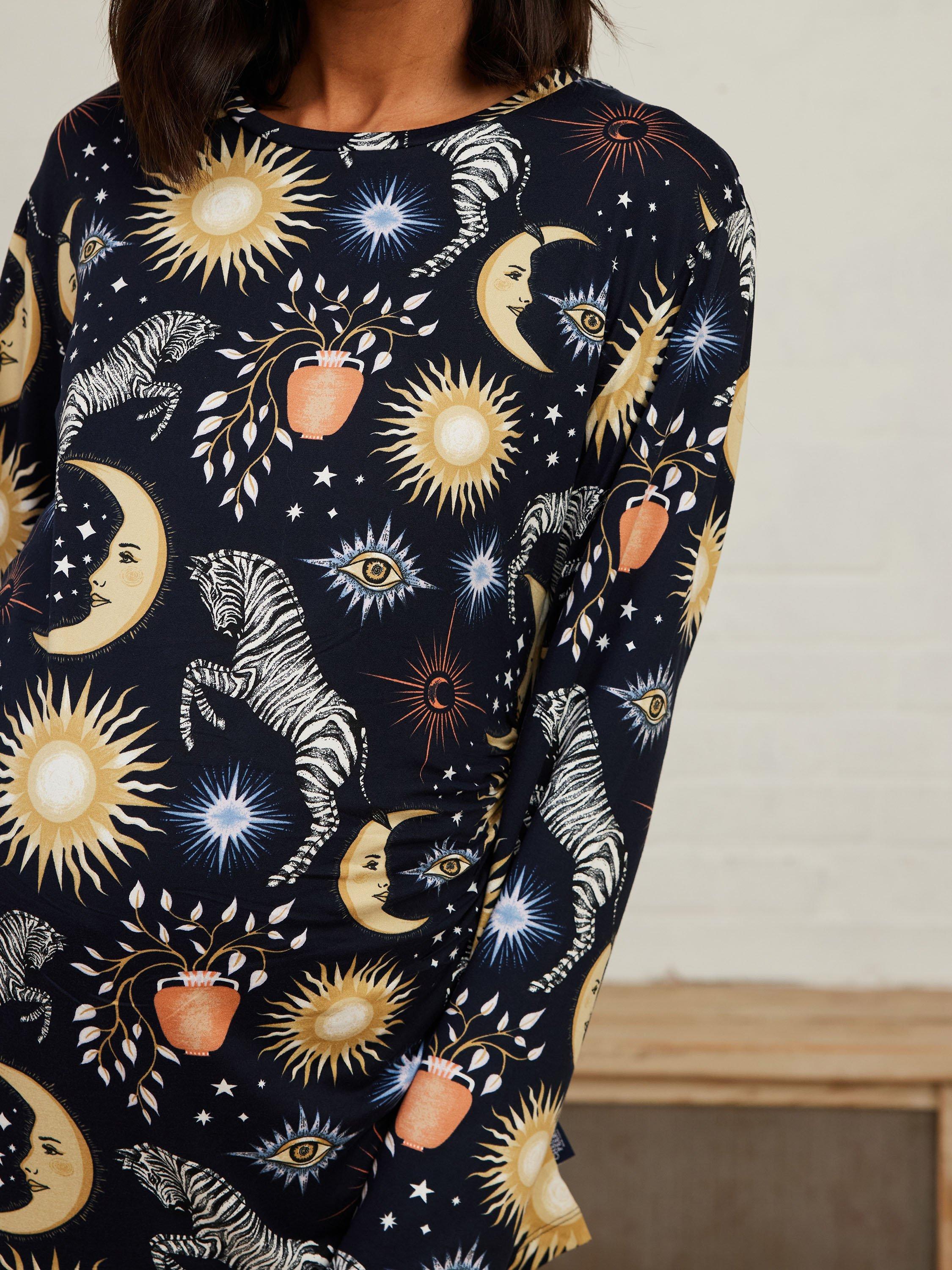 Hand-drawn by our team of London designers, this intricate print filled with suns, moons, stars and wild zebras takes inspiration from surrealist artists. On stretchy recycled fibre jersey knit fabric, unparalleled for it's softness, this celestial set features a full coverage over bump band for a perfect fit through every week of pregnancy.