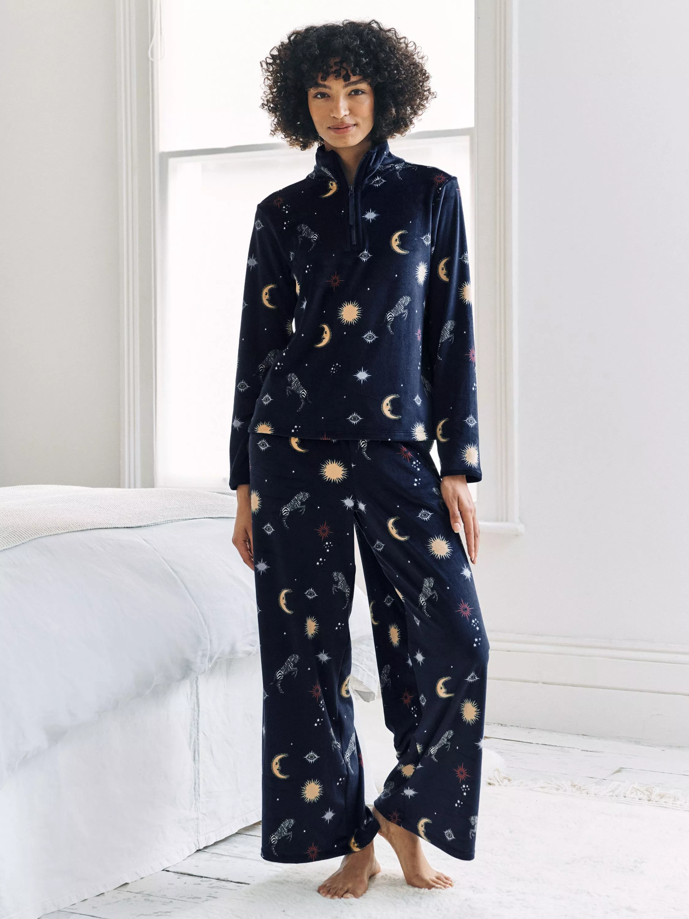 Slip into comfort with this zebra celestial print lounge set from Chelsea Peers featuring a zip neck fleece and uncuffed trousers. Designed for restful nights and leisurely mornings, they offer a relaxed fit that lets you unwind and enjoy a moment that is truly yours.