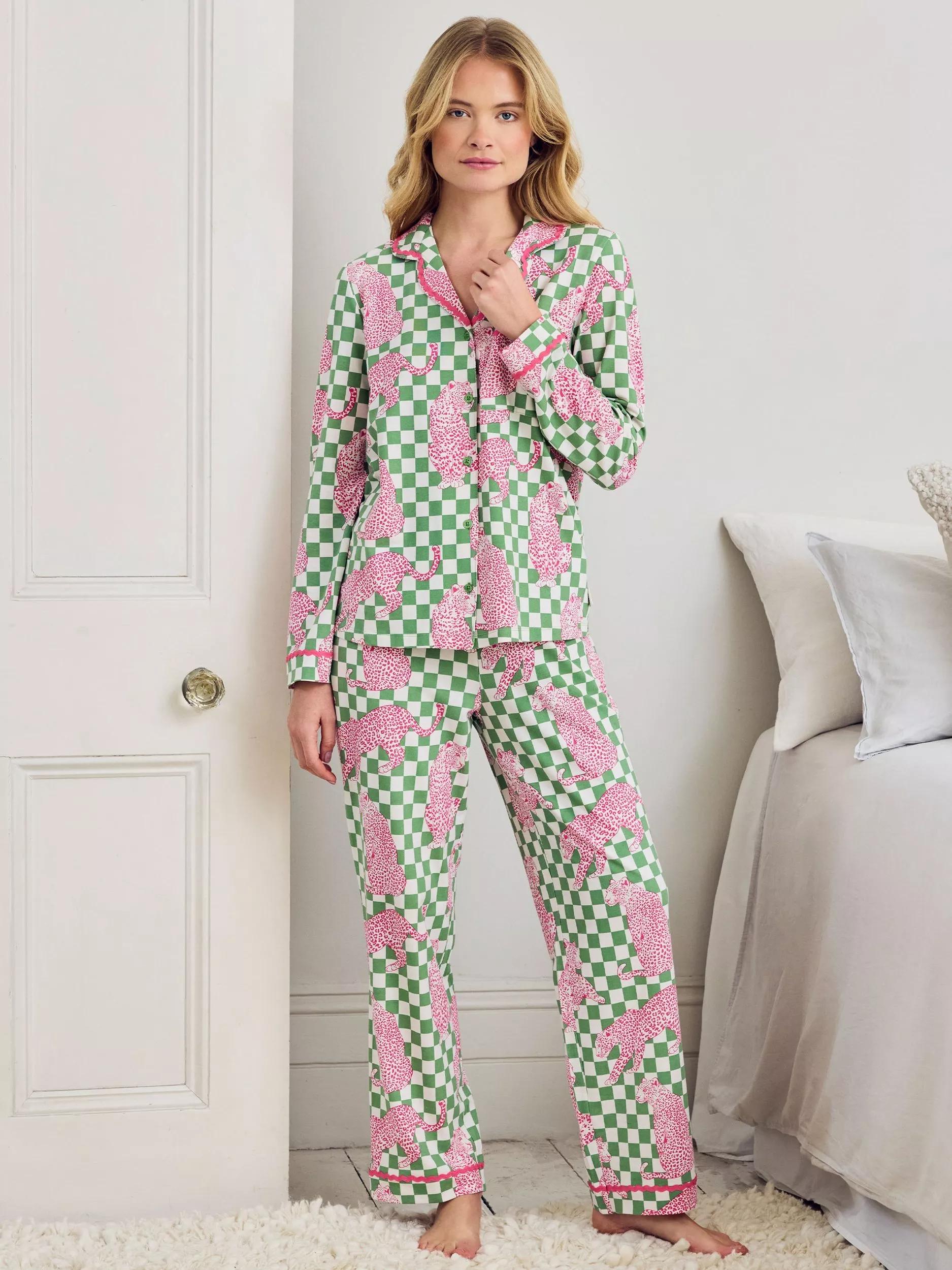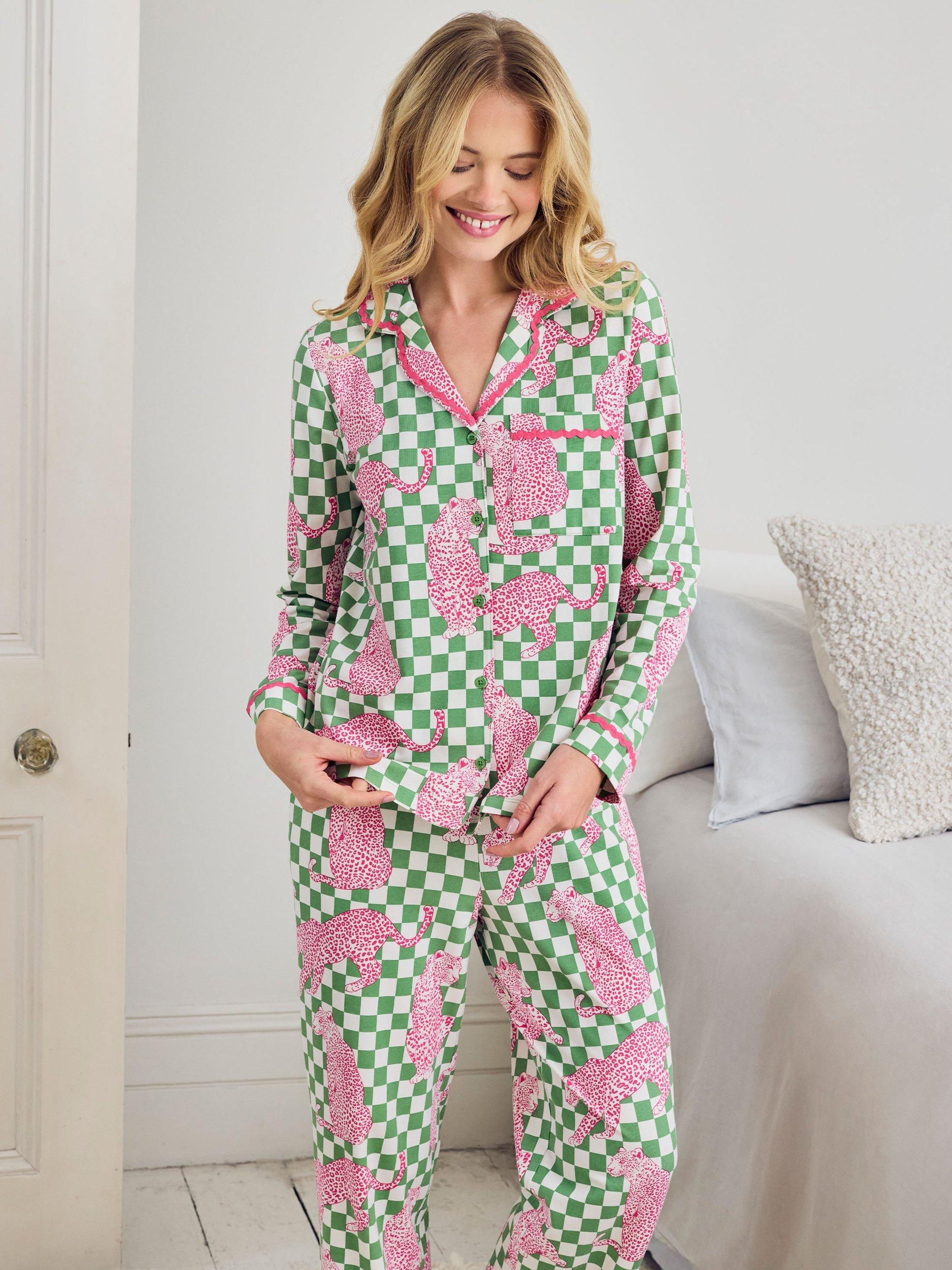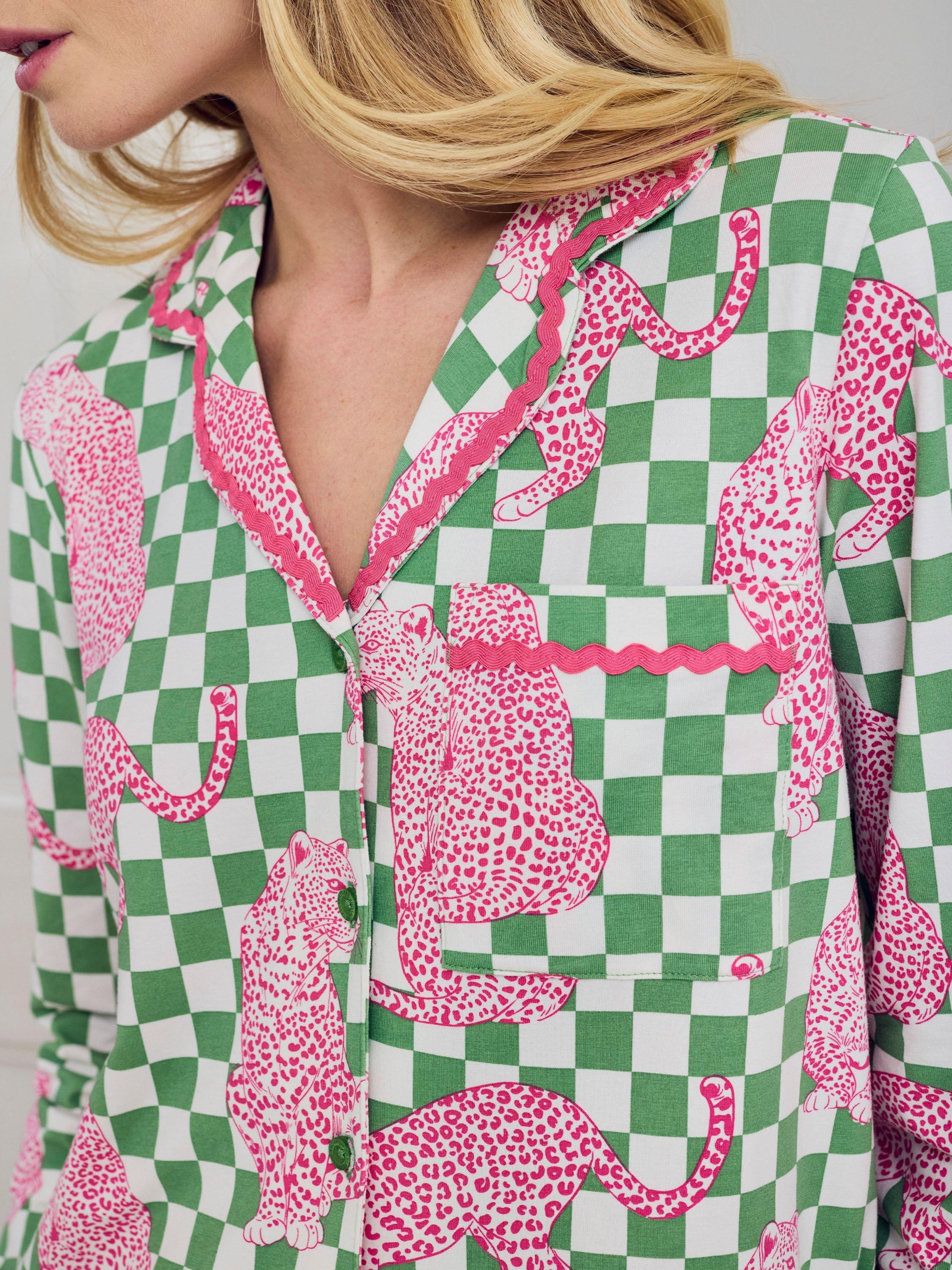 Bold print, easy comfort. This long pyjama set is made from breathable cotton jersey for a soft, laid-back feel. The Panthera Check print features a checkerboard background layered with hand-drawn leopards in a mix of walking, reclining and seated poses. Each motif stretches across the grid to create a playful contrast between structure and flow. Finished with a relaxed button-up shirt and full-length straight-leg trousers, it's a standout set for feel-good lounging, day or night.