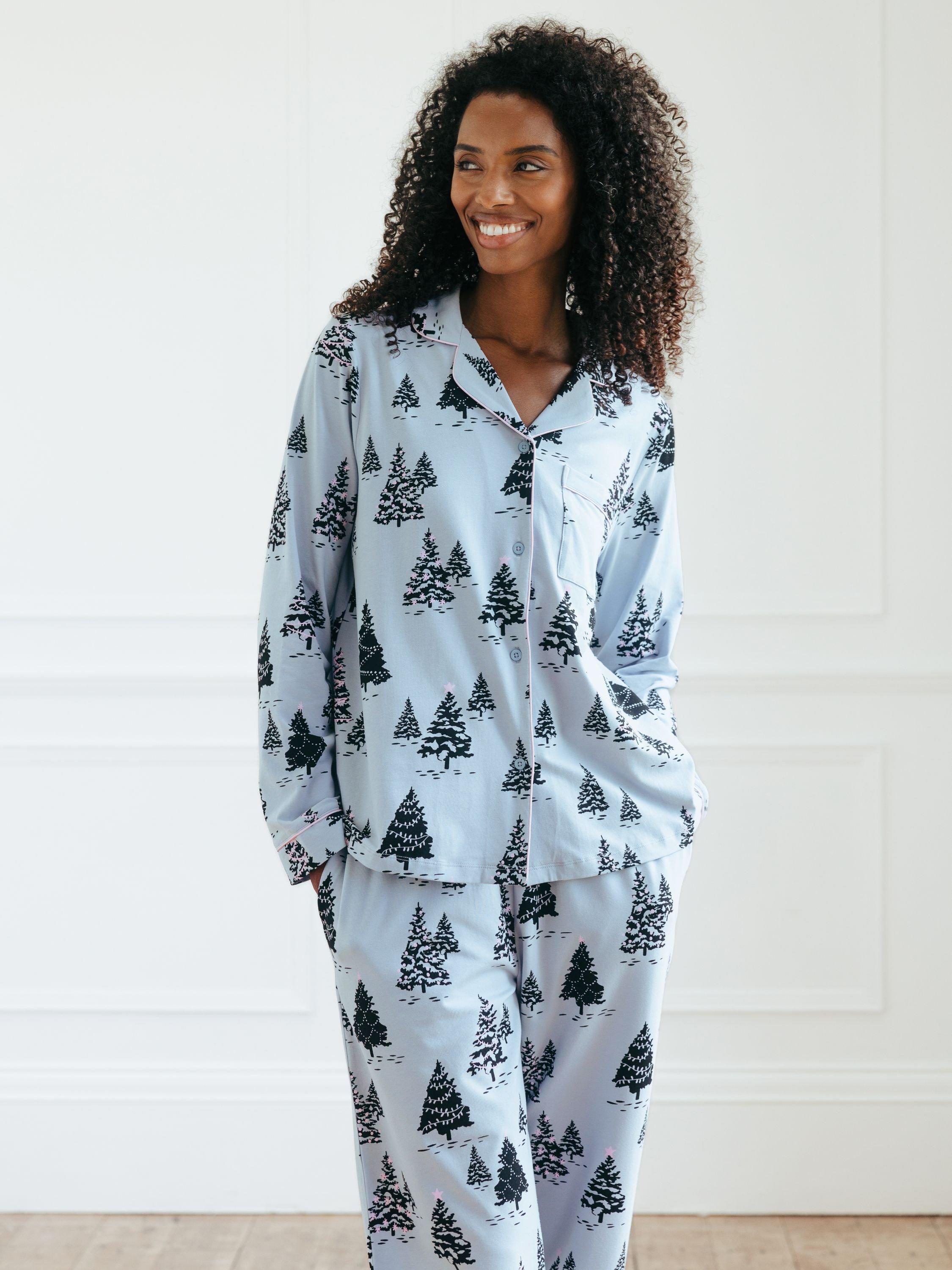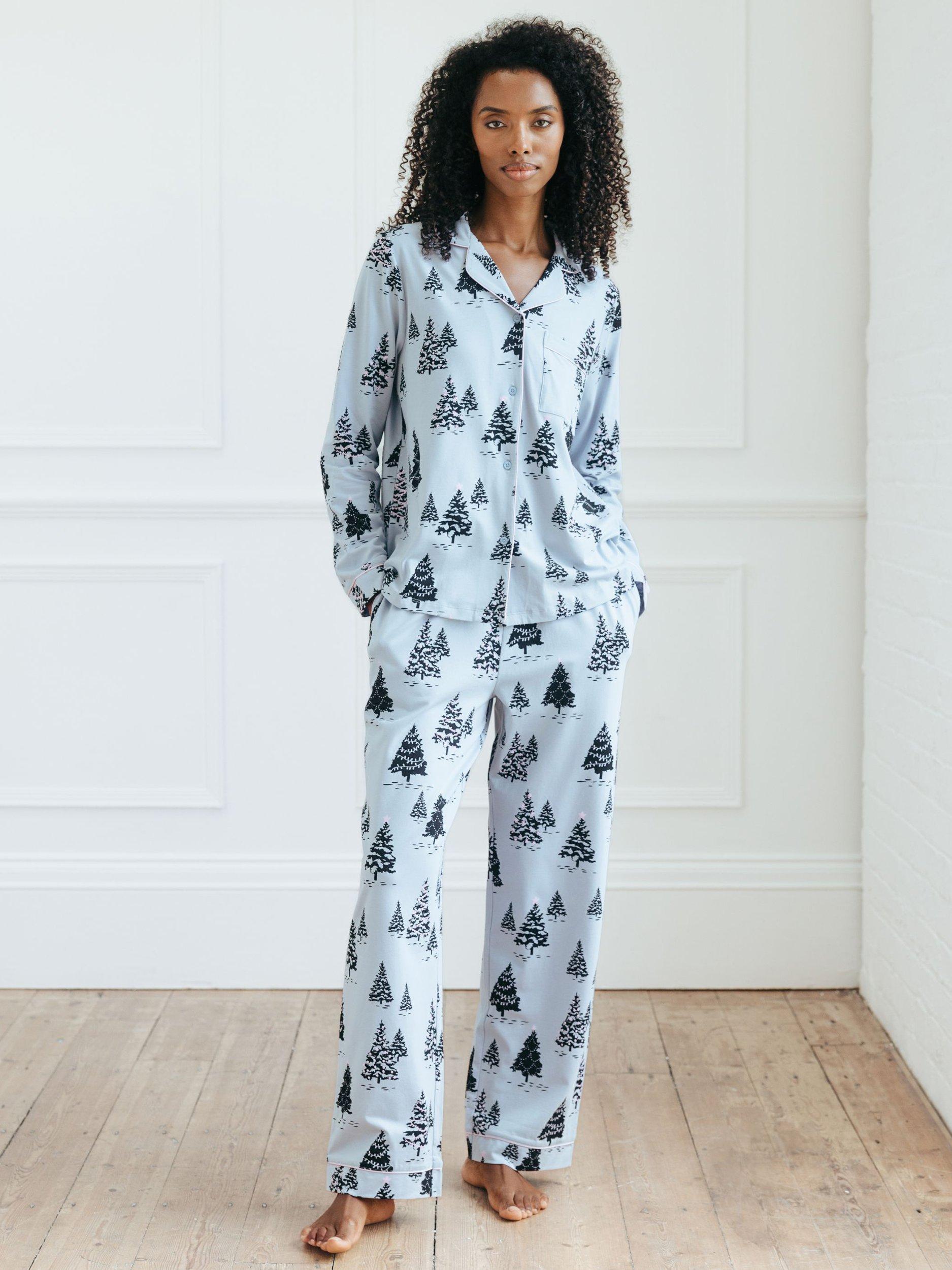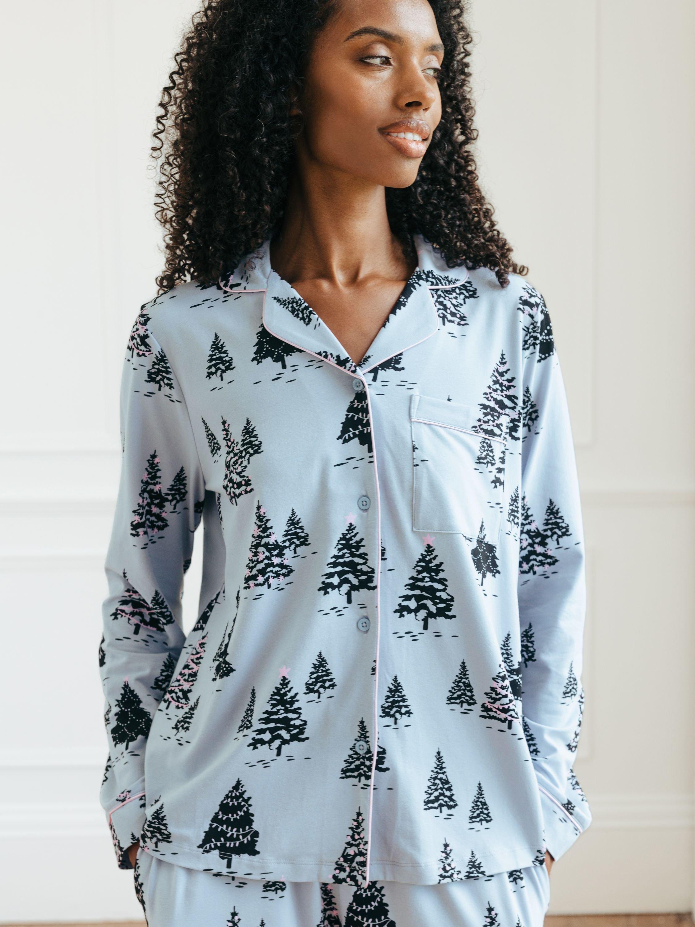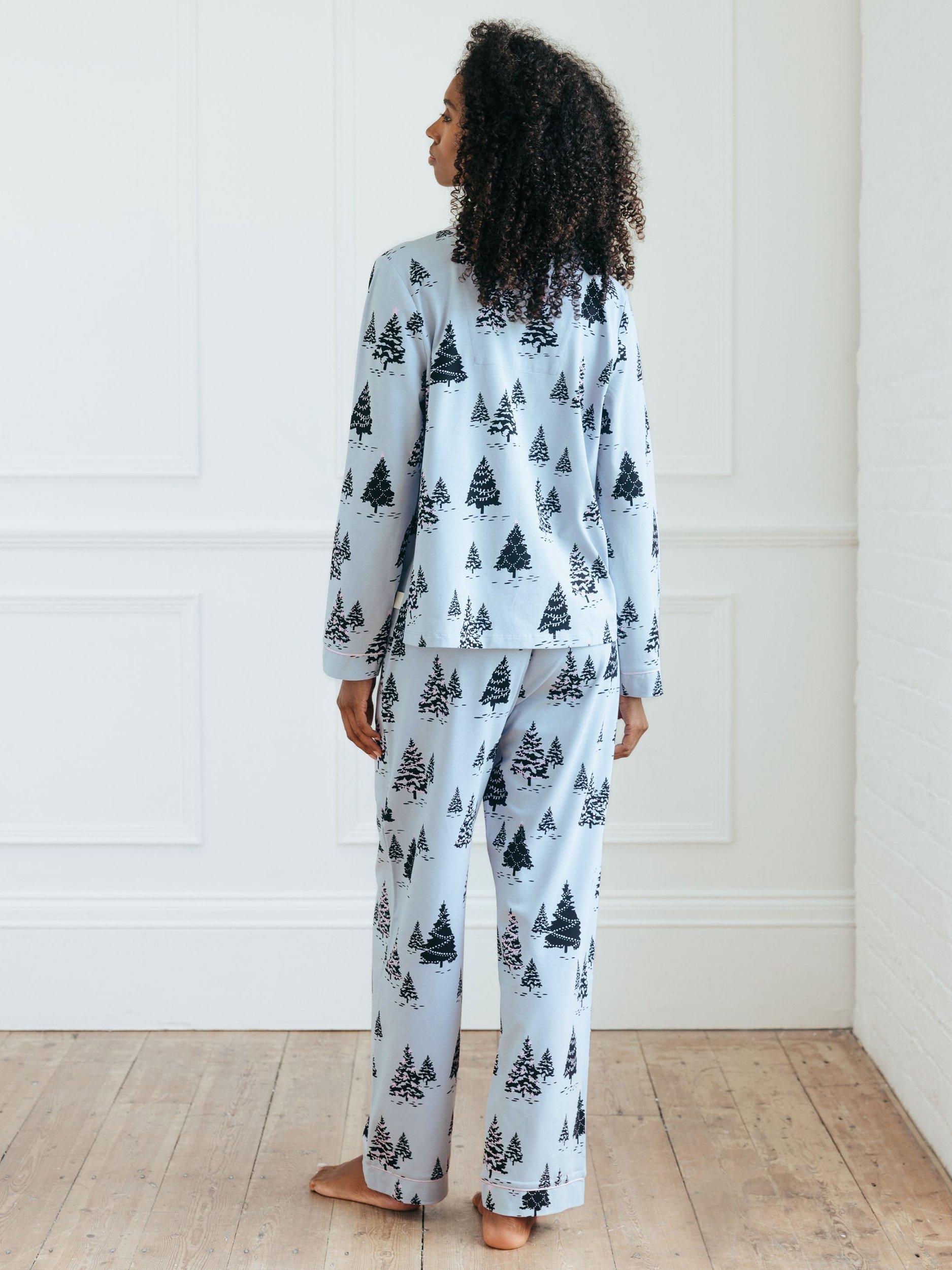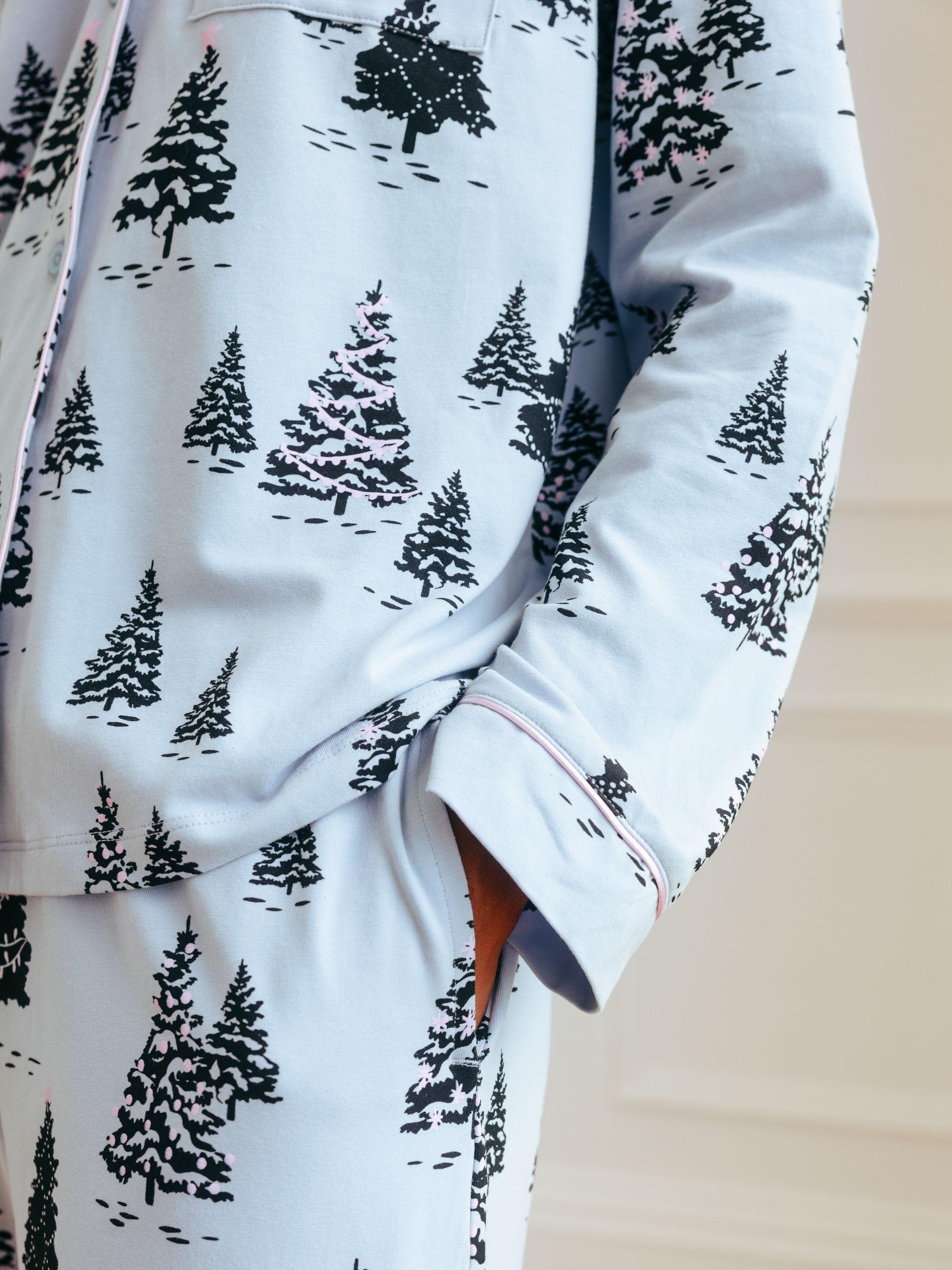 Dream of Christmas morning in this button up long pyjama set, printed with a hand-drawn design of snow-topped Christmas trees on a frosty winters day. Complete with pockets and contrast piping, these comfy pjs are made from our signature jersey knit fabric for superior comfort.