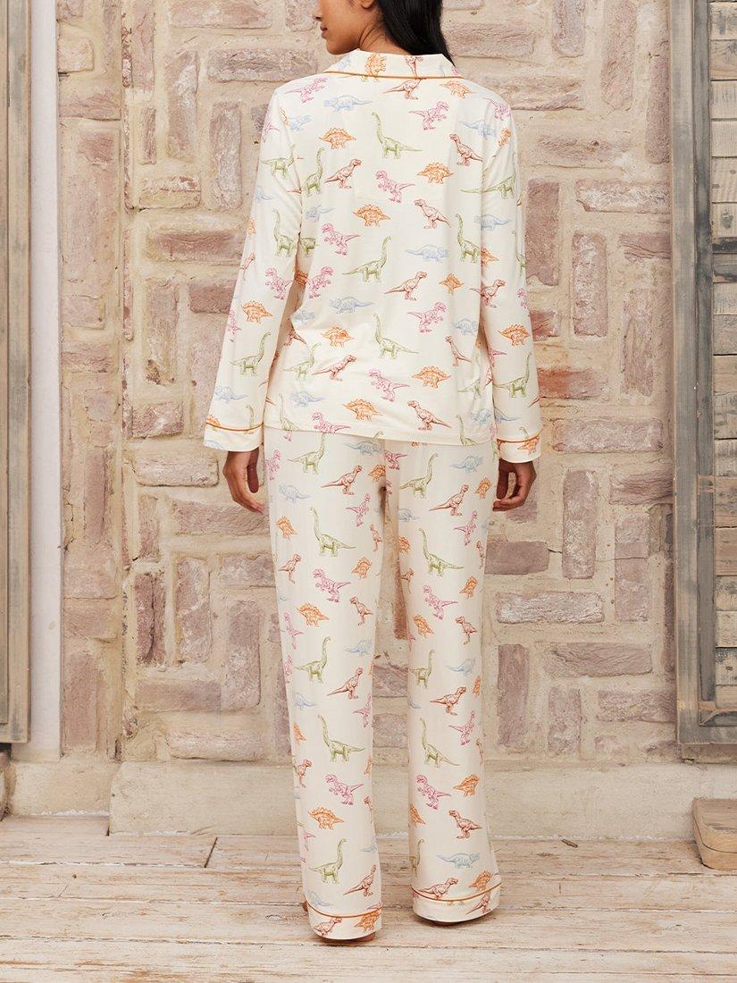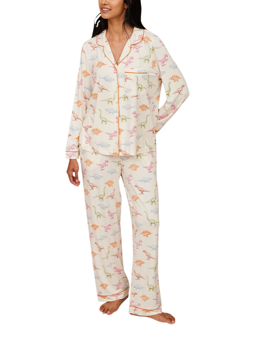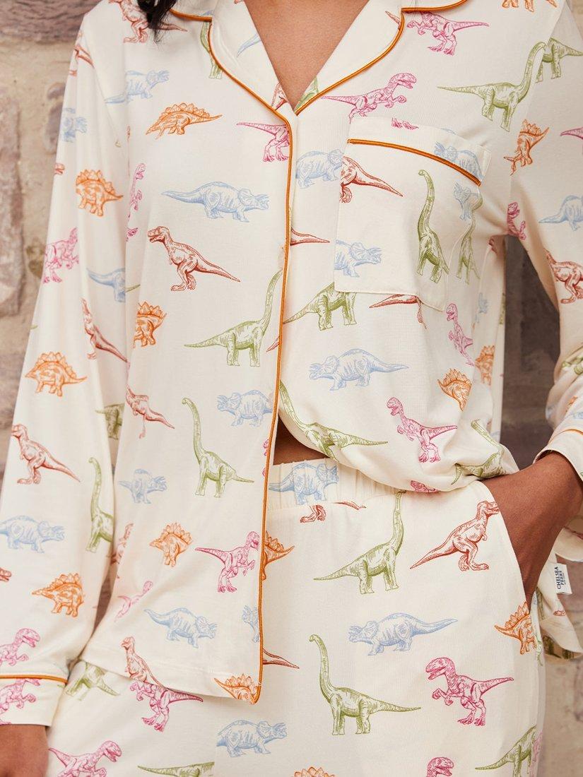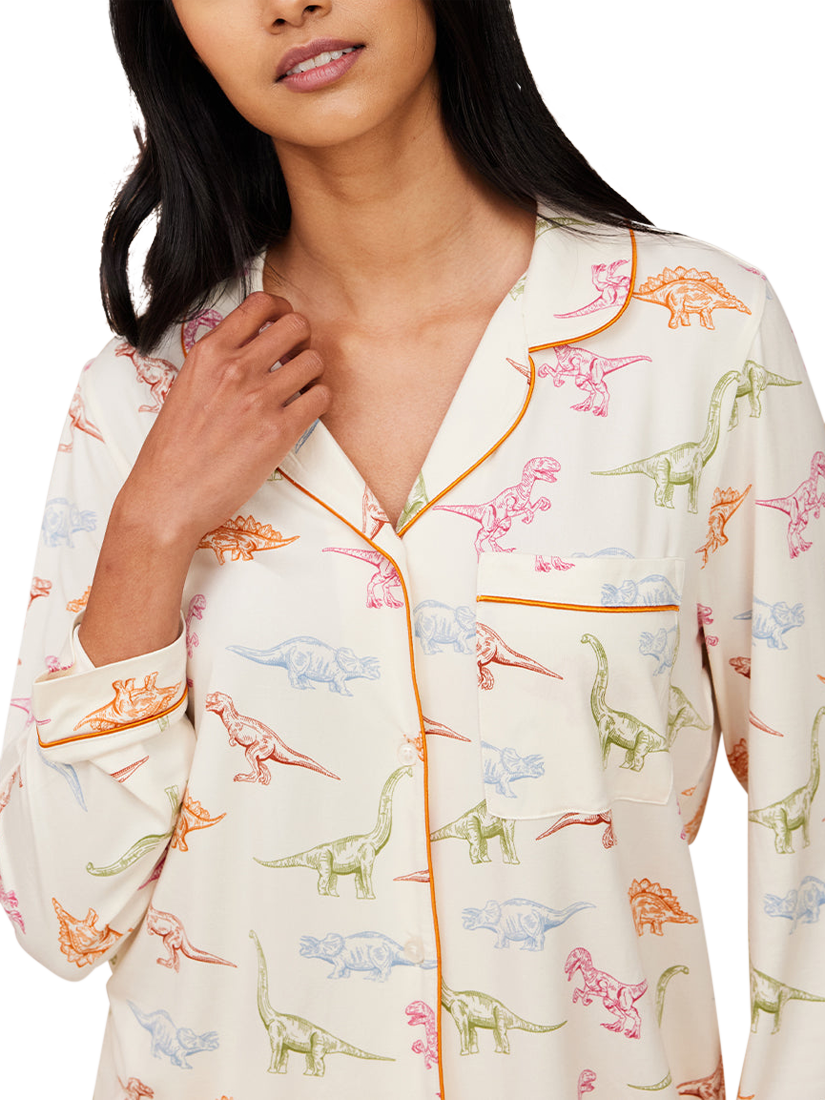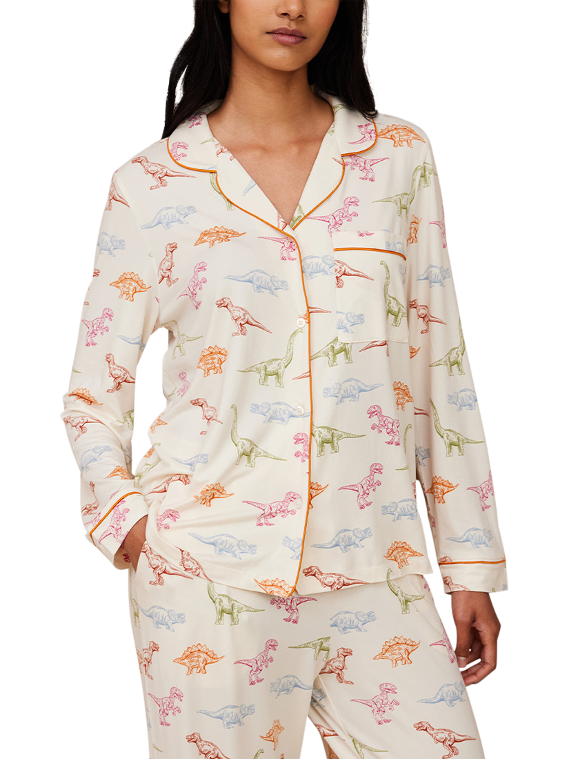 Calling all dinosaur lovers! From t-rex to triceratops, indulge in your inner palaeontologist in these soft recycled jersey short pyjamas. With a long sleeve button up shirt and matching pyjama bottoms, this easy to wear set is finished with bright contrasting piping.