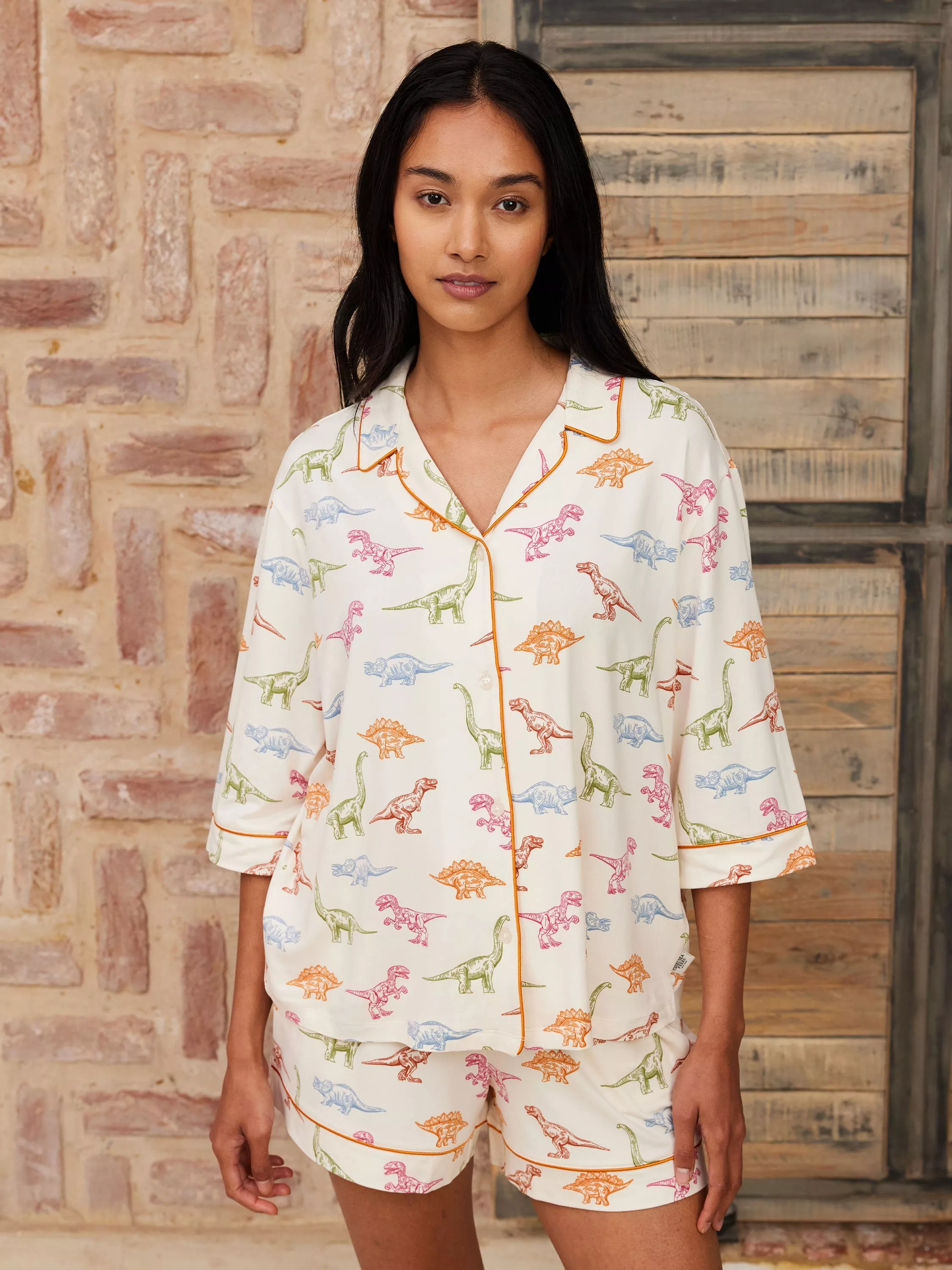 A short pyjama set with a relaxed, resort-style shirt and matching shorts that fasten with a fabric-wrapped drawcord waist. Covered with hand-drawn dinosaurs, both pieces are crafted from soft jersey.