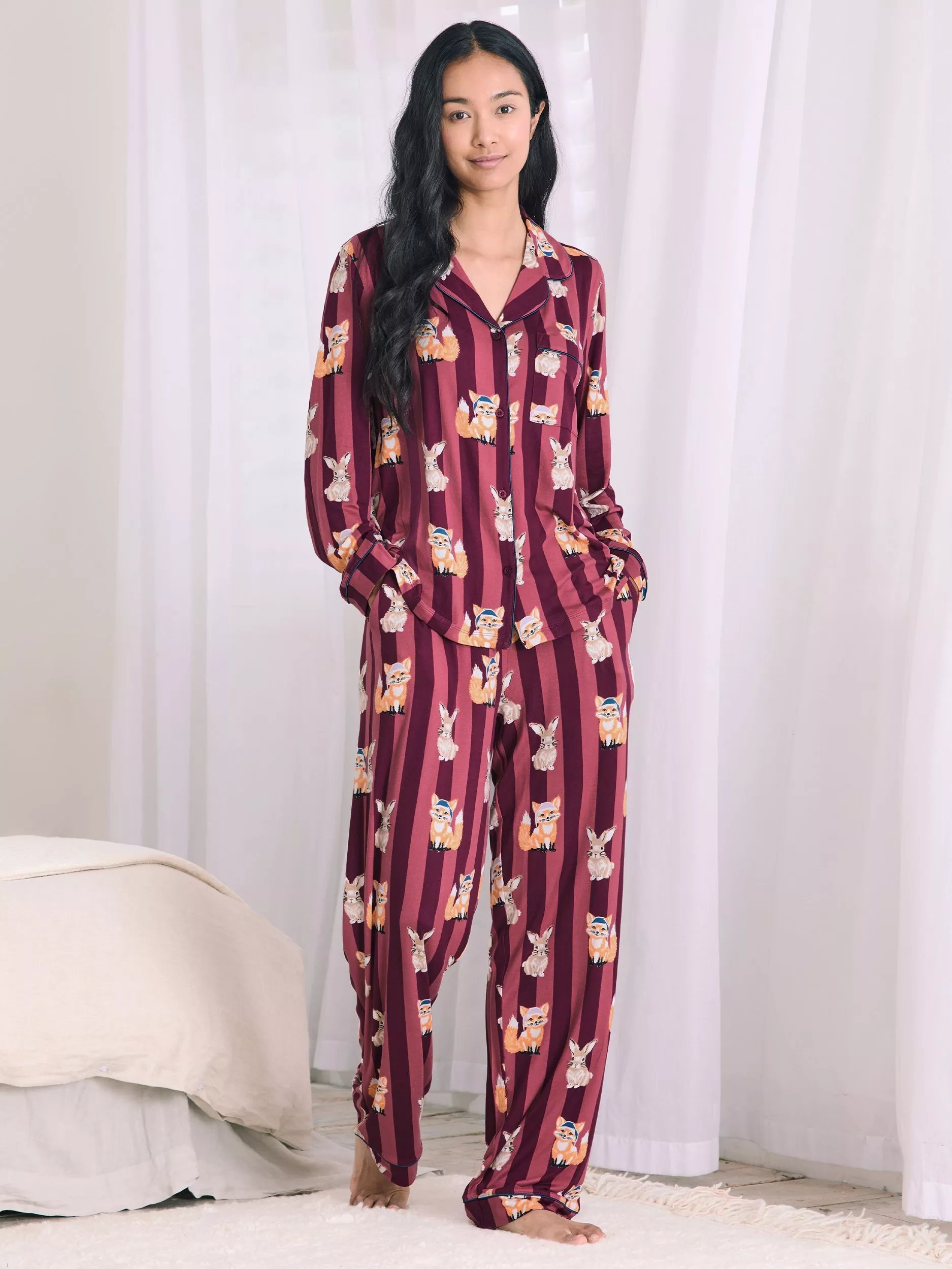 Bring a touch of woodland charm to your downtime with this playful pyjama set. Crafted from soft jersey, it's decorated with a hand-drawn print of a sweet fox cub ready for bed in a nightcap and a sleepy hare, set against bold stripes. The revere collar shirt features a button-up front, chest pocket and contrast piping for a polished edge, while the full-length bottoms are finished with an elasticated waistband and handy side pockets for everyday comfort. Cosy, characterful and endlessly fun, it's nightwear designed to keep you smiling from bedtime to lazy mornings.