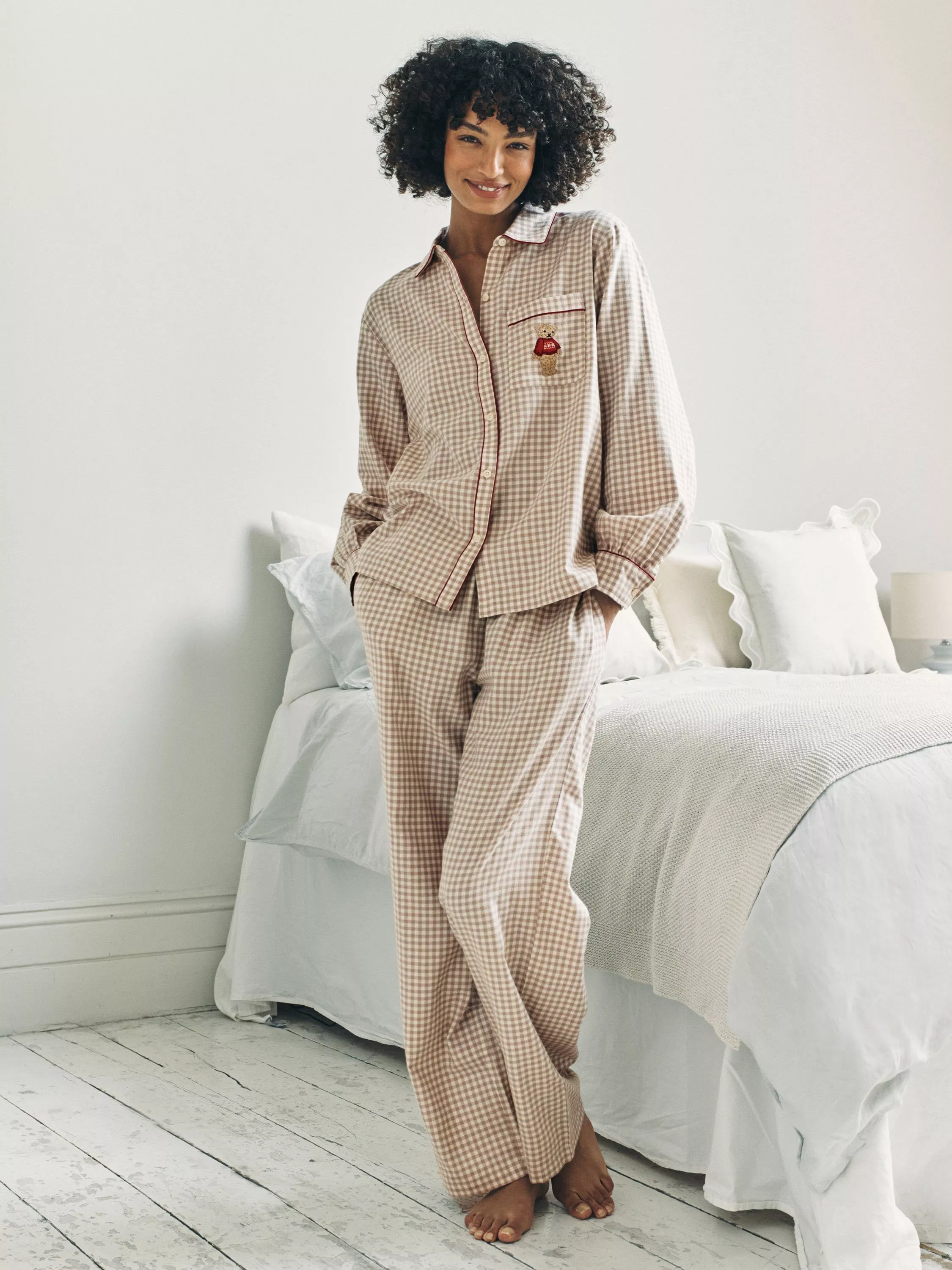 Celebrate the season in this gingham pyjama set, embroidered with Chelsea Peers' cockapoo dog Chip enjoying his own winter ski trip. Made from 100% cotton, the revere collar shirt and elasticated bottoms are finished with contrast piping for a polished seasonal look. Comfortable, breathable and endlessly giftable, it’s the perfect set for festive nights in and Christmas mornings alike. Classic neutrals meet festive flair.