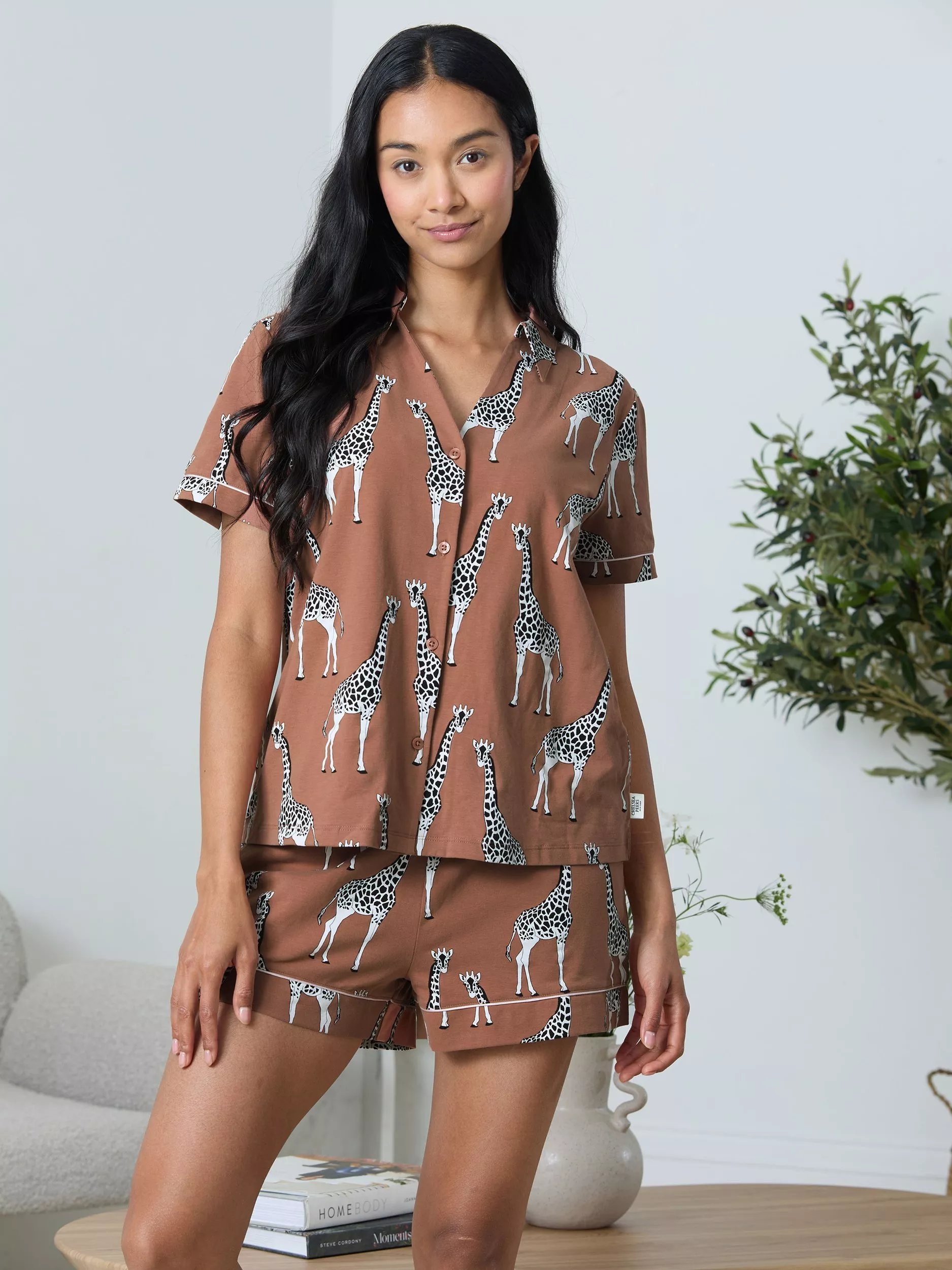 Stretch out and unwind in these adorable giraffe print pyjamas. This unique pyjama set is crafted in soft, organic cotton for comfort all night long. It comes with a loose and airy button-through shirt and matching shorts with the Chelsea Peers customary stretch waistband.