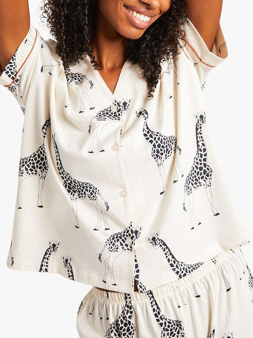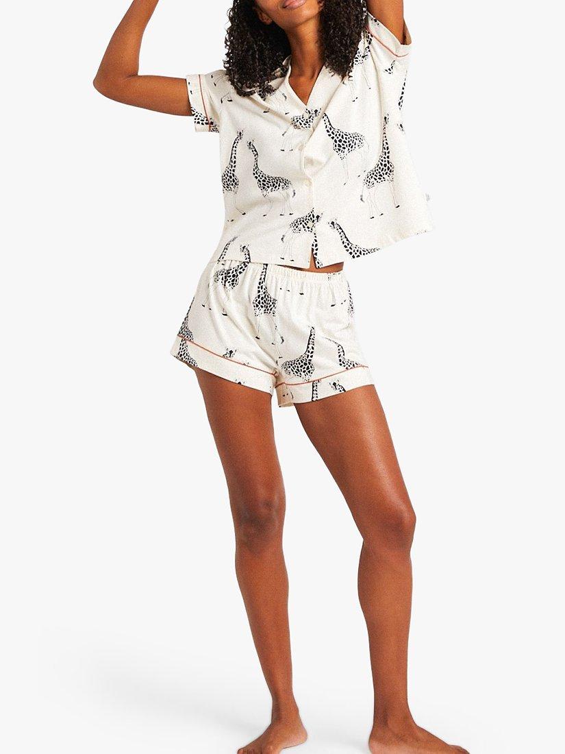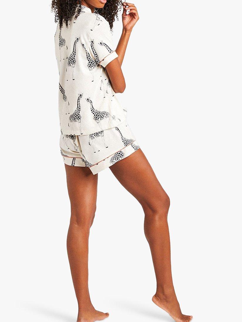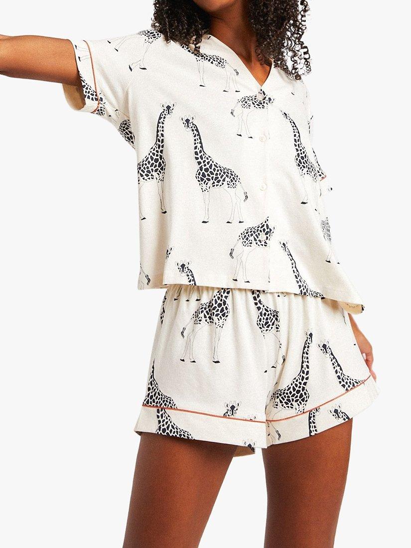 Stretch out and unwind in these adorable giraffe print pyjamas. This unique pyjama set is crafted in soft, organic cotton for comfort all night long. It comes with a loose and airy button-through shirt and matching shorts with the Chelsea Peers customary stretch waistband.